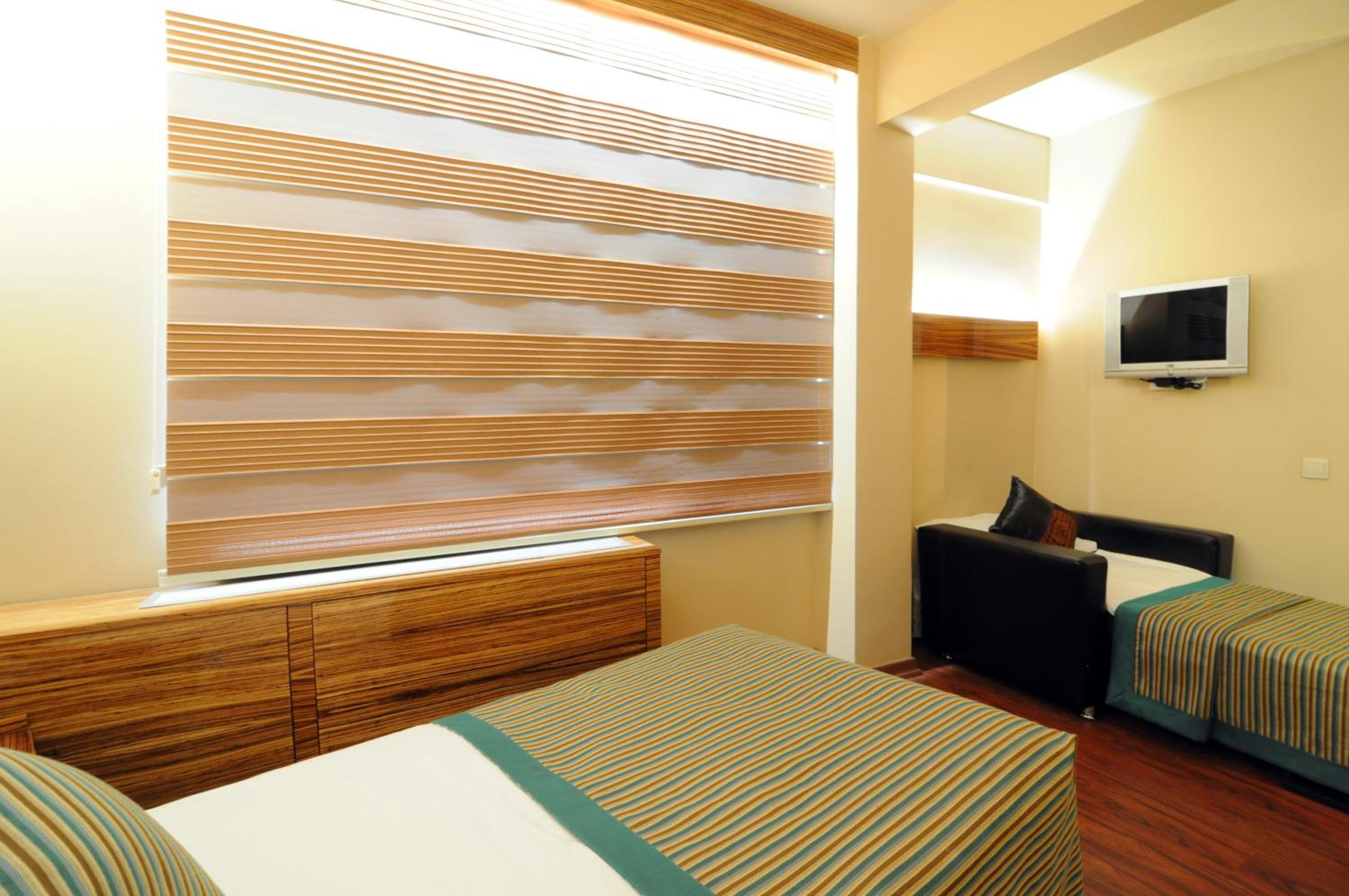 The recently renovated rooms at Hotel Büyük Keban boast airy spaces, wooden floors, and modern amenities including a flat-screen TV and cozy seating area.