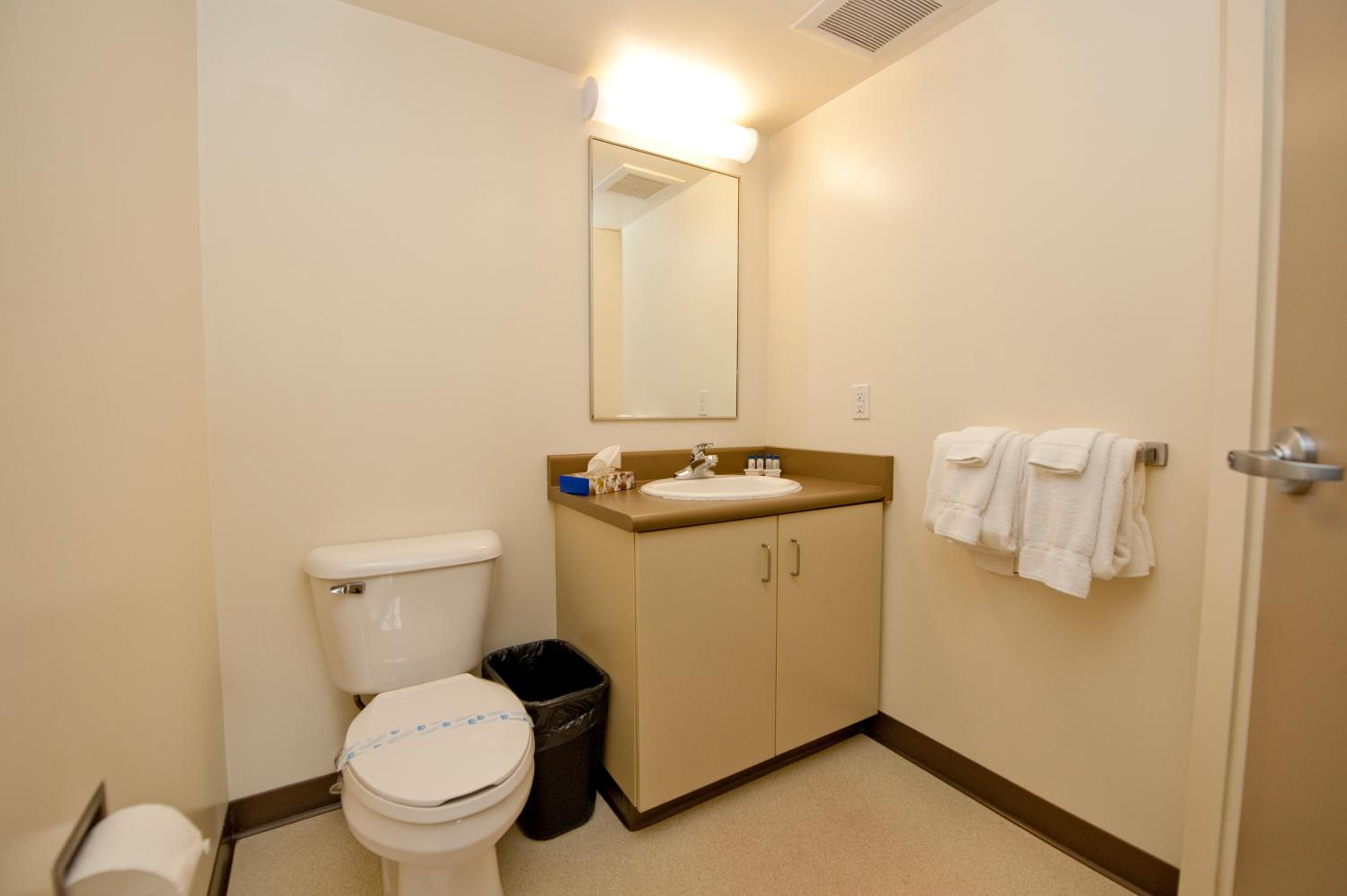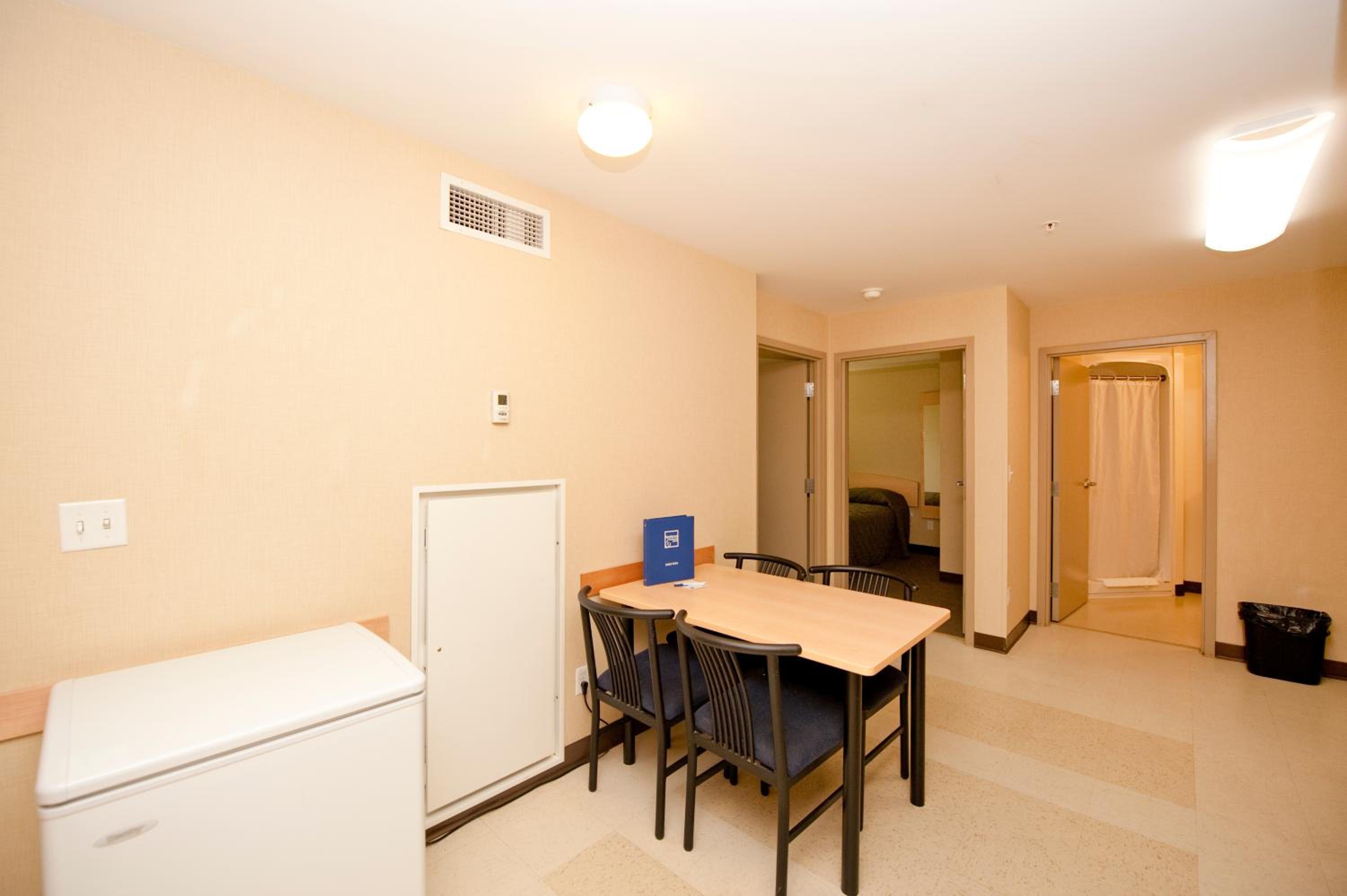 Comfortable Suites with Amenities: Each suite includes free toiletries, a work desk, a full-sized fridge, and a microwave for your convenience.