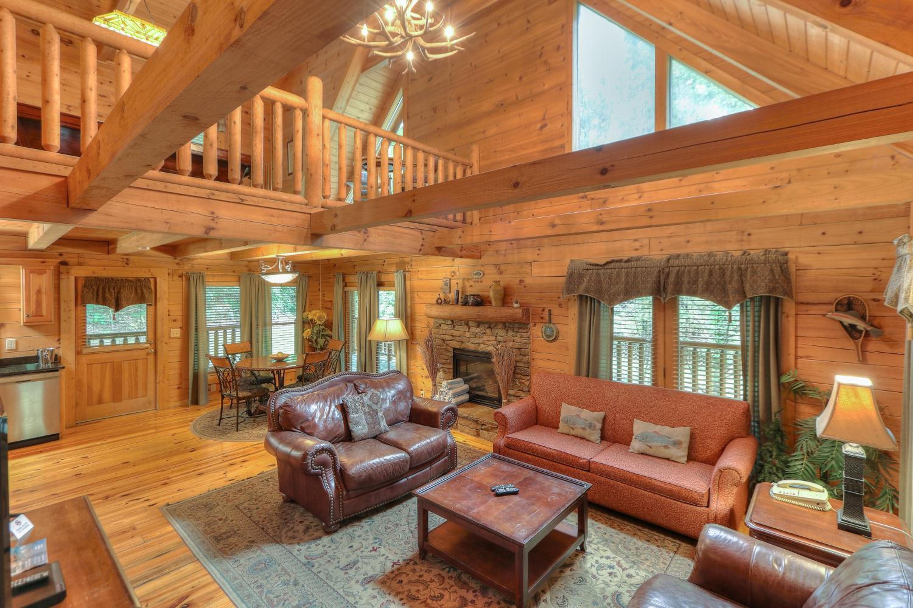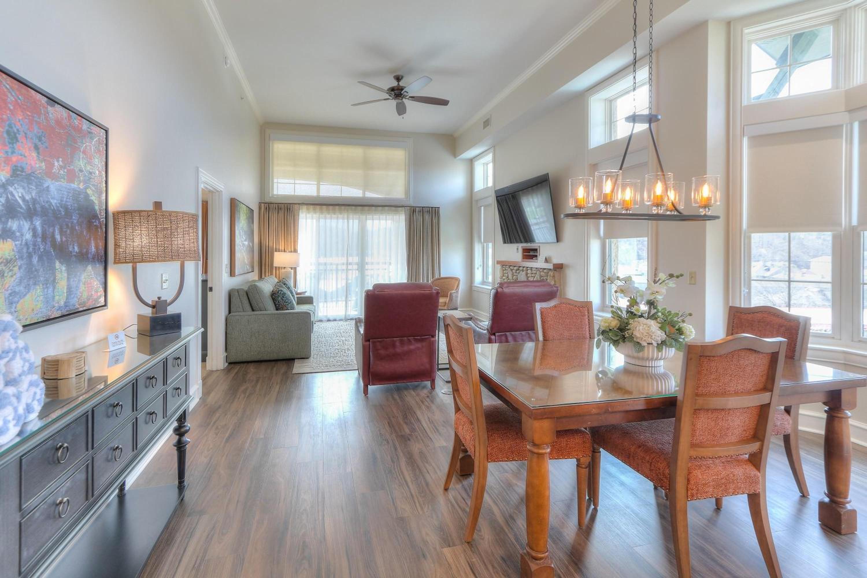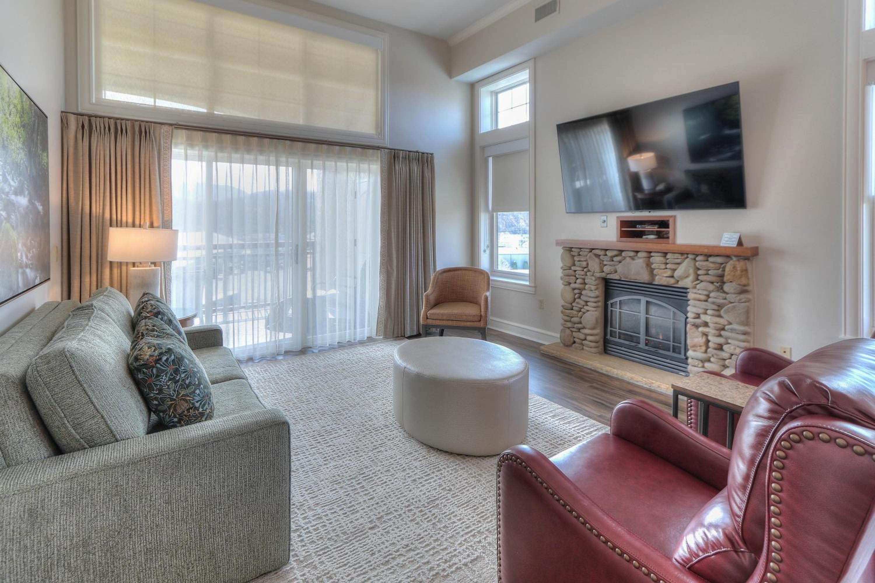 Indulge in a spa bath, cozy up by the gas fireplace, and enjoy the scenic views from your private balcony at RiverStone Condo Resort & Spa.