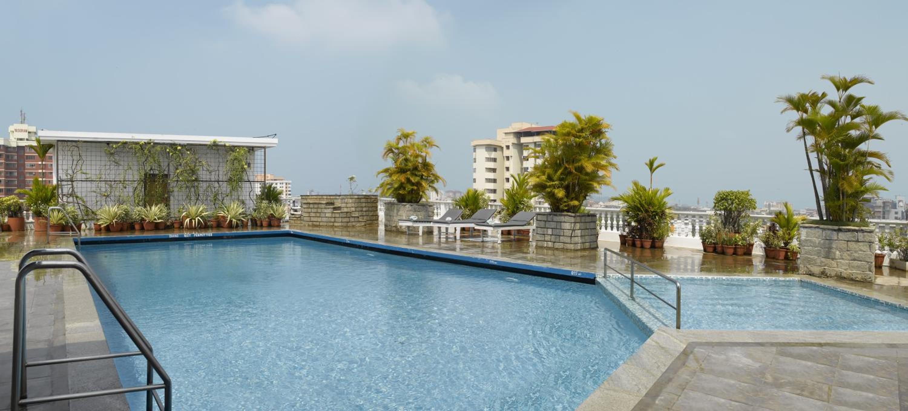 Enjoy a relaxing stay at Hotel Abad Plaza with a rooftop pool offering stunning views of downtown Cochin. The elegant rooms, featuring classic wood furnishings, ensure a comfortable experience with modern amenities like satellite TV and a fridge.