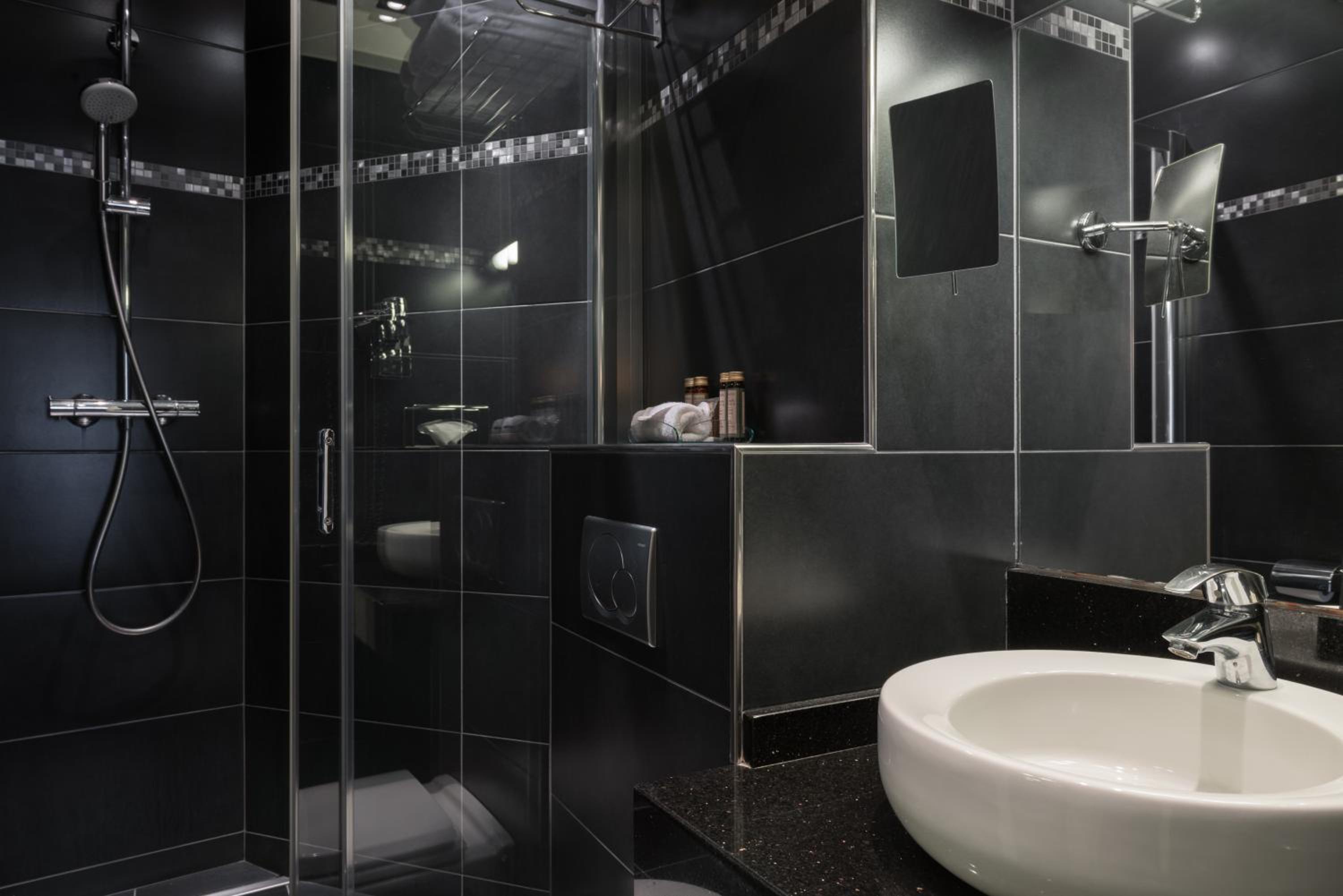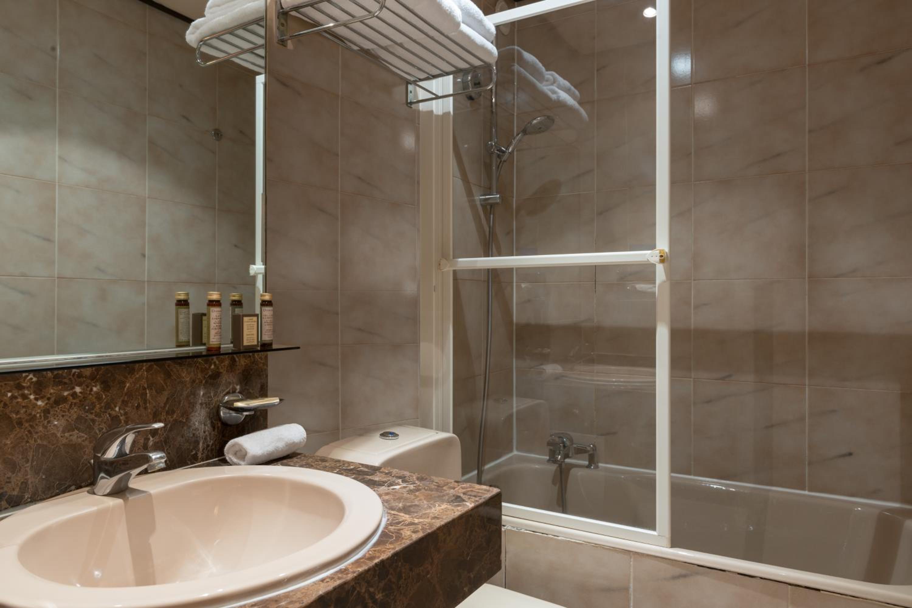 Each guest room at Neuilly Park Hotel features a flat-screen TV and a private marble bathroom with modern amenities. The cozy rooms provide a relaxing retreat after a day of sightseeing in Paris.