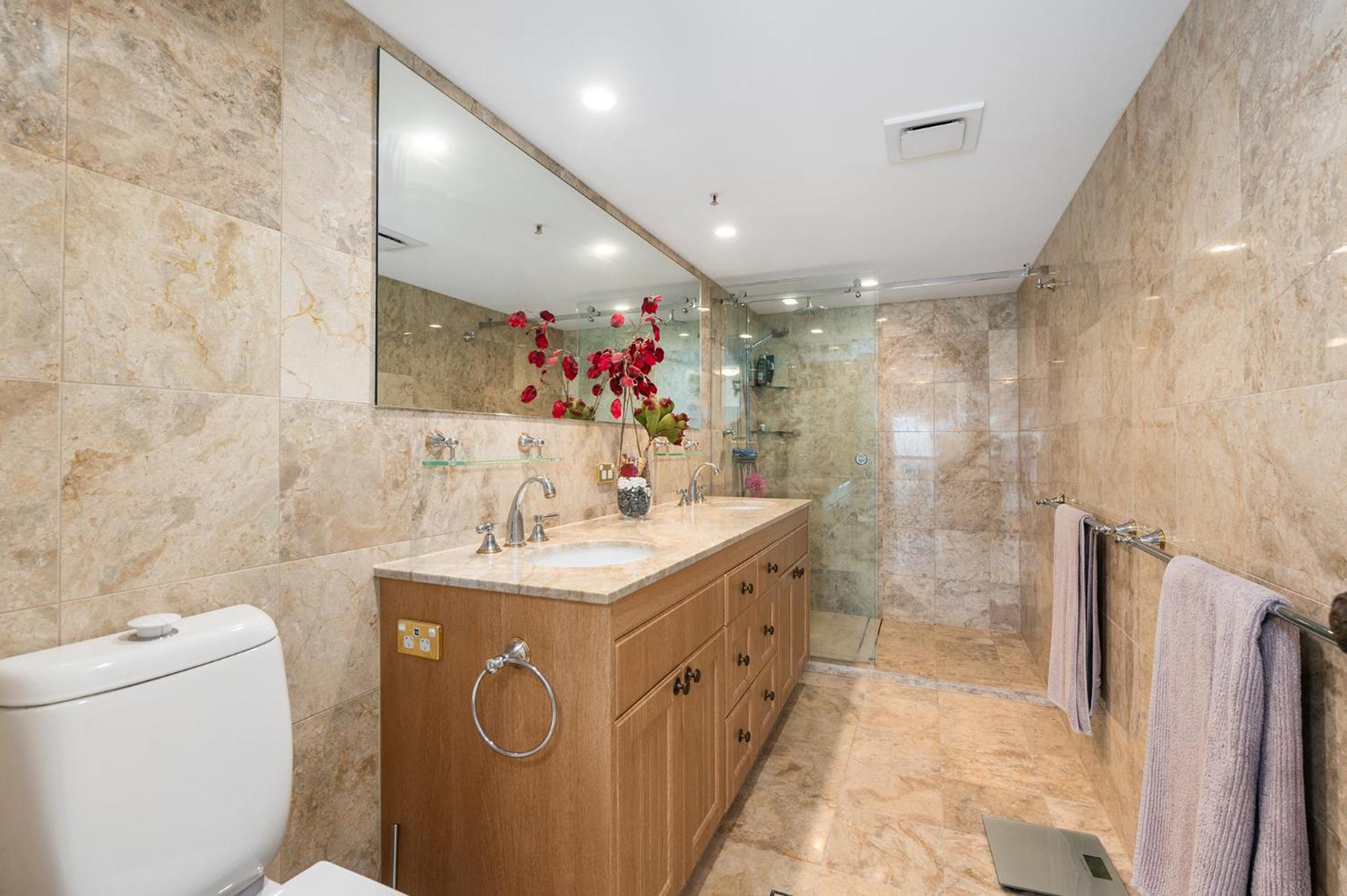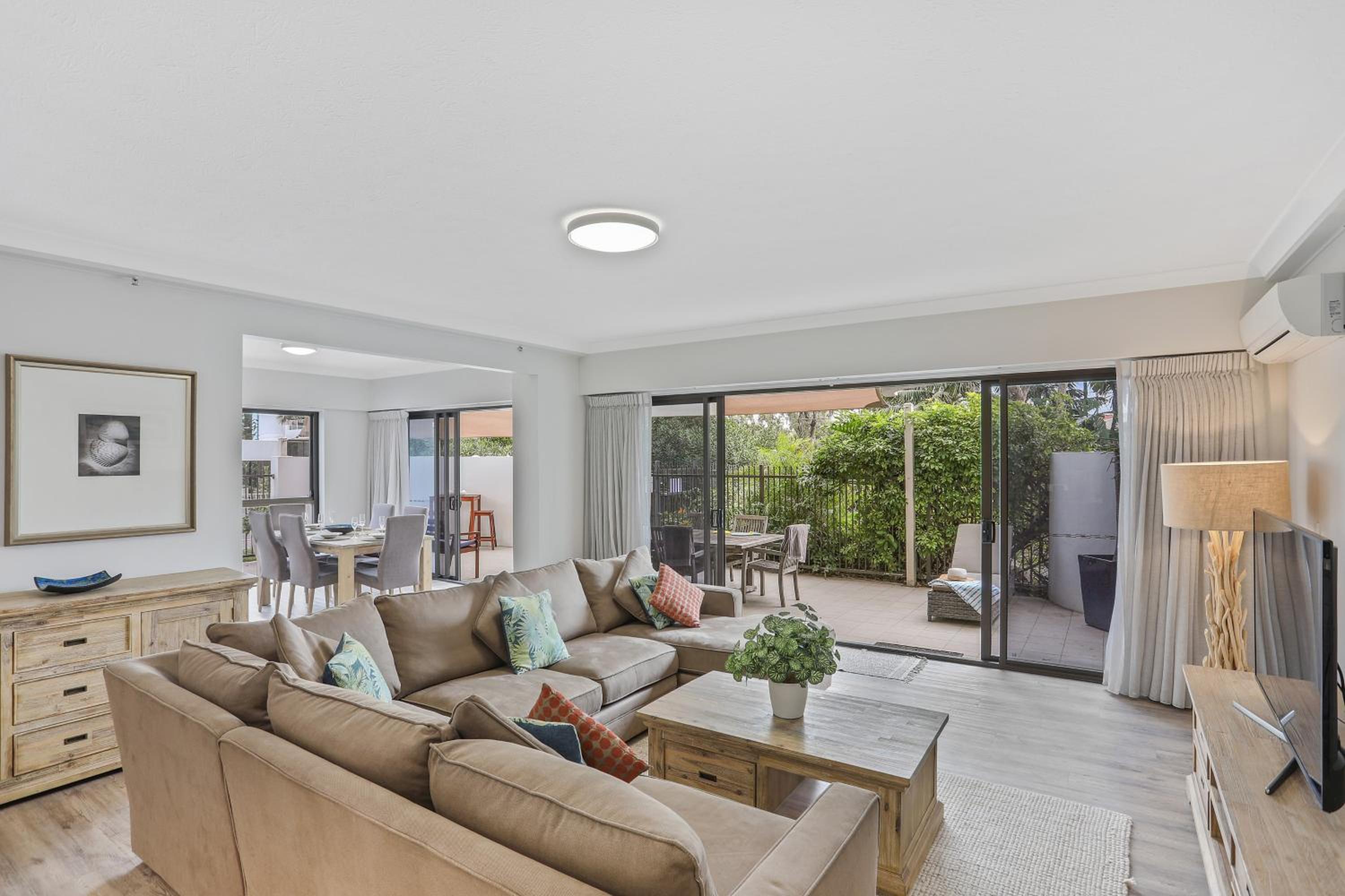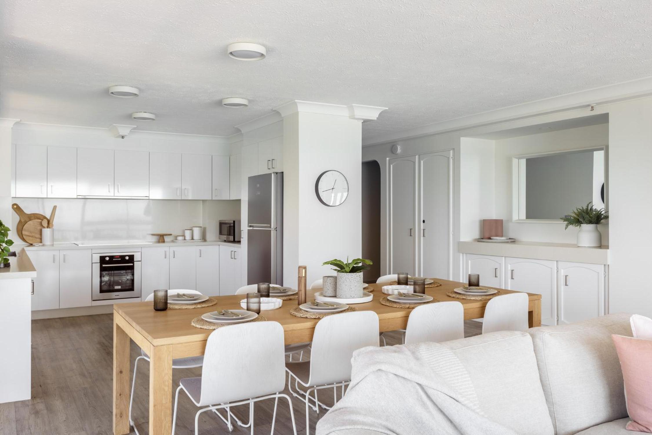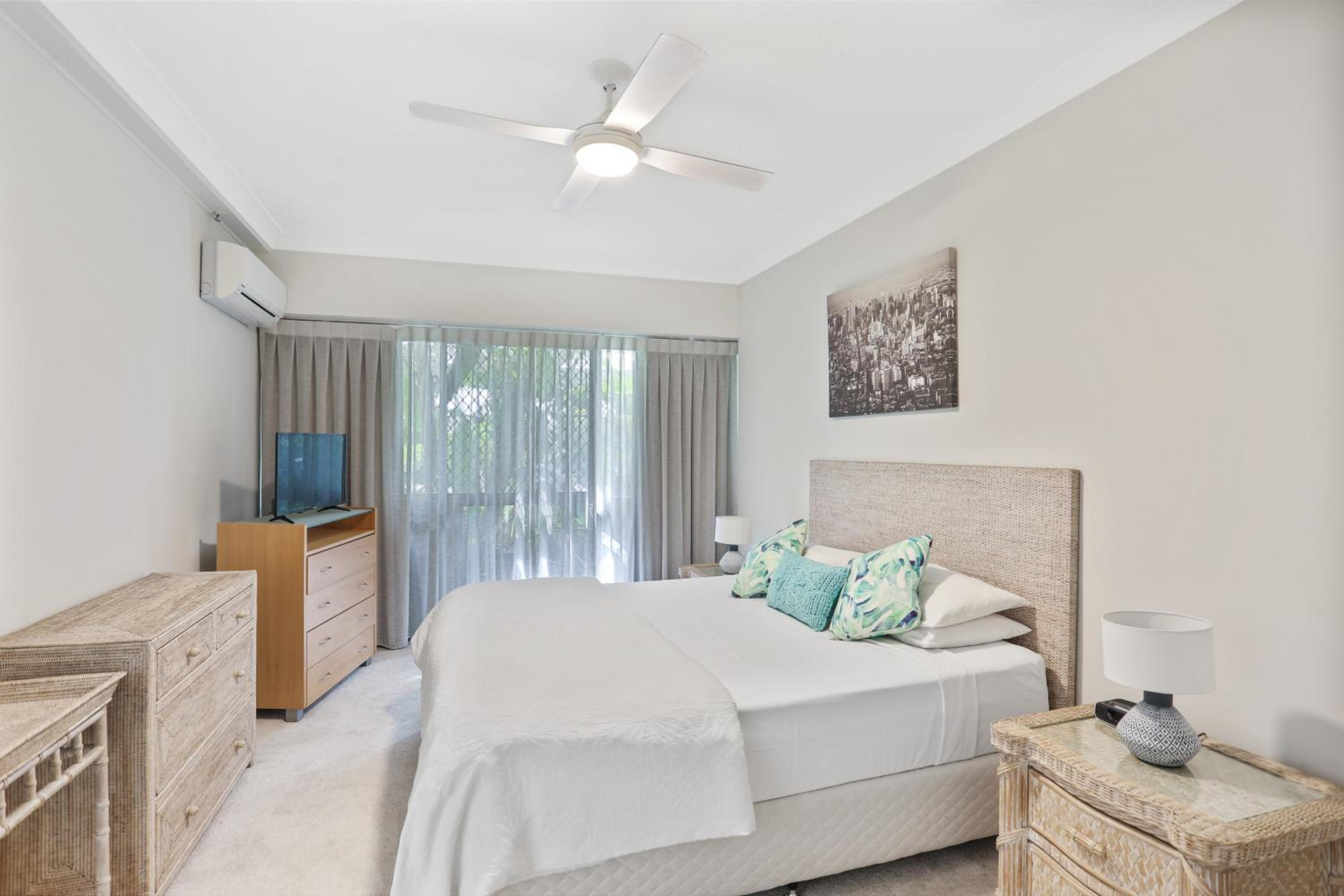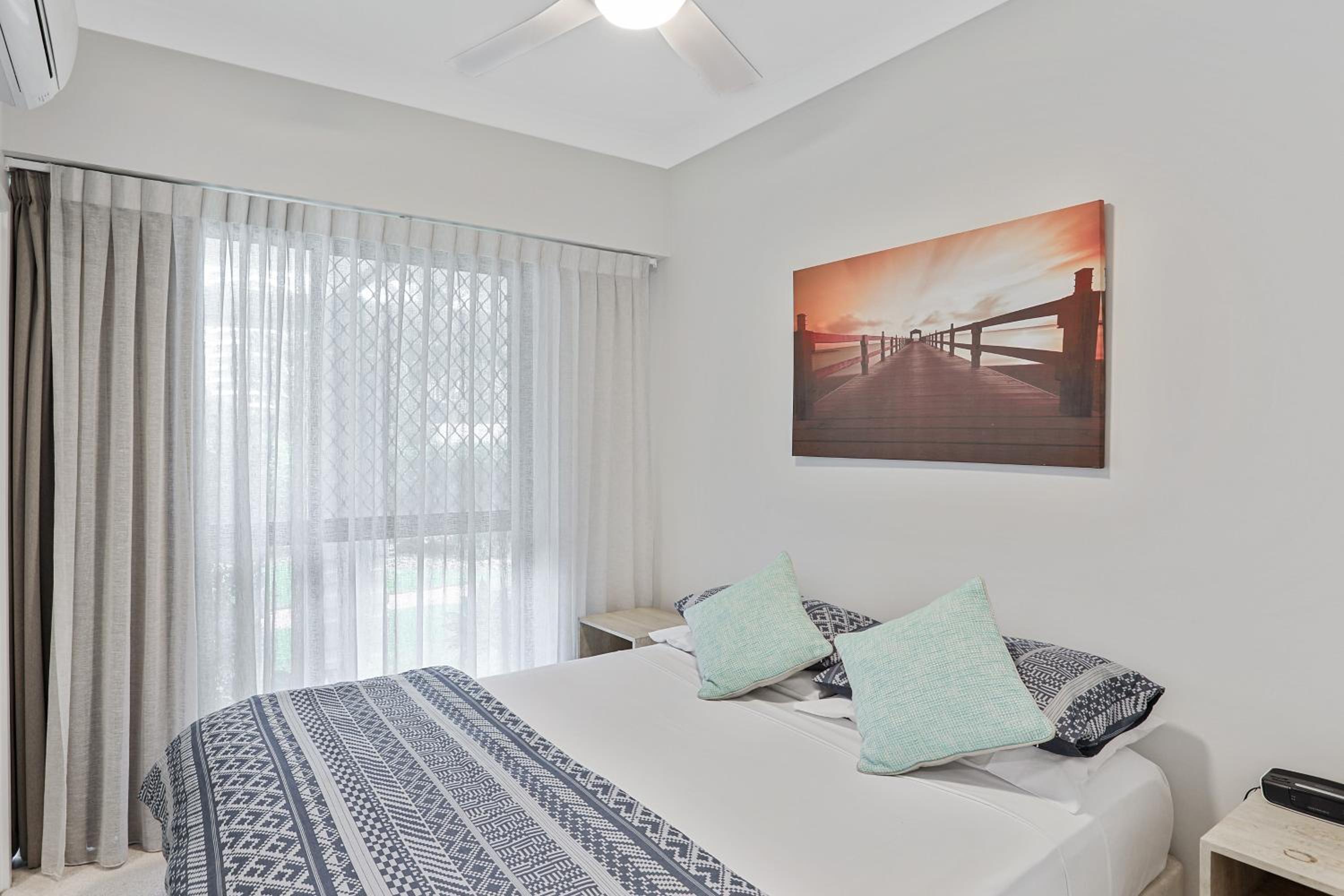 The unit we stayed in was quite dated furnishing wise. Bathrooms were lovely except for paint peeling off the ceiling which looked like water damage. Also there were missing light globes so you needed to shower in the dark. There was no matching crockery and not enough of everything for those staying. There was only split system air conditioning so bedrooms 2 and 3 were very hot.