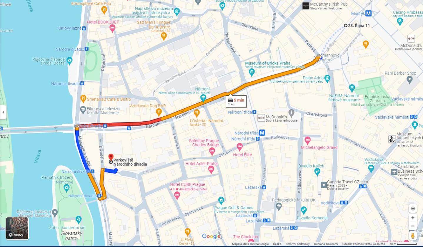 Vynikajúca lokalita,reprezentqčná pešia zona, veľmi blízko metro, električka, mnohé historické pamiatky, ja som potrebovala byť v blízkosti Divadla bez zábradlí - bolo to úžasné - peši cca 3 minúty.