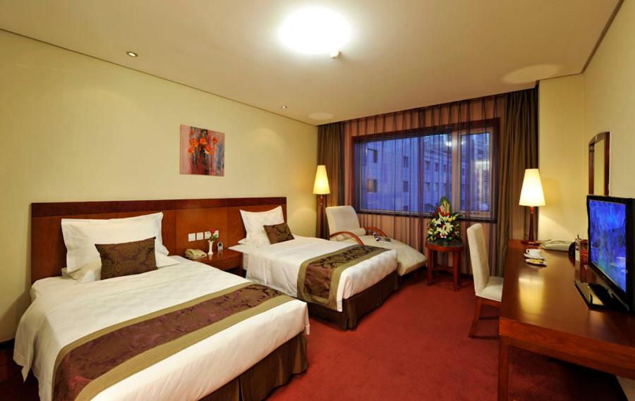 The room is big with two beds and a window to view Beijing City. It equips furniture and devices the same as a regular American hotel. The property locates outside Shilihe Station of Beijing Subway Line 10, which is convenient for travelers to go around Beijing City.