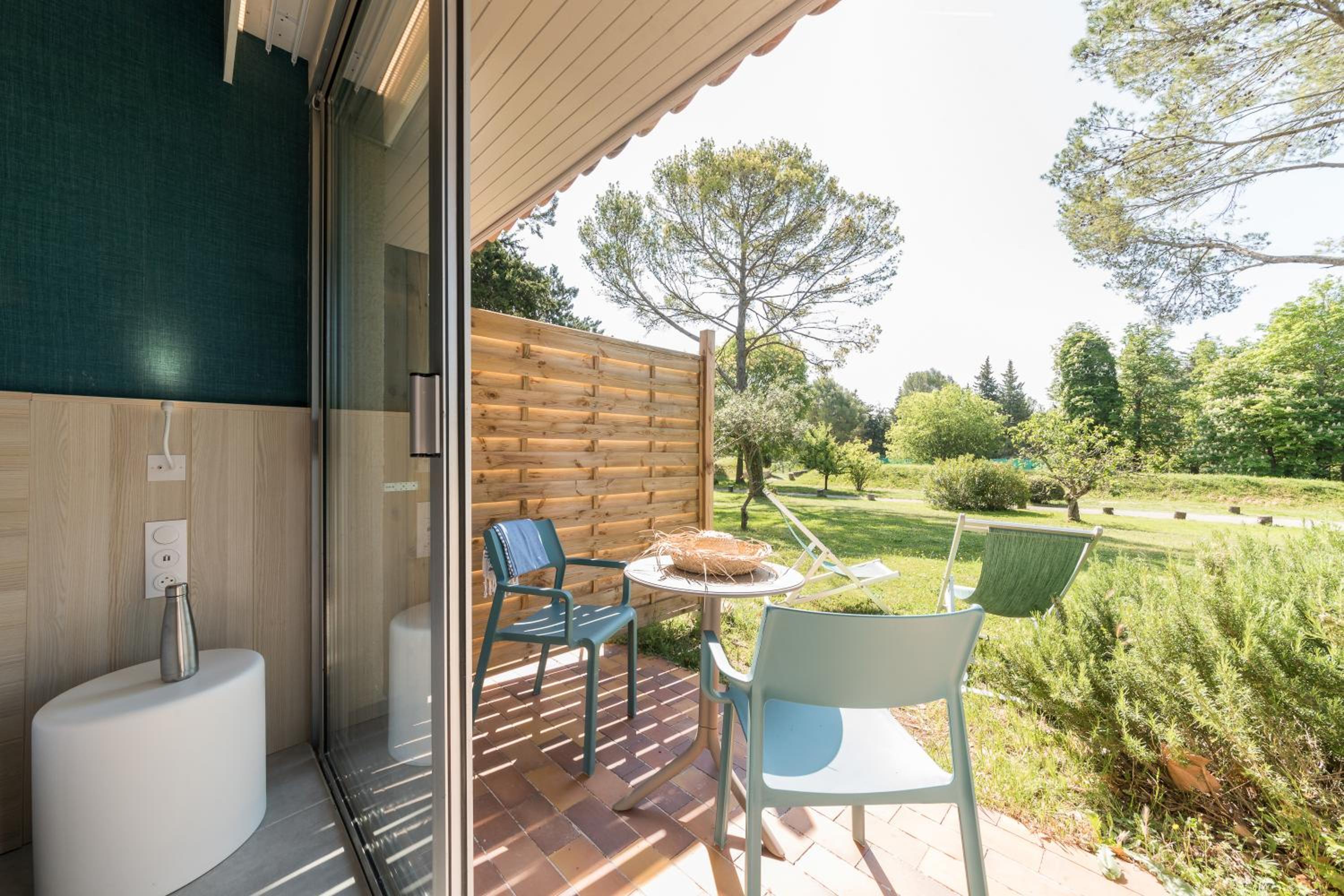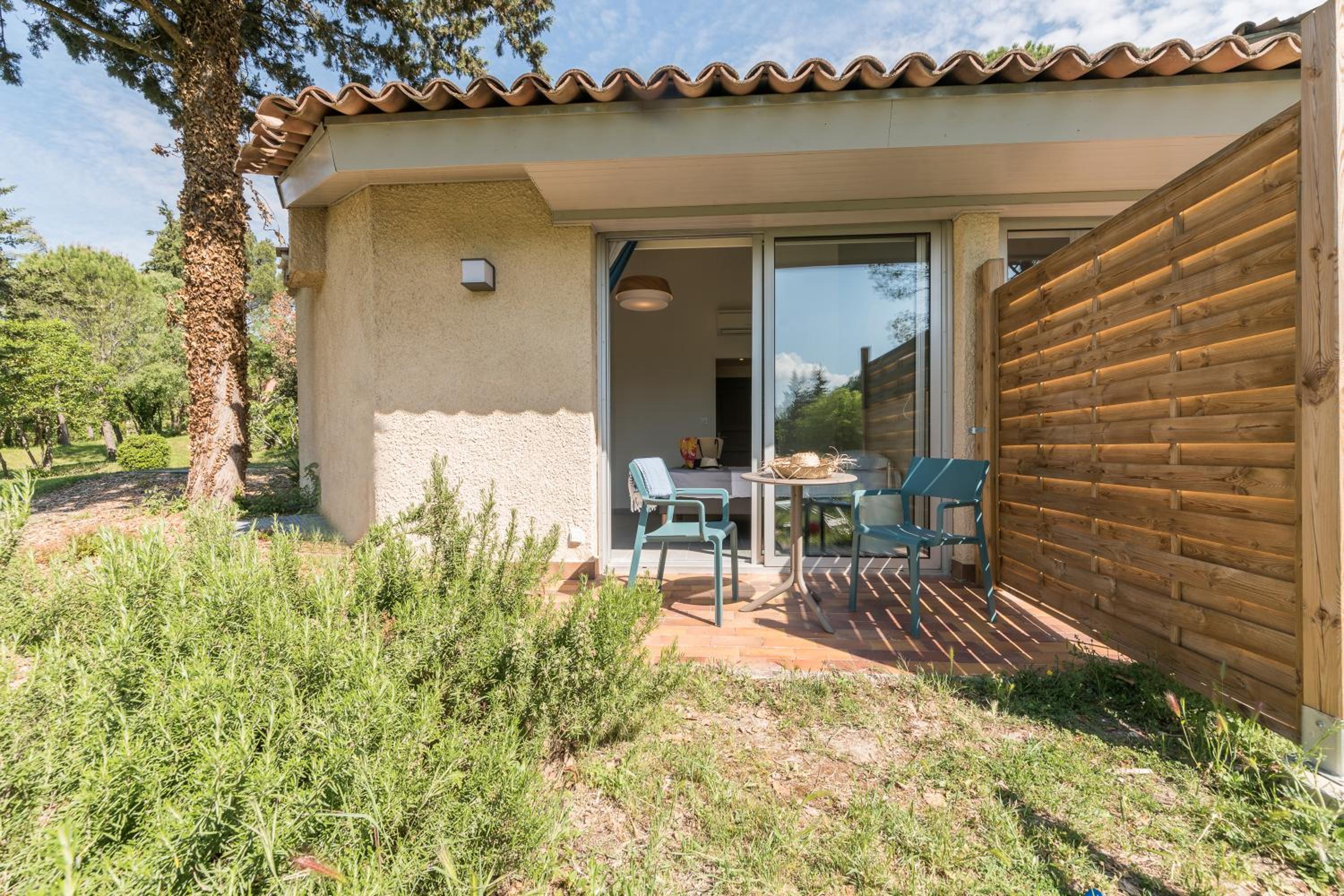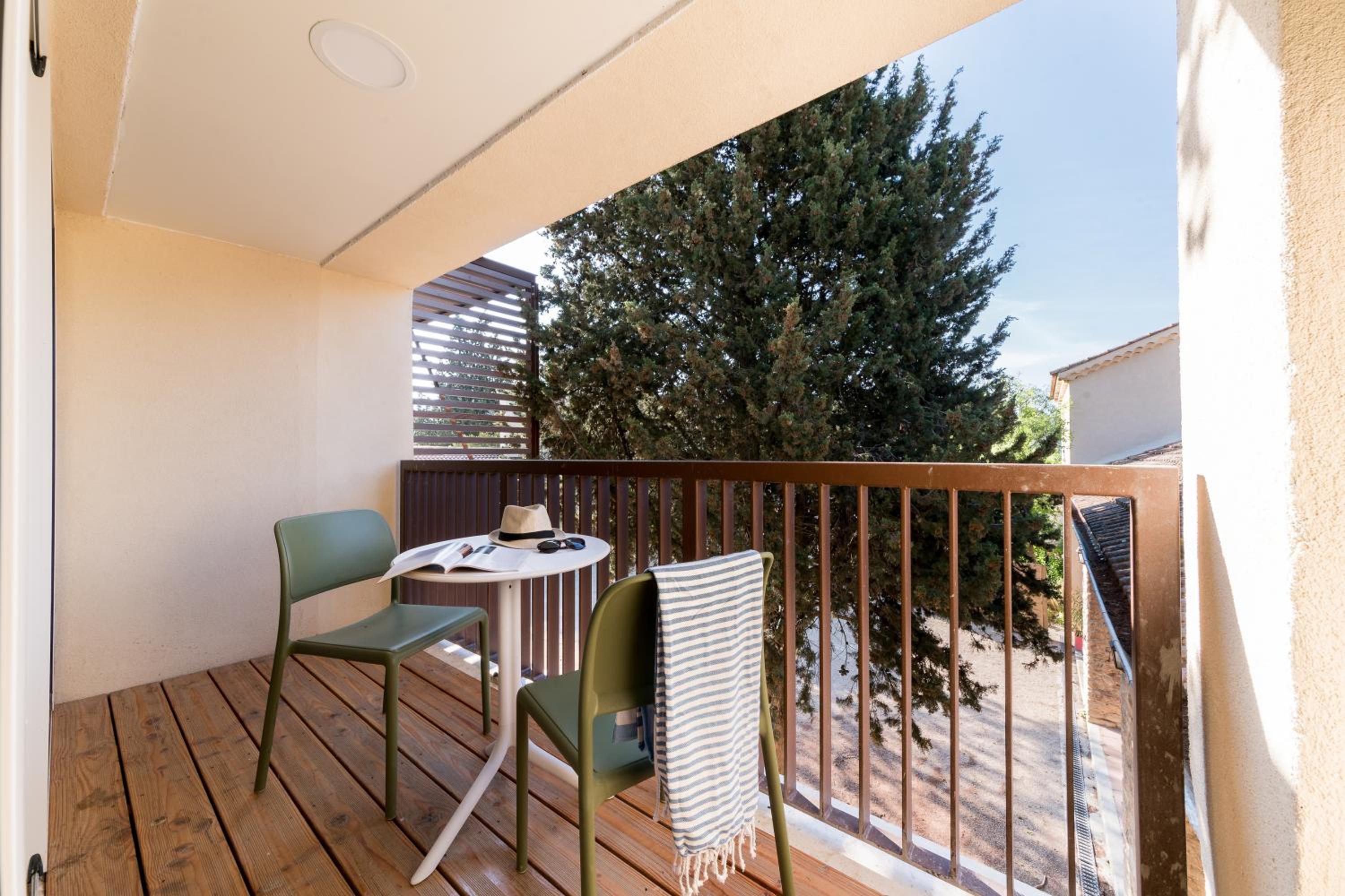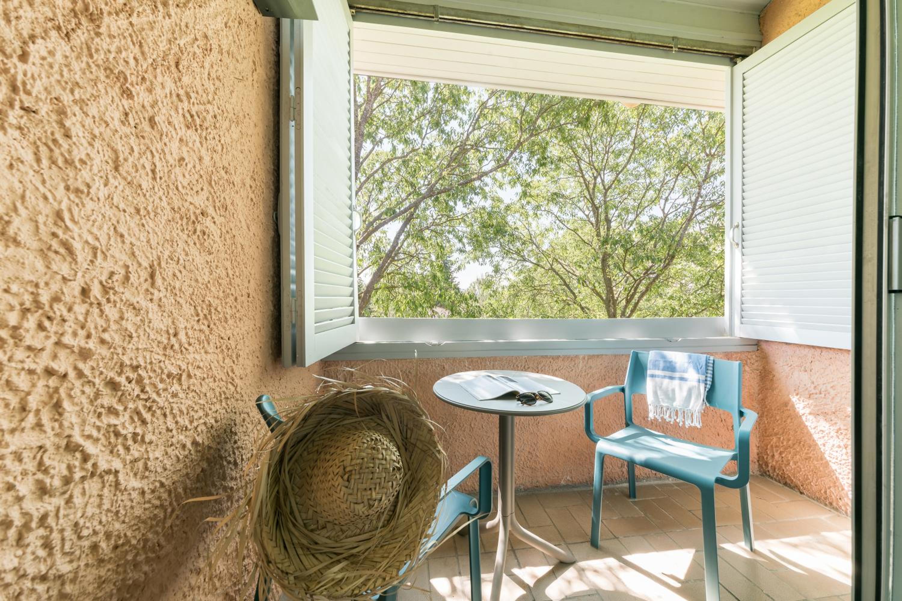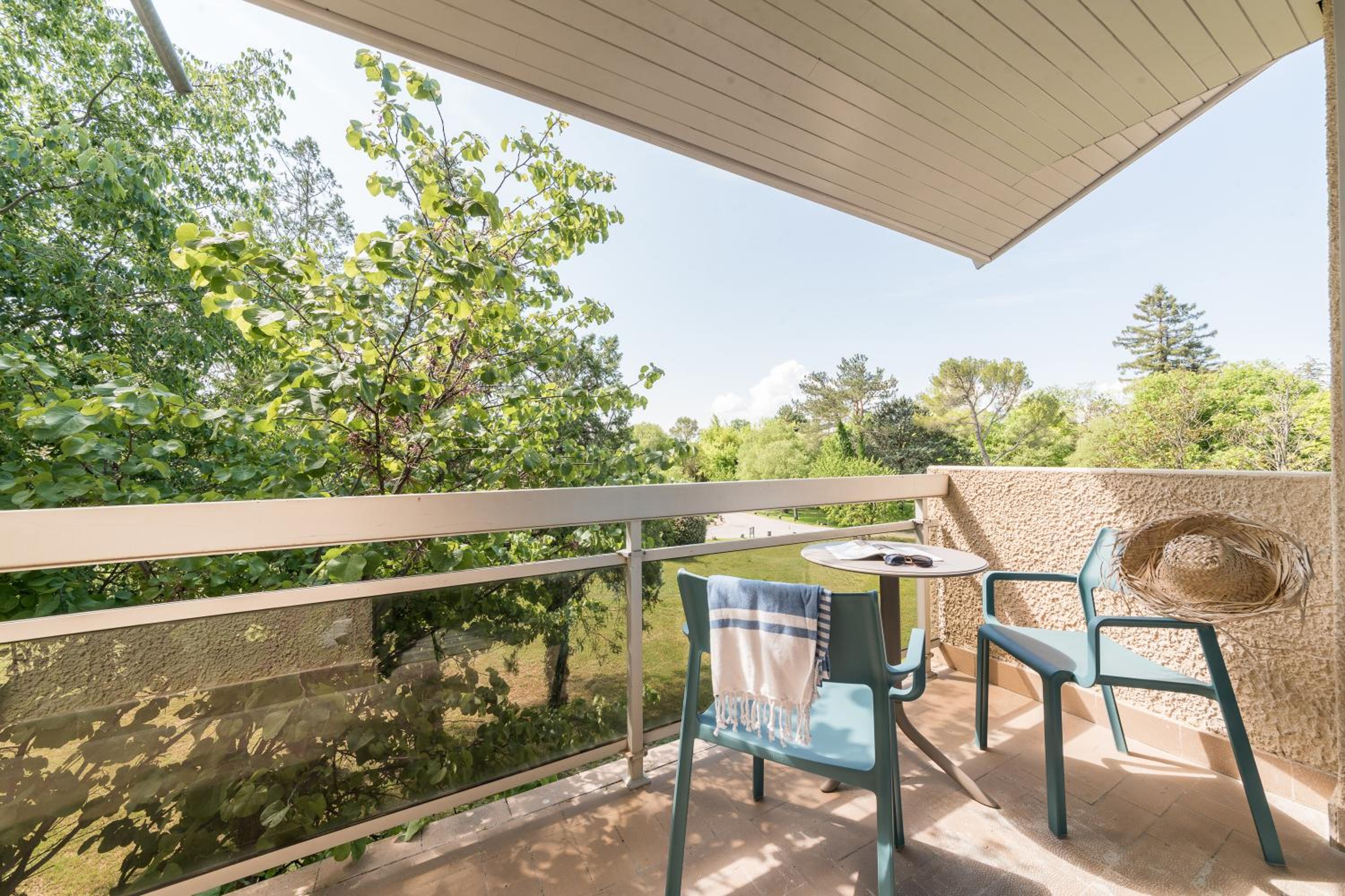 Comme j'ai réservé en dernière minute , ma chambre se situait au Mas donc à proximité du château, de ce fait moins calme que ce que j'ai déjà eu l'habitude d'avoir lors de mes séjours précédents , avec une terrasse immense plein sud , et donc sans parasol impossible d'y aller .