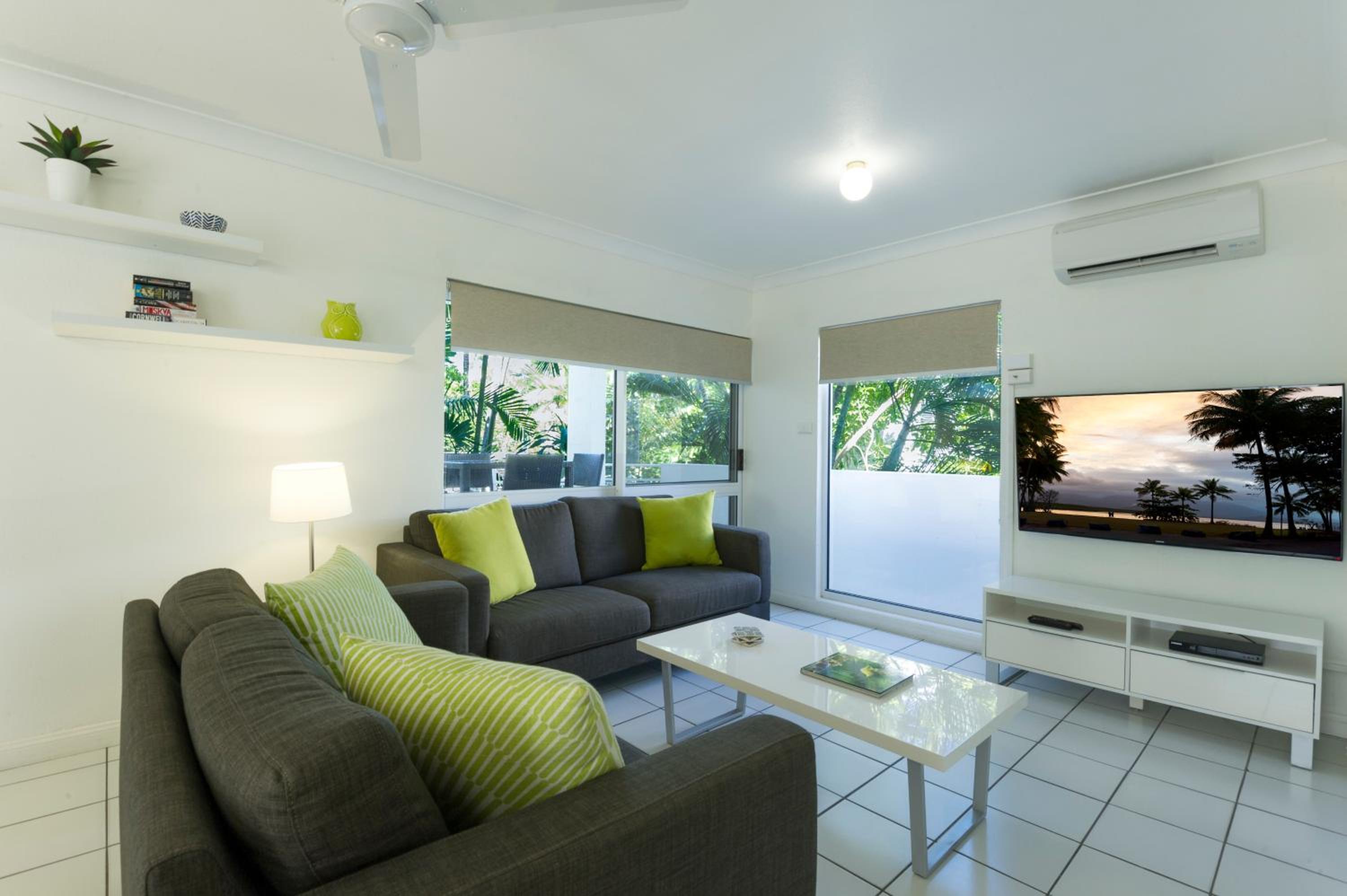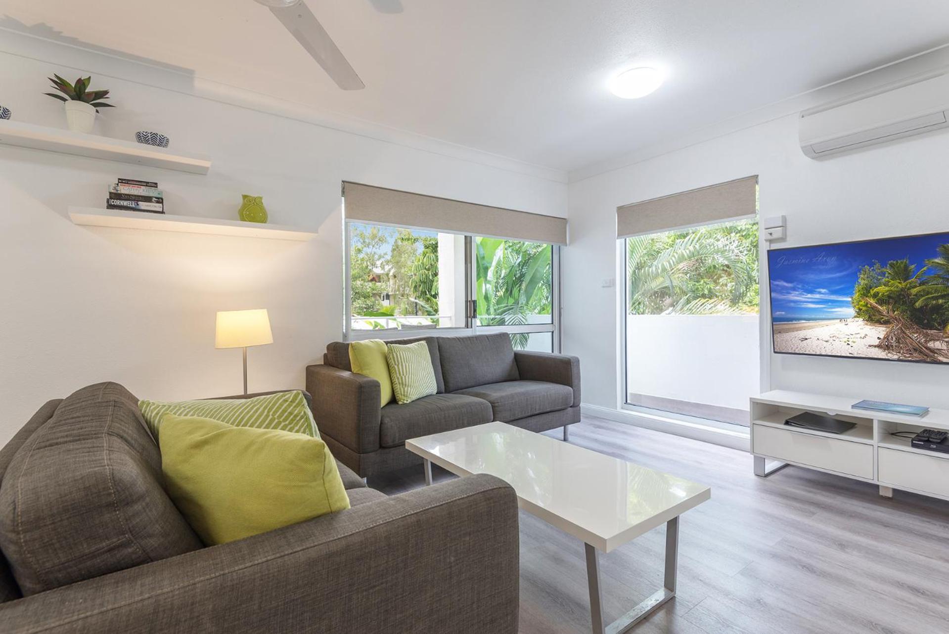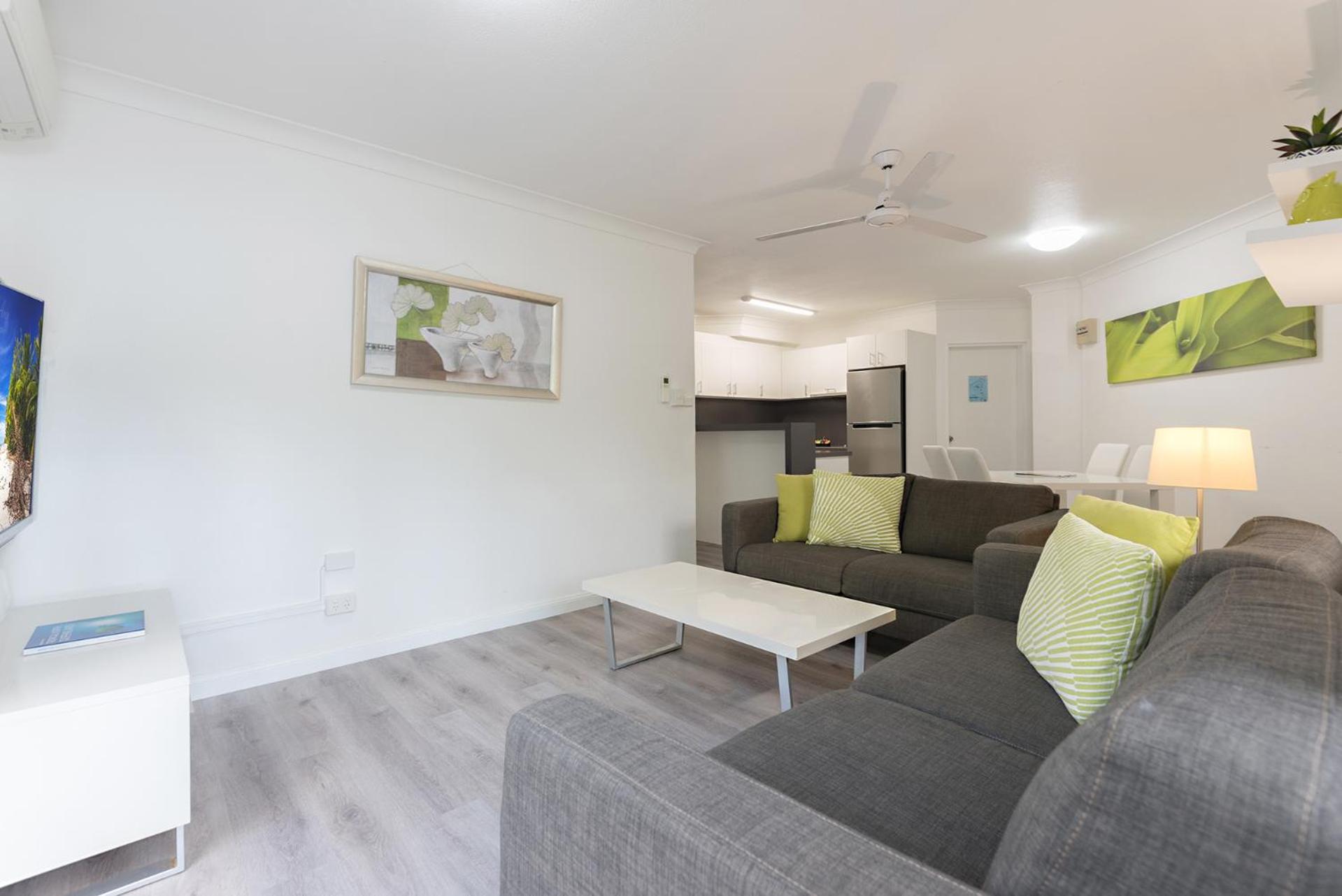Our air-conditioned apartments boast balconies with stunning views, fully equipped kitchens, and cozy living areas with entertainment options like free WiFi, cable TV, and DVD players. Additionally, take advantage of our tour desk services to plan unforgettable excursions to the Great Barrier Reef and Daintree National Park.