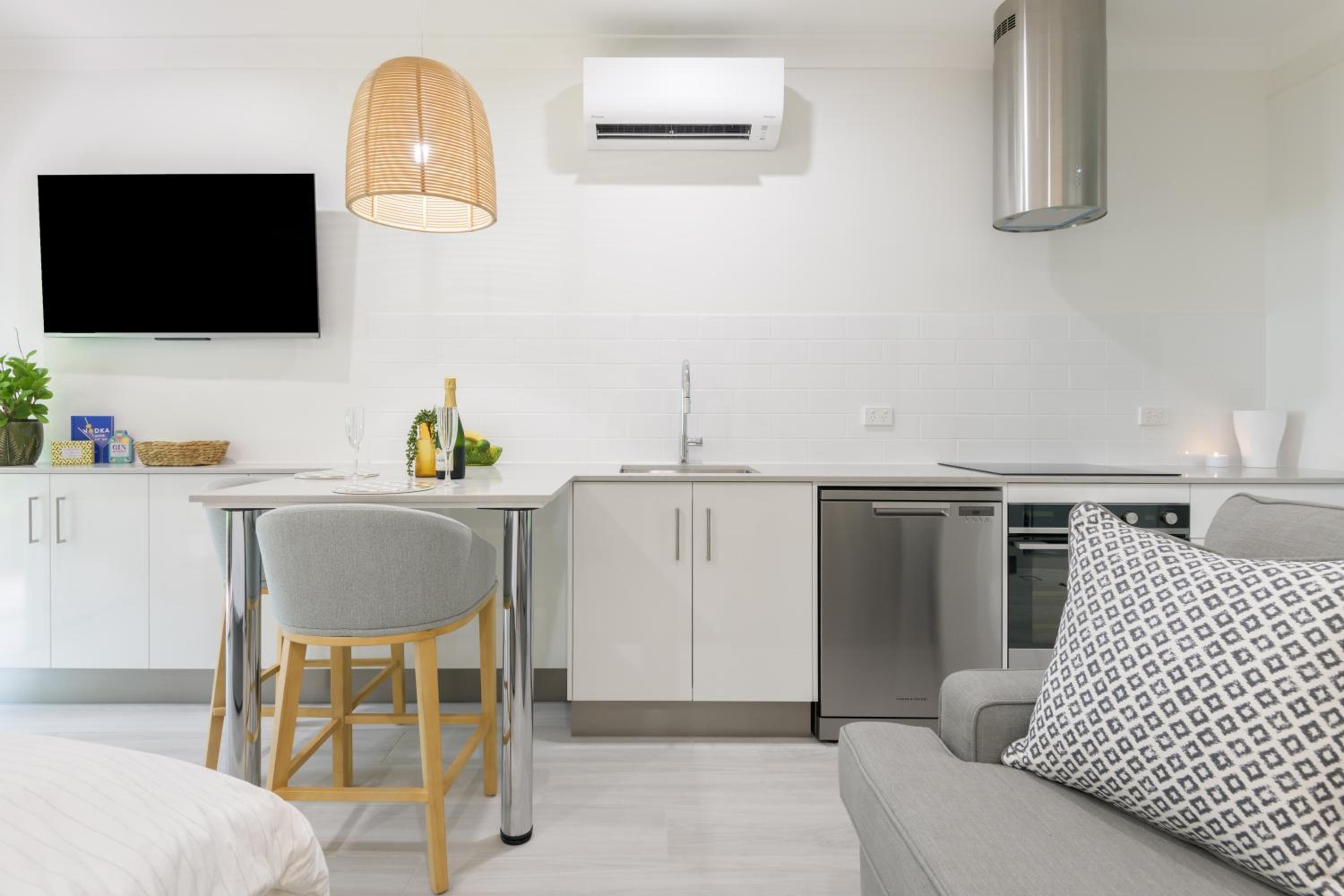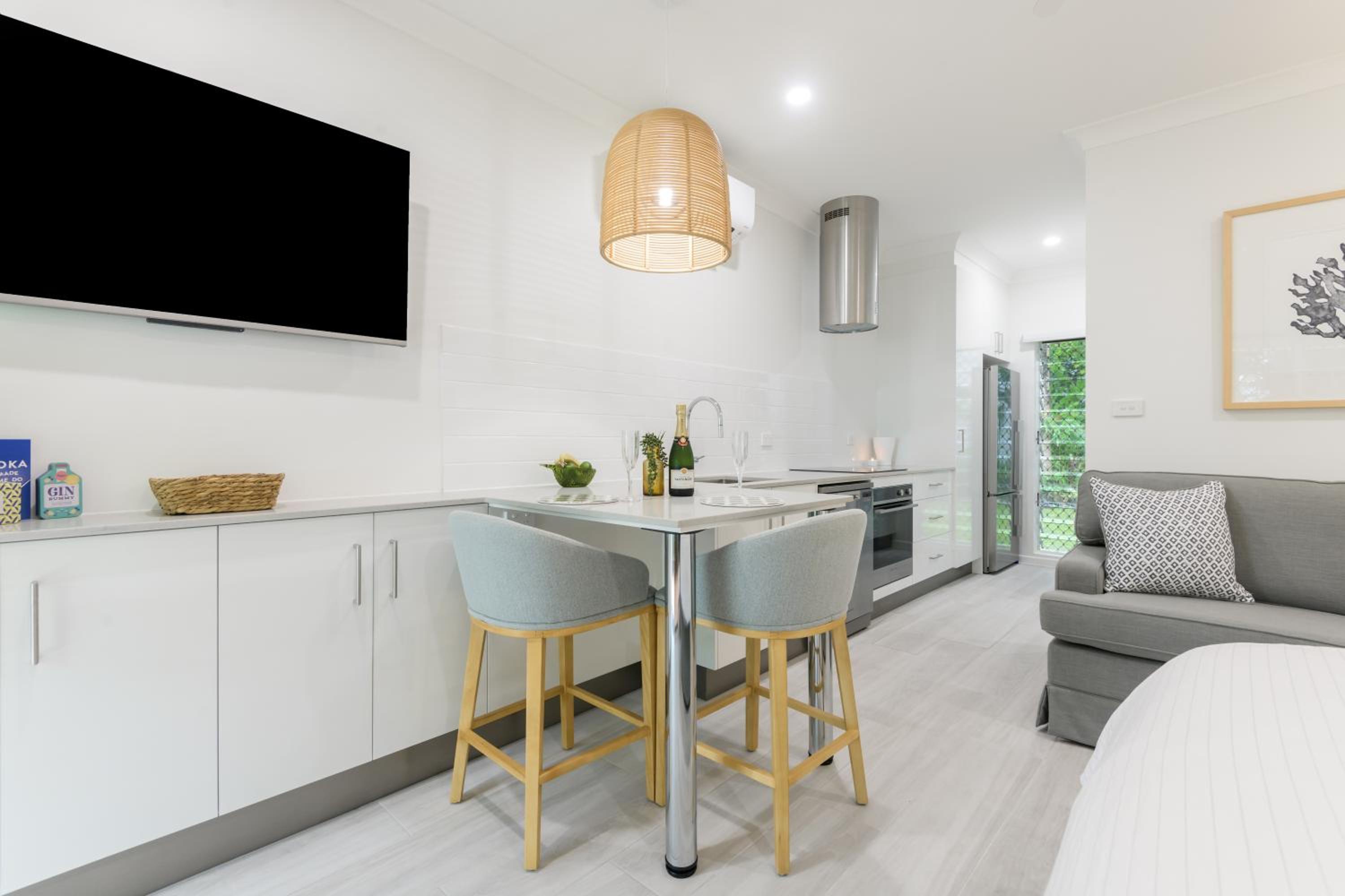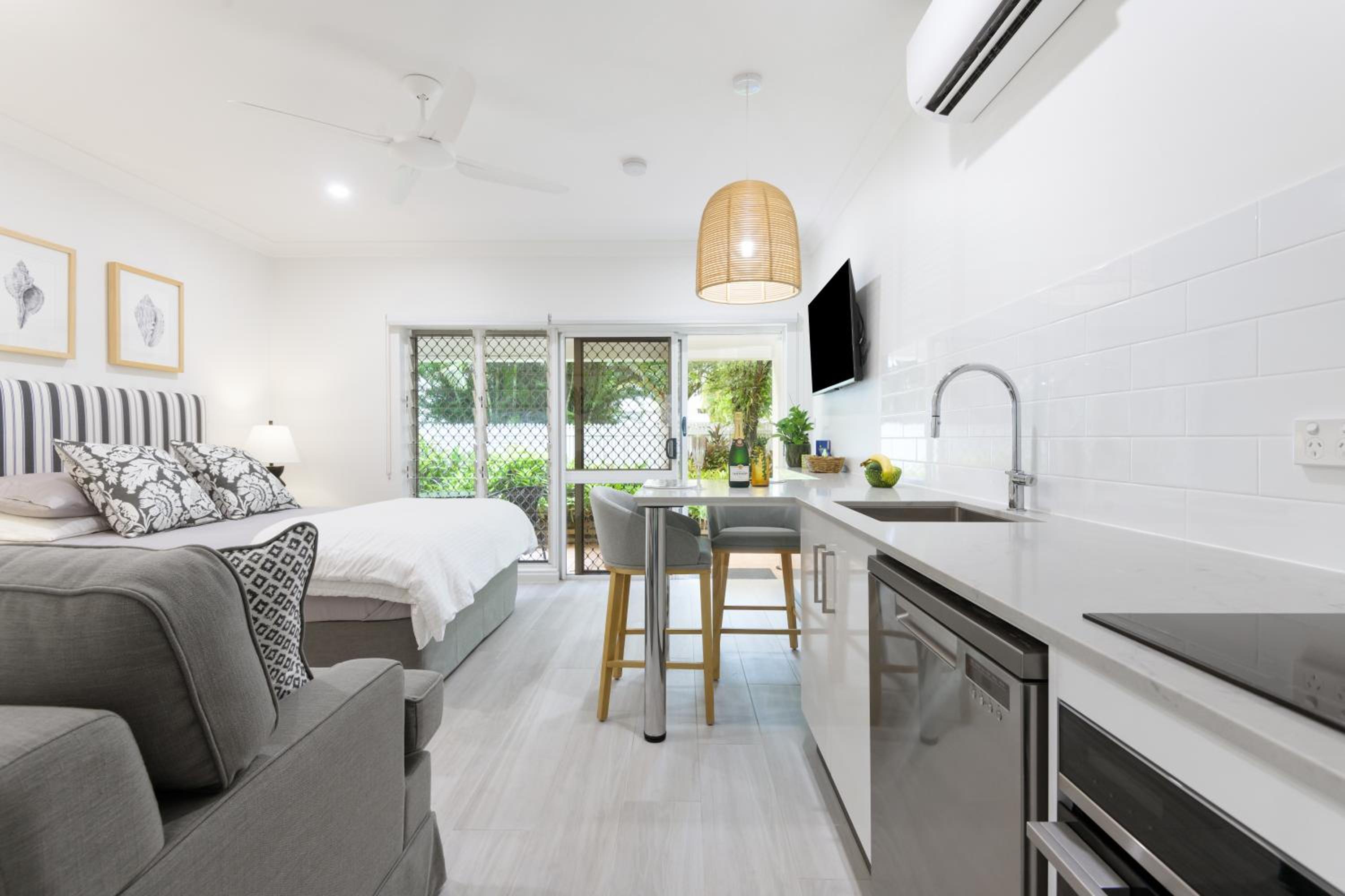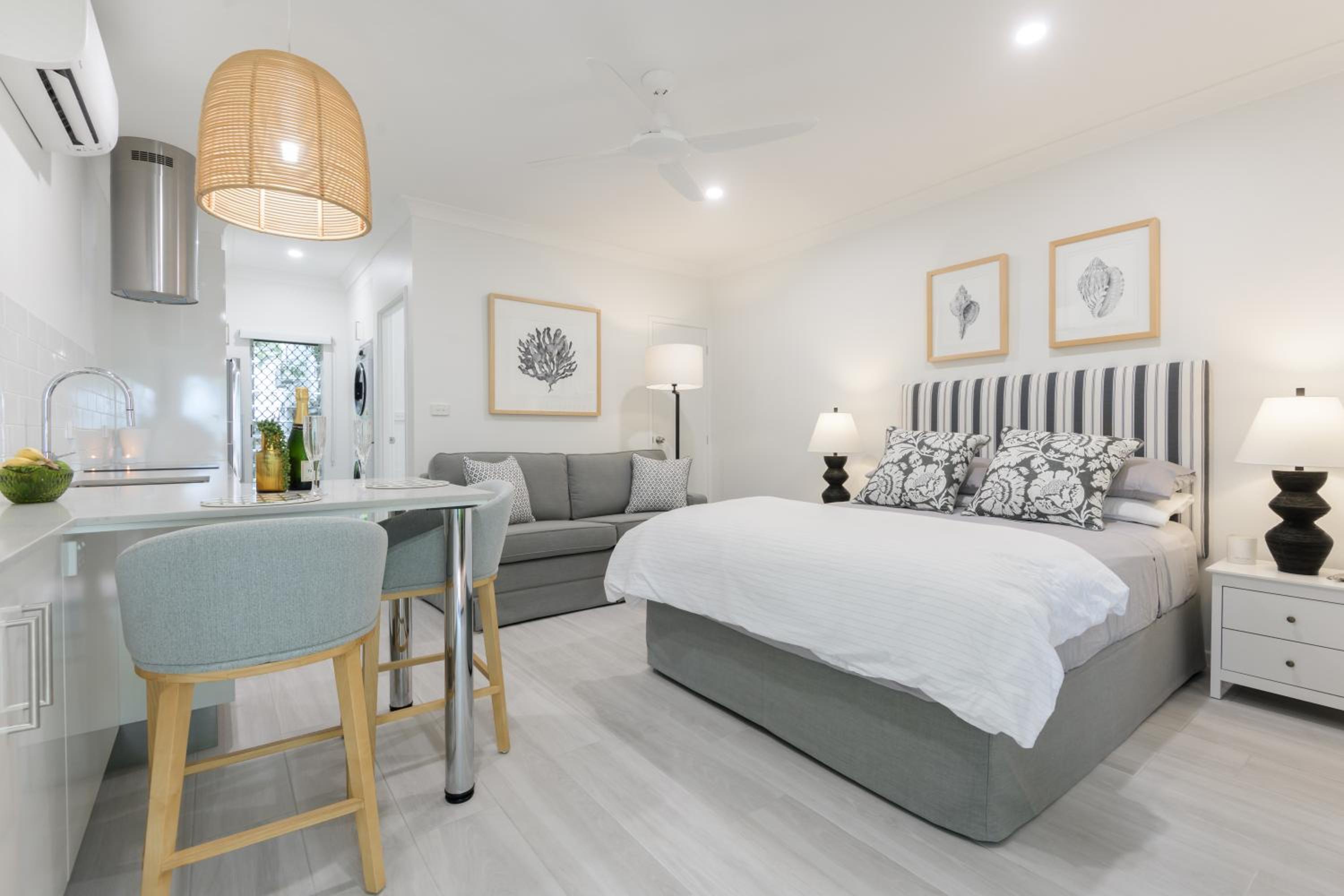 Our air-conditioned apartments boast balconies with stunning views, fully equipped kitchens, and cozy living areas with entertainment options like free WiFi, cable TV, and DVD players. Additionally, take advantage of our tour desk services to plan unforgettable excursions to the Great Barrier Reef and Daintree National Park.