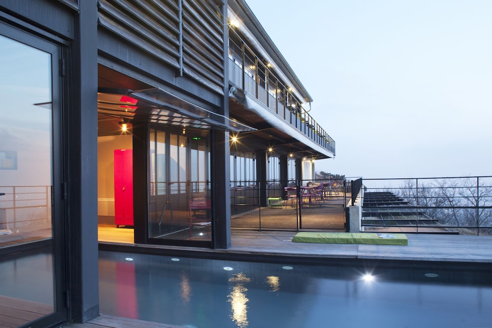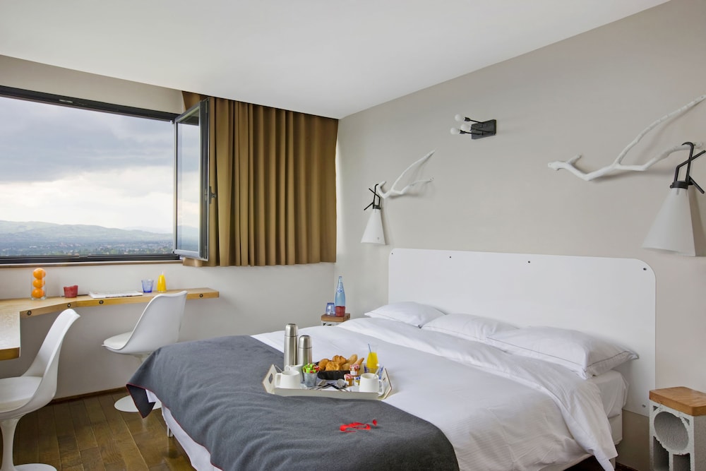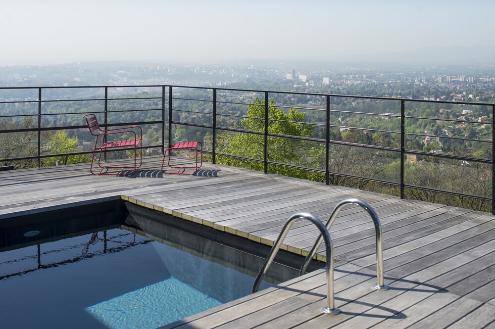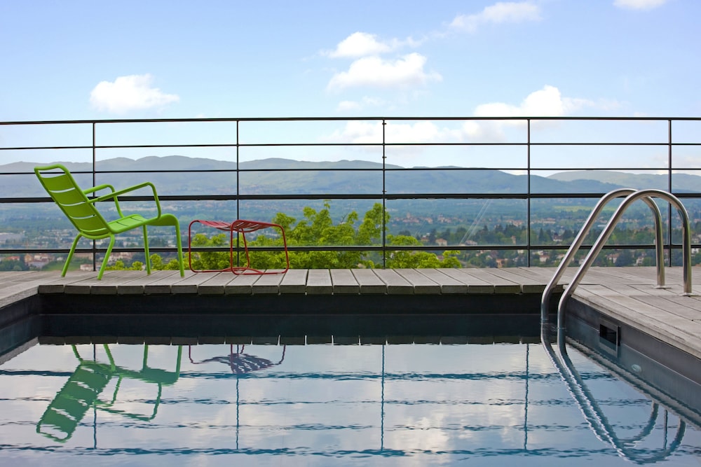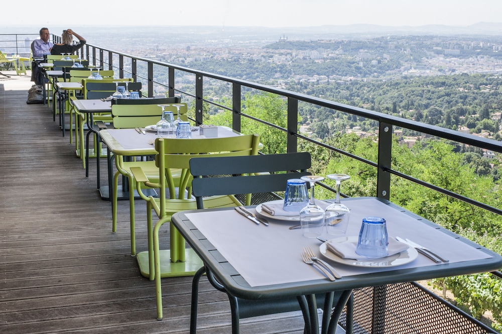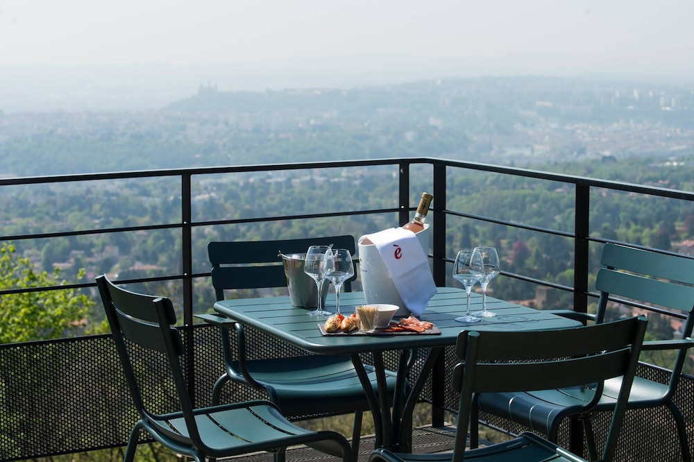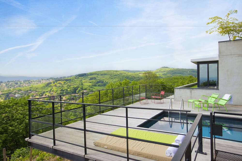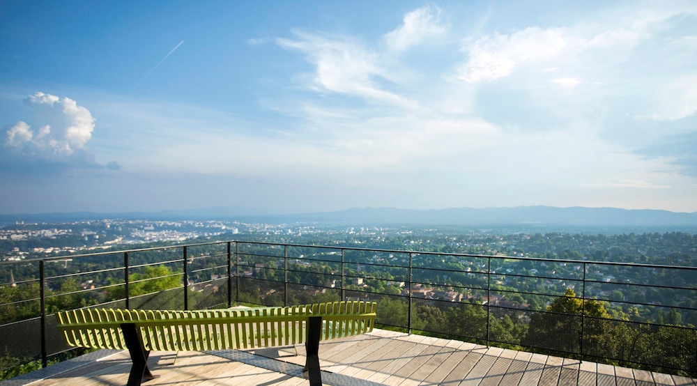 A pleasant drive leads you to a quiet area outside Lyon with a beautiful view. The hotel is beautifully situated. As soon as you arrive, you'll almost immediately decide to return. The various areas of the boutique hotel are "boutiquely beautiful," and the adjacent bar is also fantastic. We were also fortunate enough to encounter a wonderful singer/songwriter with a superb 80s repertoire!