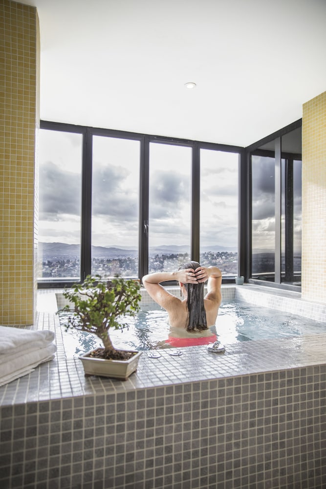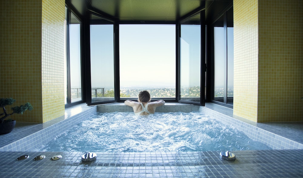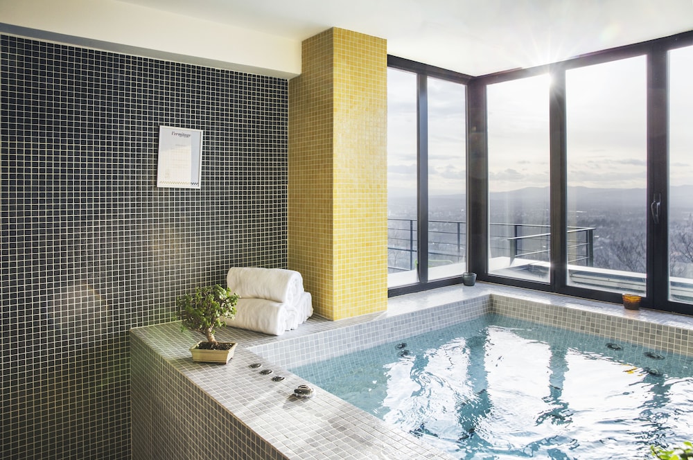 We stayed here for one night. The hotel is in a cute small village, up in the hills overlooking Lyon. The room and private bathroom were spacious and clean. We enjoyed the jacuzzi and swimming pool which you can book at reception for 45min. slots. The breakfast was wonderful and the staff was knowledgeable about allergy information. The restaurant and terrace has a great view over the valley. It was highly convenient that we could charge our car overnight so it was ready for us the next morning. The staff is very friendly and easily switches to English if you get stuck. Well recommended.