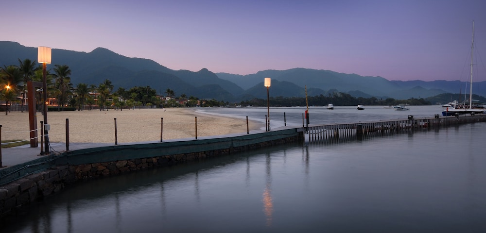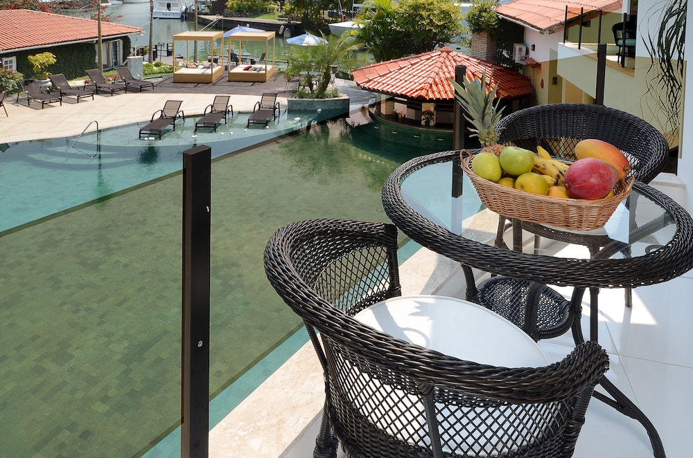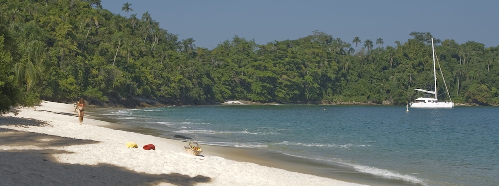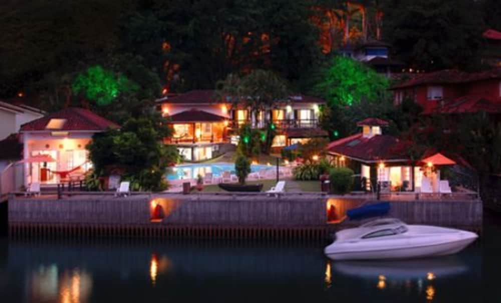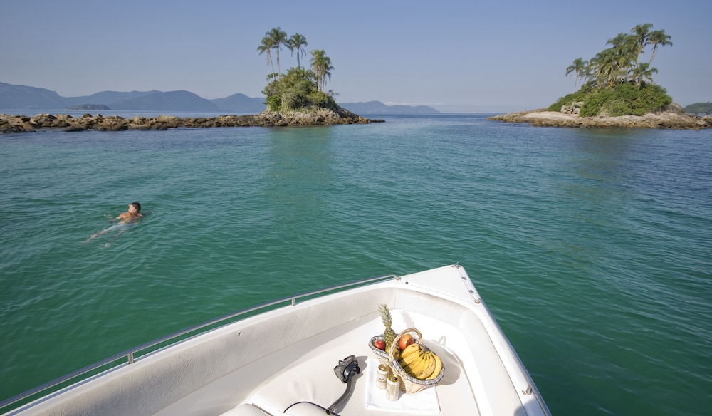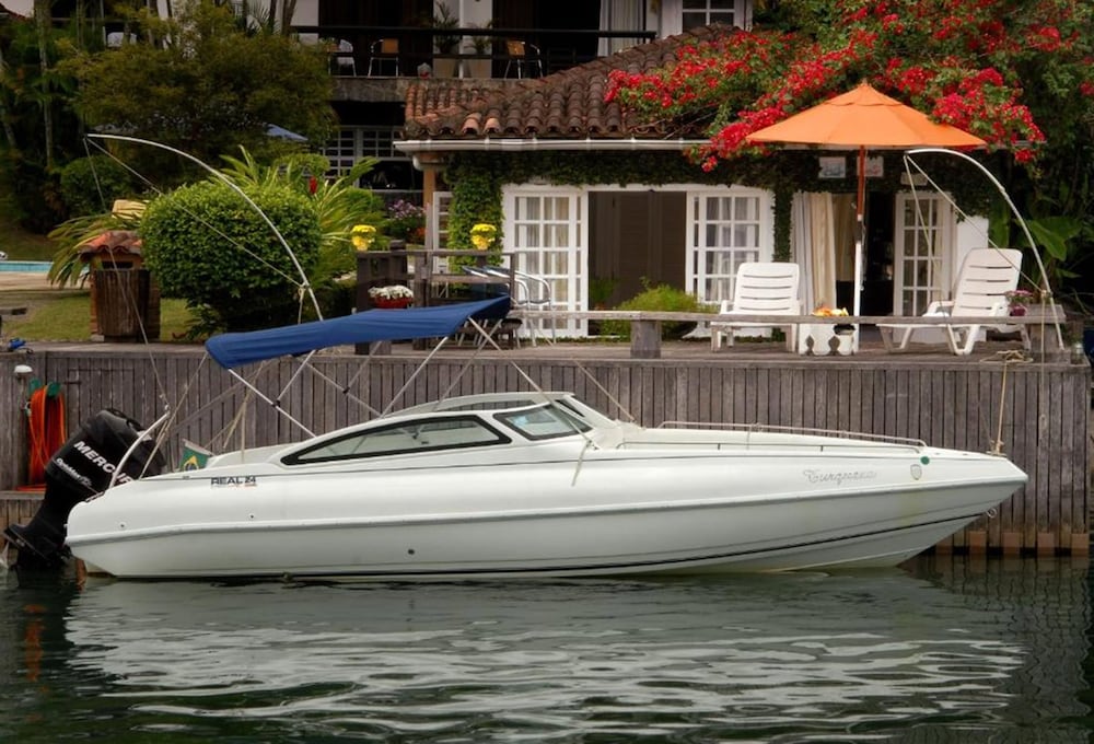 A localização num canal que permite o acesso de barcos é fundamental para quem vai conhecer as ilhas de Angra. A embarcação atraca no hotel.