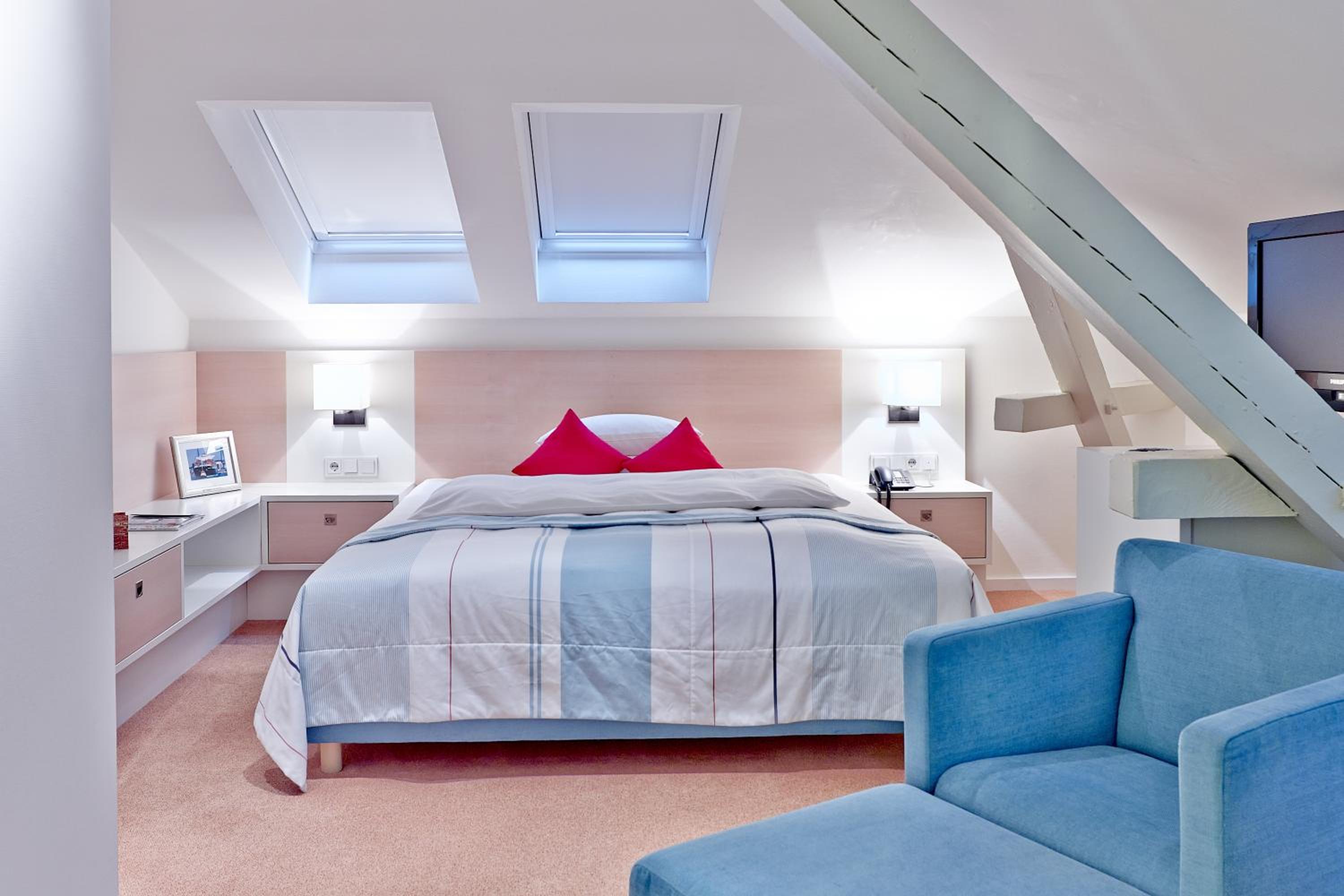 Experience elegant and themed accommodation in a beautifully restored historic building in the heart of Buxtehude. The Hotel Navigare, a 4-star non-smoking hotel, offers rooms with original stucco ceilings, flat-screen TVs, and free minibars. Each floor is uniquely decorated to reflect regions like the Far East, Mediterranean, Scandinavia, and the Arctic.