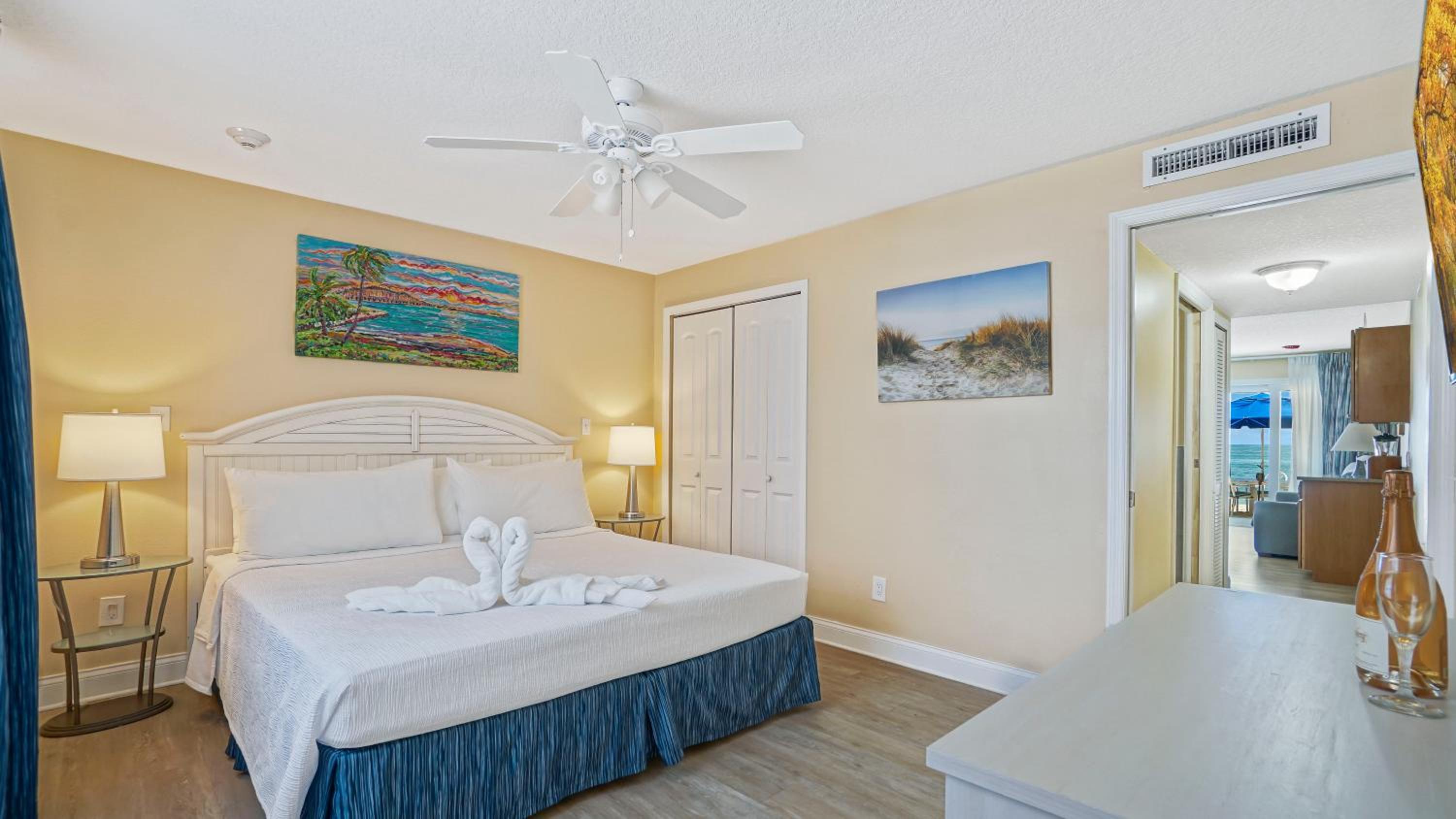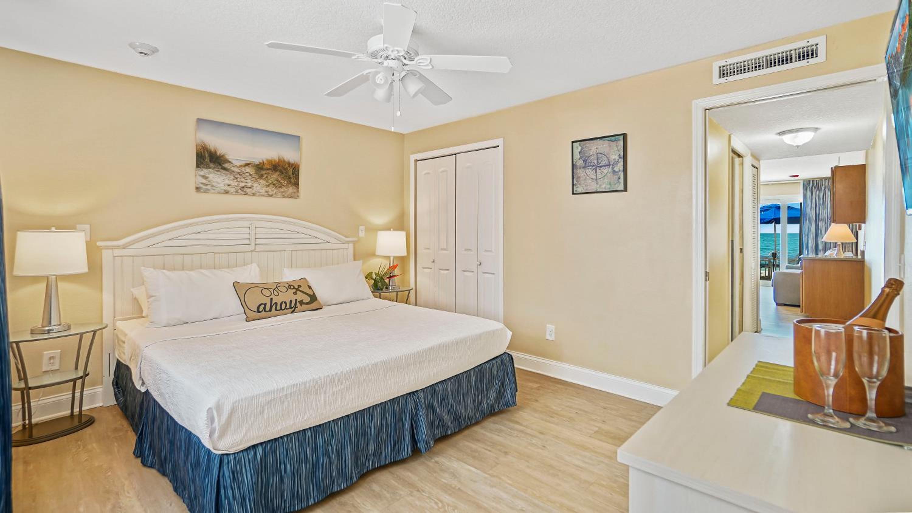 My mom, sister and I just spent 4 wonderful days at the Glunz resort for Spring Break. We had a bottom floor unit with the beach walk out access. It was awesome to be able to wake up and watch the sunrise while drinking our coffee. The unit had everything we needed to cook during our time there--more than most places give you. Everything was clean and we had plenty of towels for the bathroom and beach for use. Ceiling fans in the rooms and AC was cold.