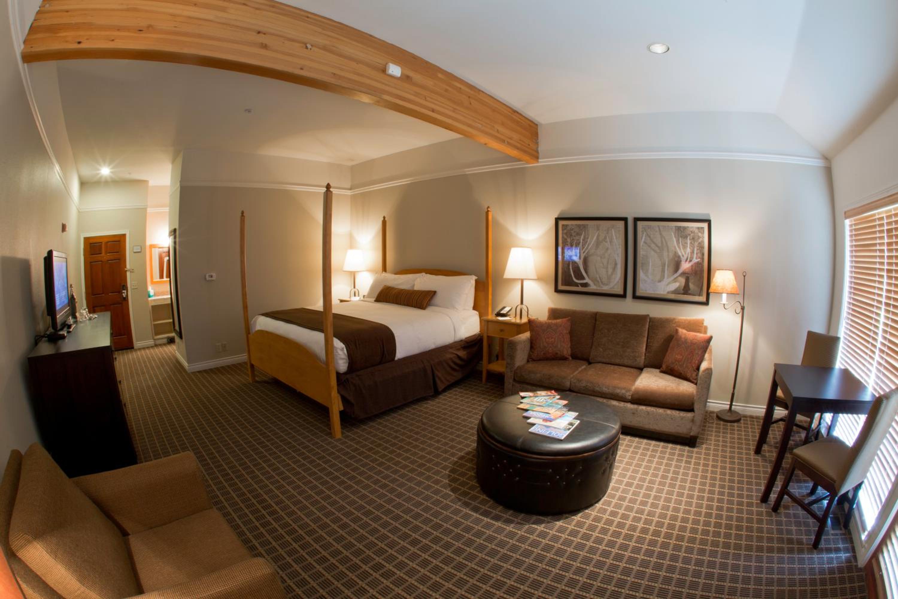 Indulge in comfort and style at Pine Ridge Inn with each room featuring a cozy fireplace, air conditioning, and elegant en suite bathrooms. The subtle colored linens and pine furnishings create a warm and inviting atmosphere for a relaxing stay.