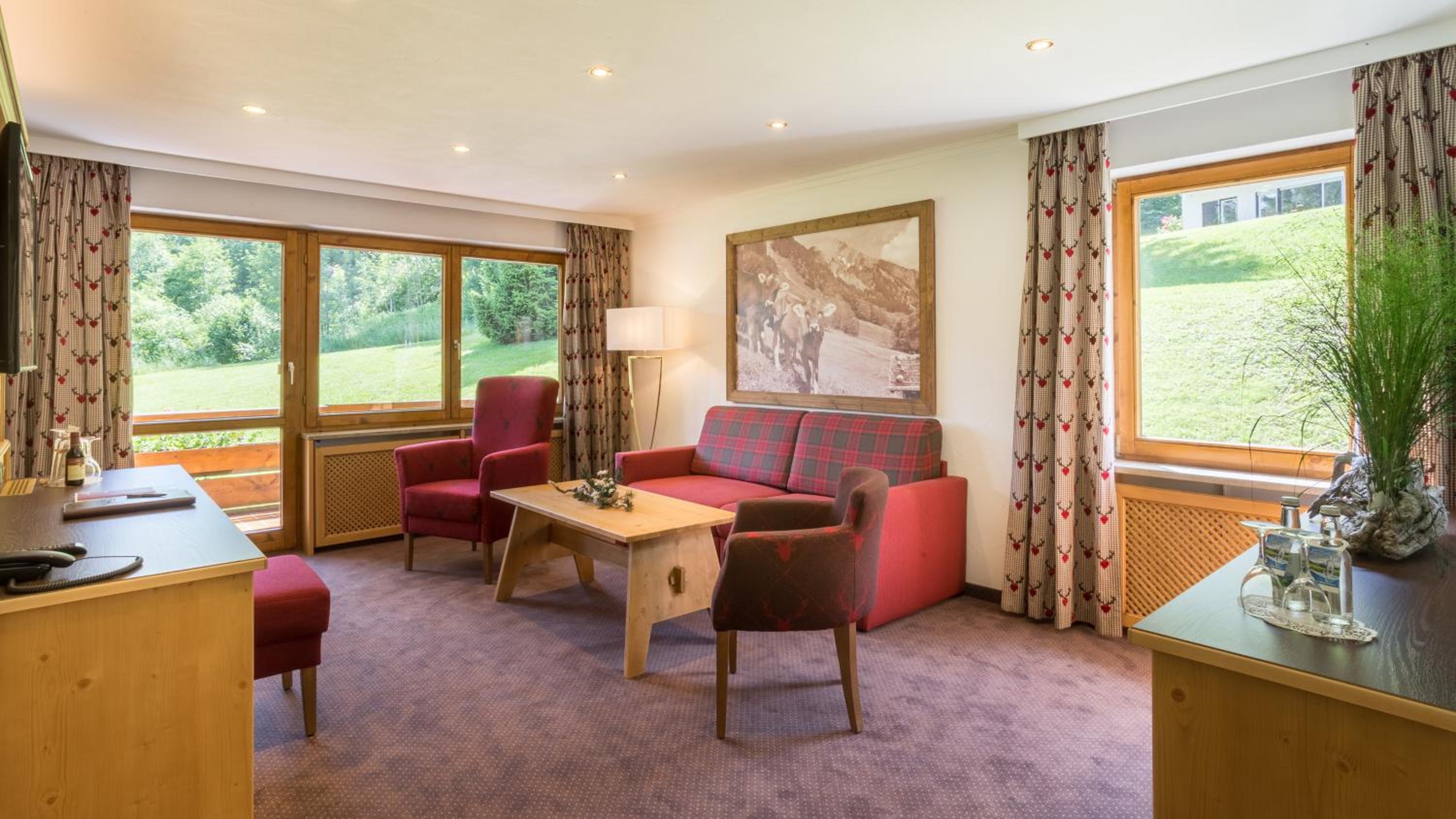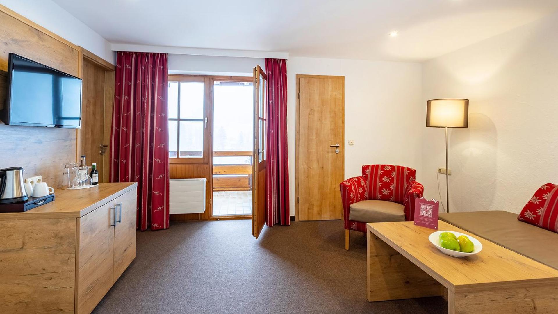The Alpenhotel Oberstdorf - ein Rovell Hotel offers elegantly designed rooms with wooden furniture and balconies that provide stunning views of the Allgäu countryside.