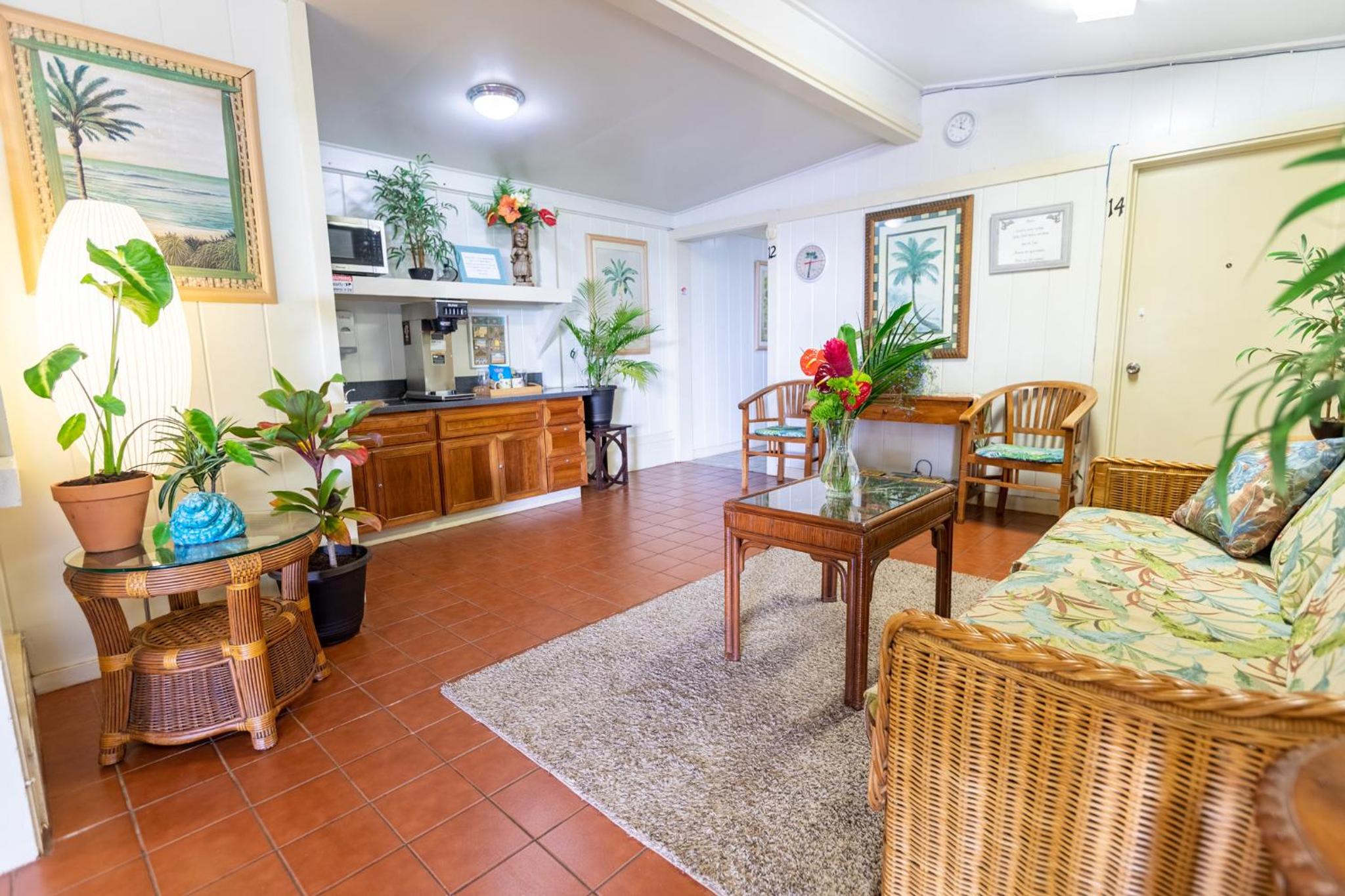 Kauai Palms Hotel, located near Lihue Airport, offers a unique blend of island style furnishings and modern amenities. Each room features a flat-screen TV, refrigerator, and the option for air conditioning or kitchenettes.