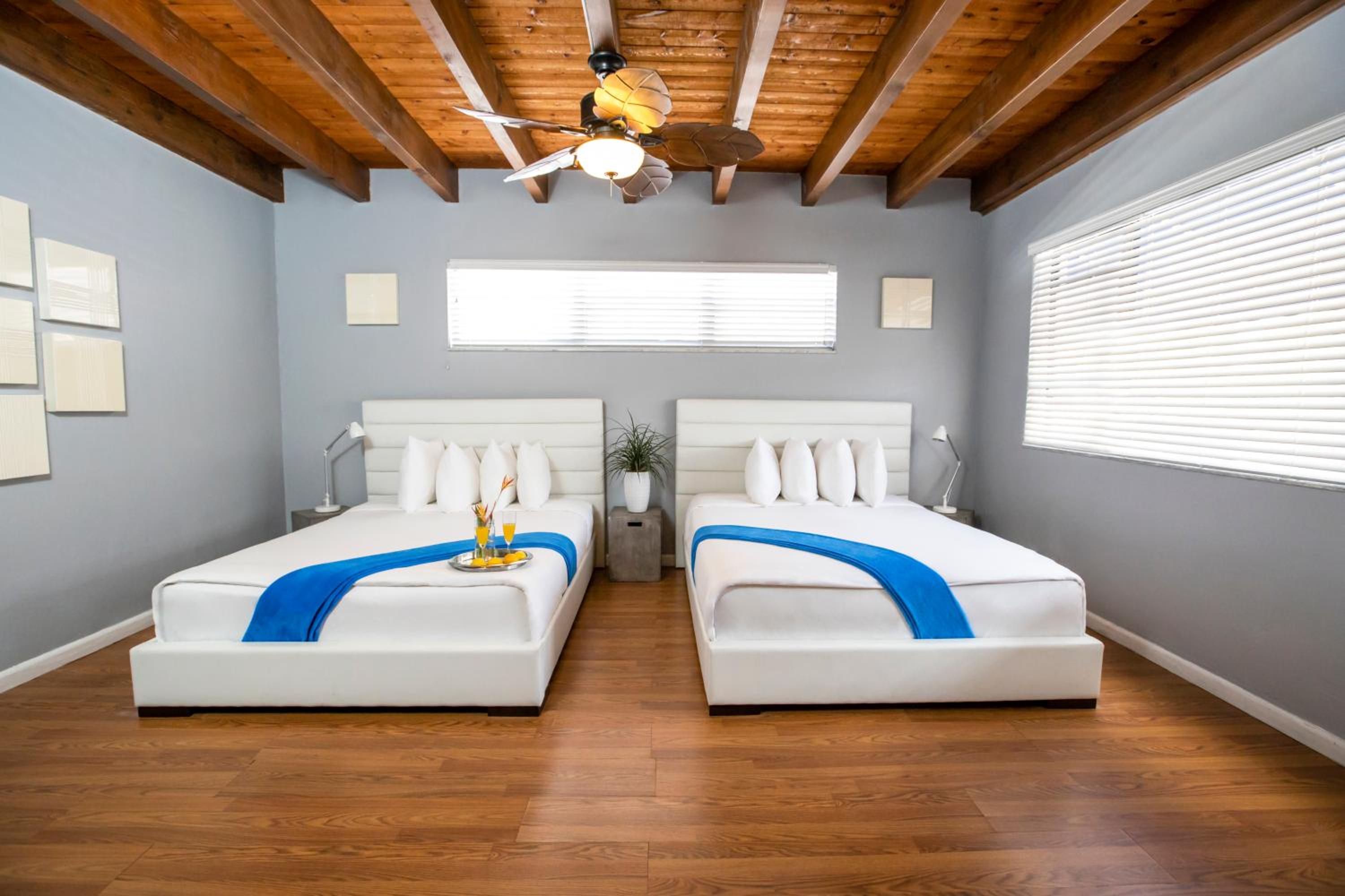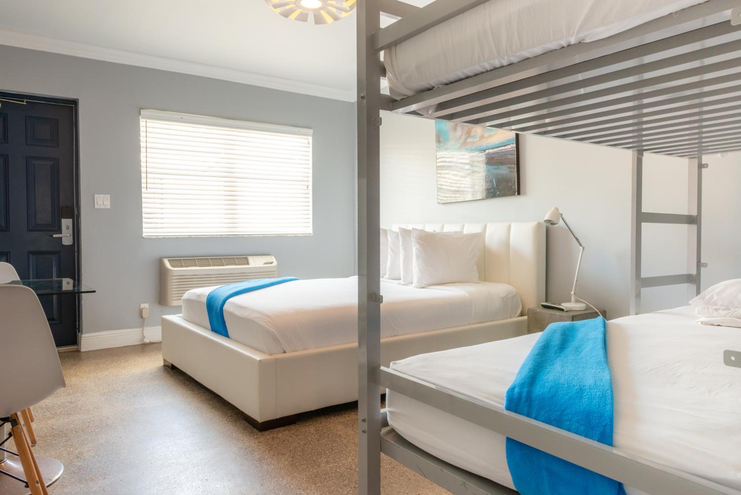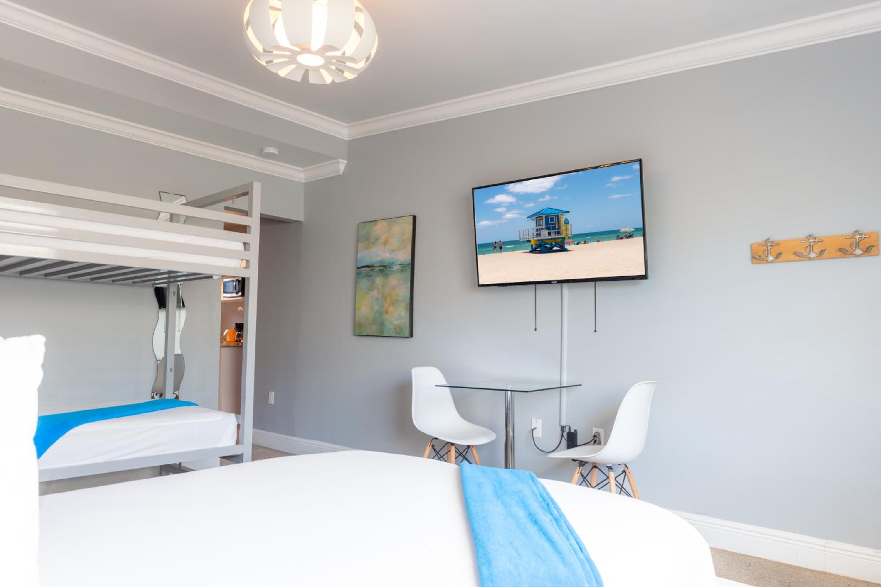 Experience a relaxed Florida-style stay with vibrant beachy decor, comfortable beds, and convenient mini kitchens - ideal for families looking to unwind and create lasting memories.