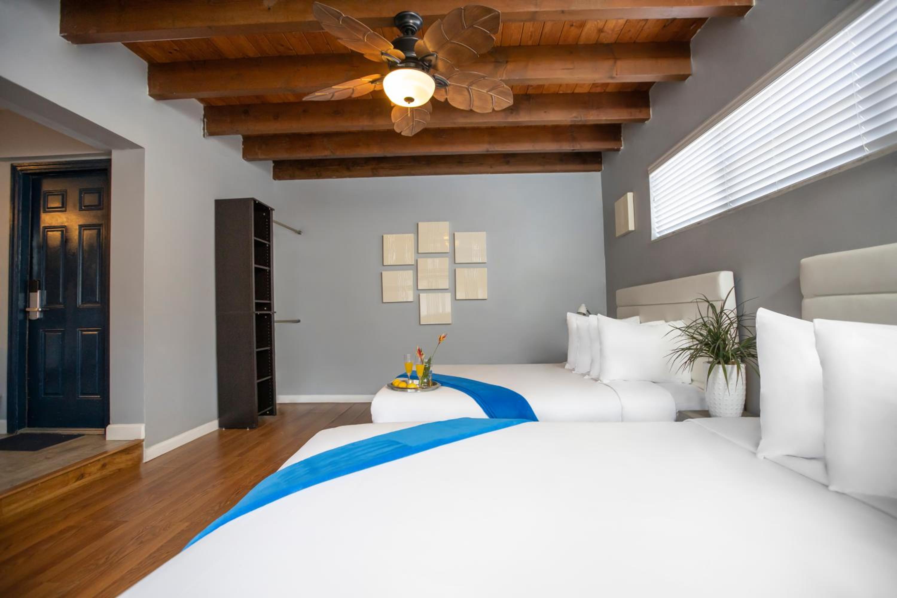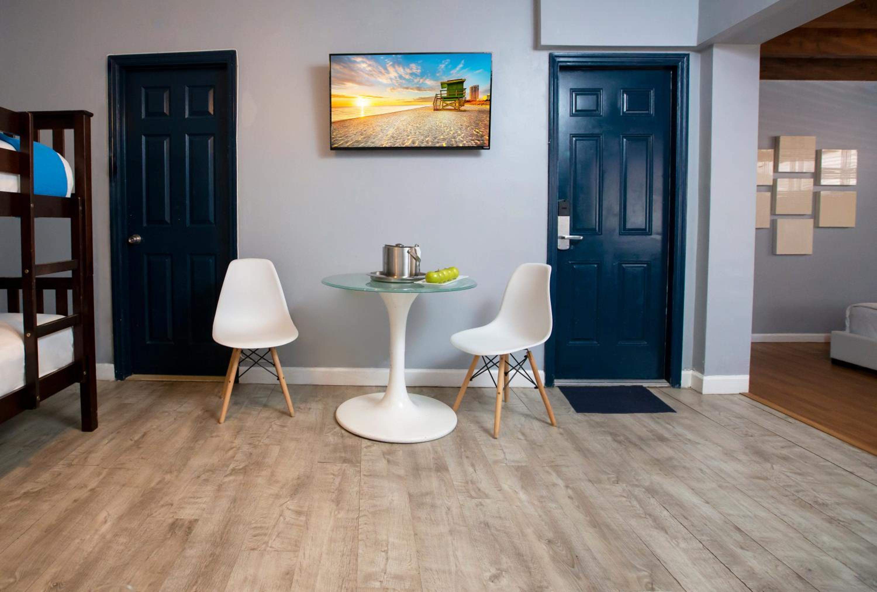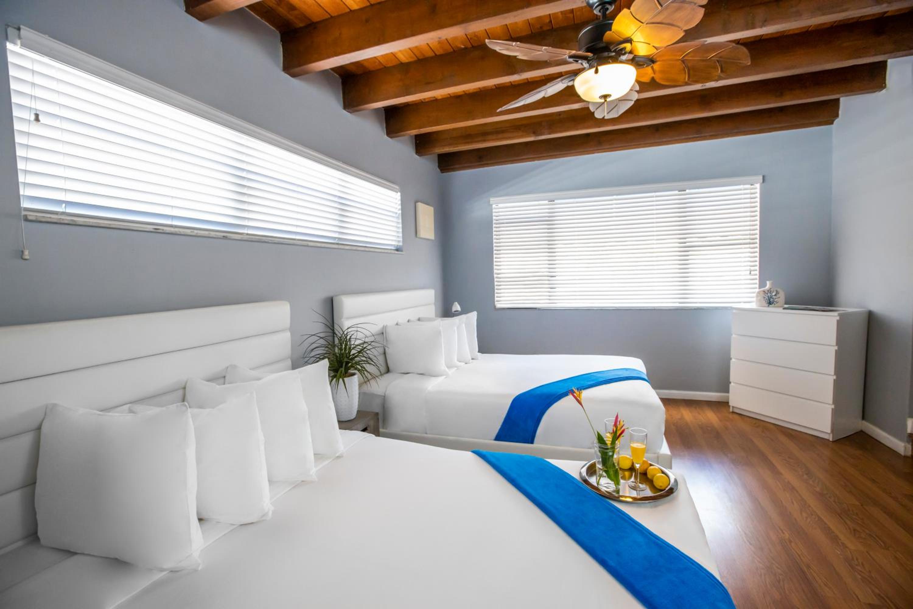 Experience a relaxed Florida-style stay with vibrant beachy decor, comfortable beds, and convenient mini kitchens - ideal for families looking to unwind and create lasting memories.