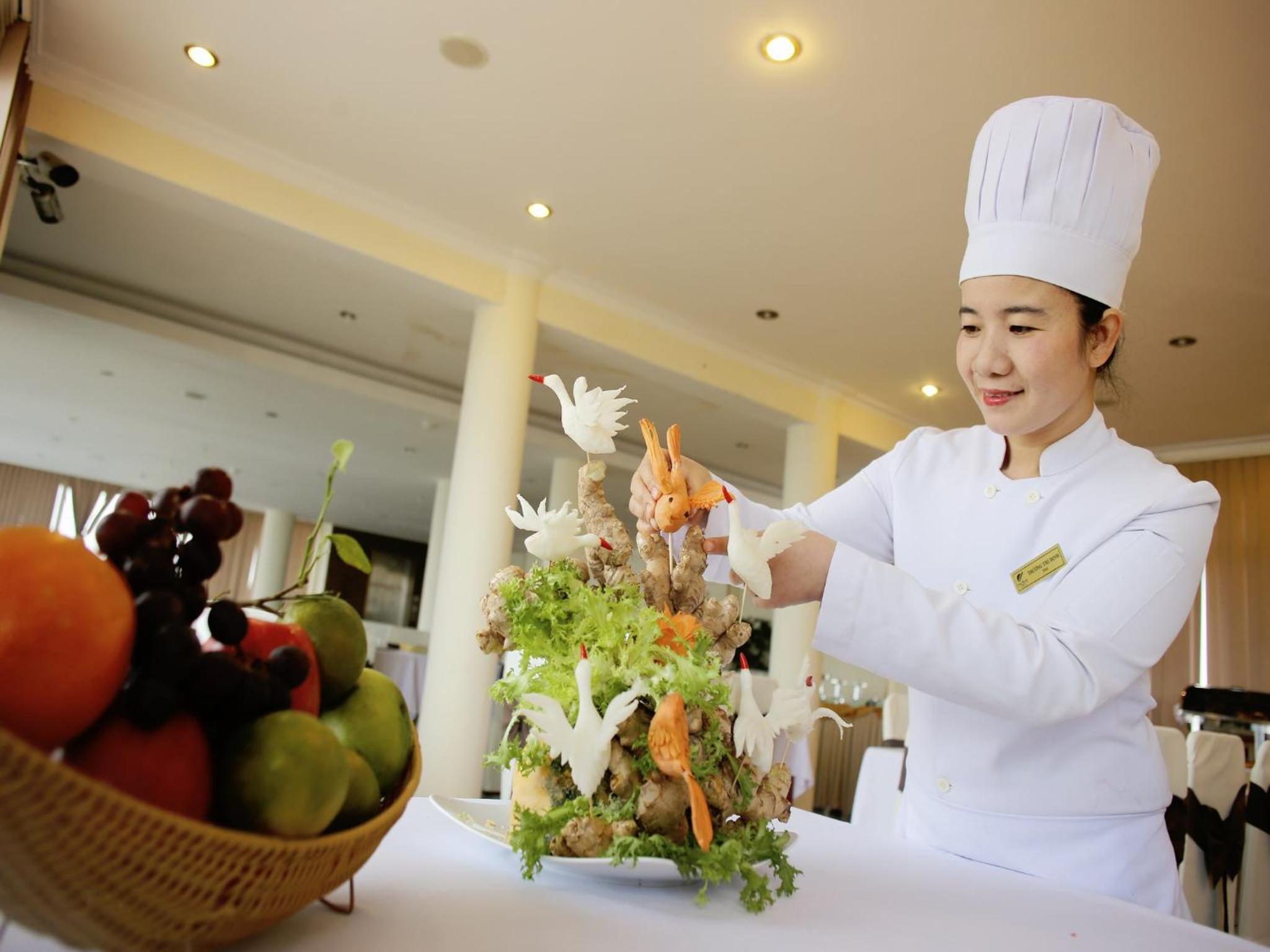 Savor a culinary journey at Jasmine Restaurant, offering a delightful mix of local and international cuisines. Unwind with a refreshing drink while soaking in panoramic views of the majestic Ngu Mountains.