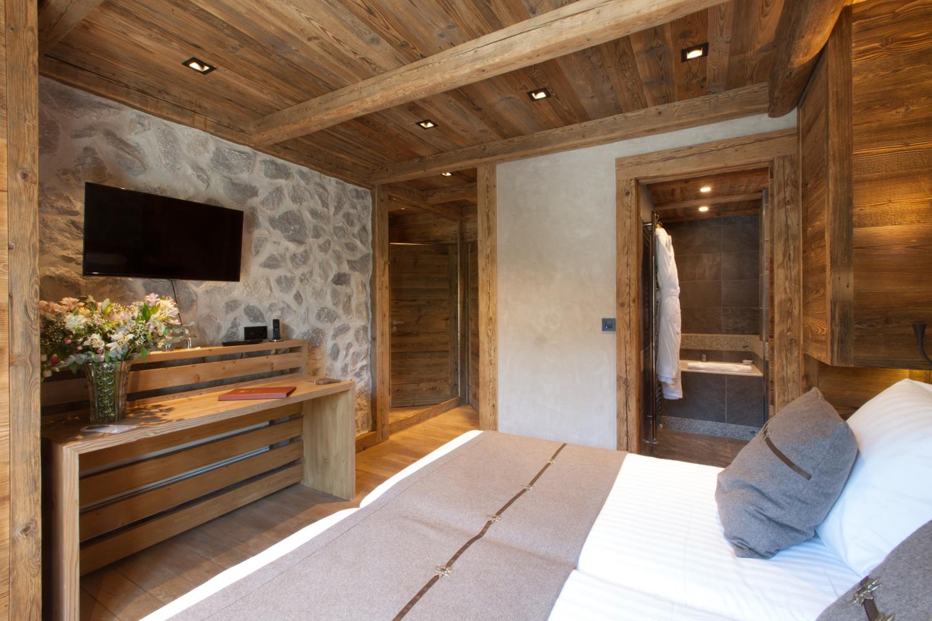 Escape to Au Coin Du Feu, a charming hotel nestled just steps away from Megève's center and the Chamois Ski Lift. Enjoy breathtaking mountain views from your cozy room, complete with luxurious amenities like slippers and bathrobes in the private bathroom.