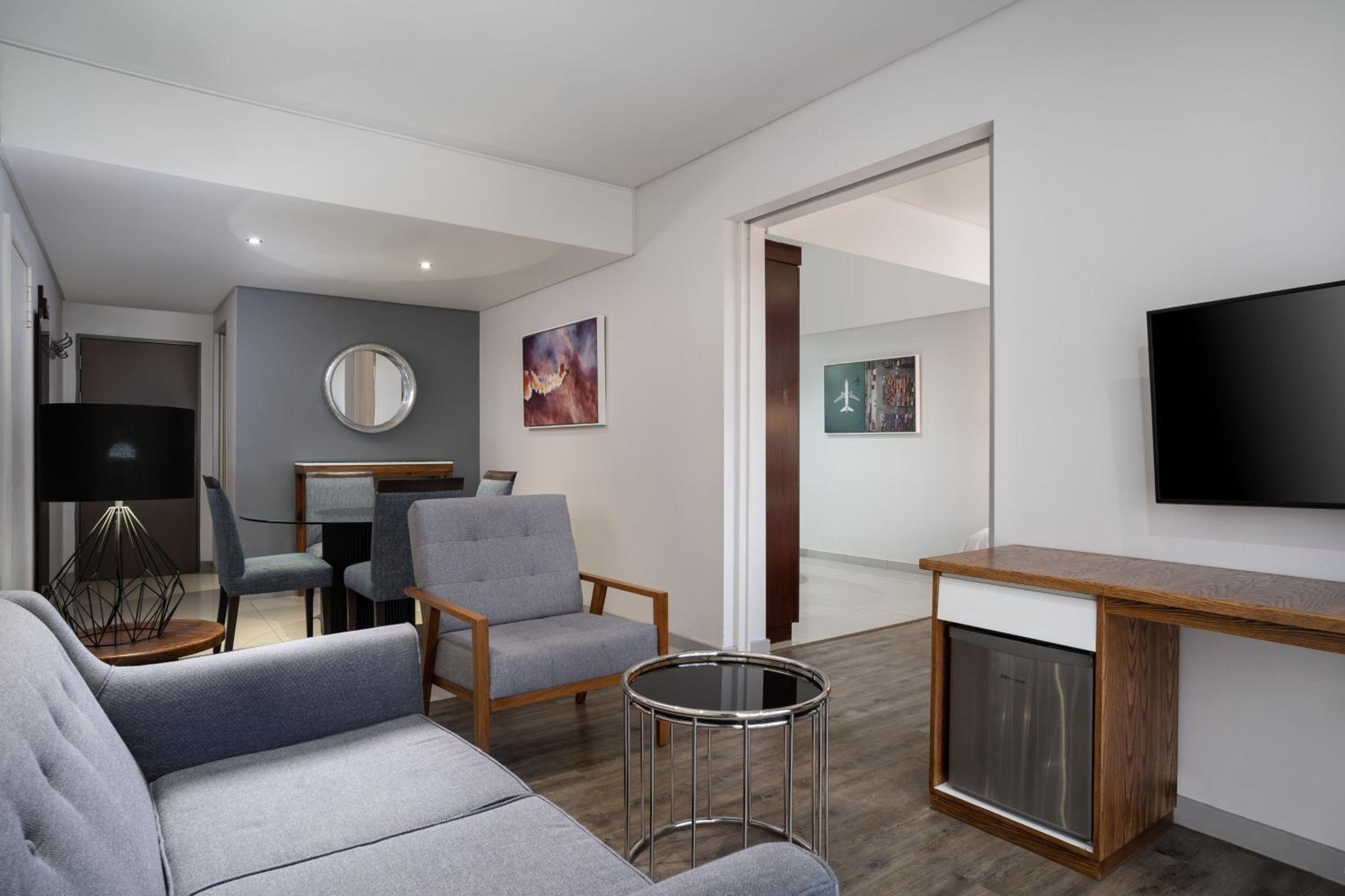 Protea Hotel by Marriott O R Tambo Airport offers a one-of-a-kind experience with its aeroplane hangar themed decor, providing a modern and industrial ambiance that overlooks the bustling airport activities.