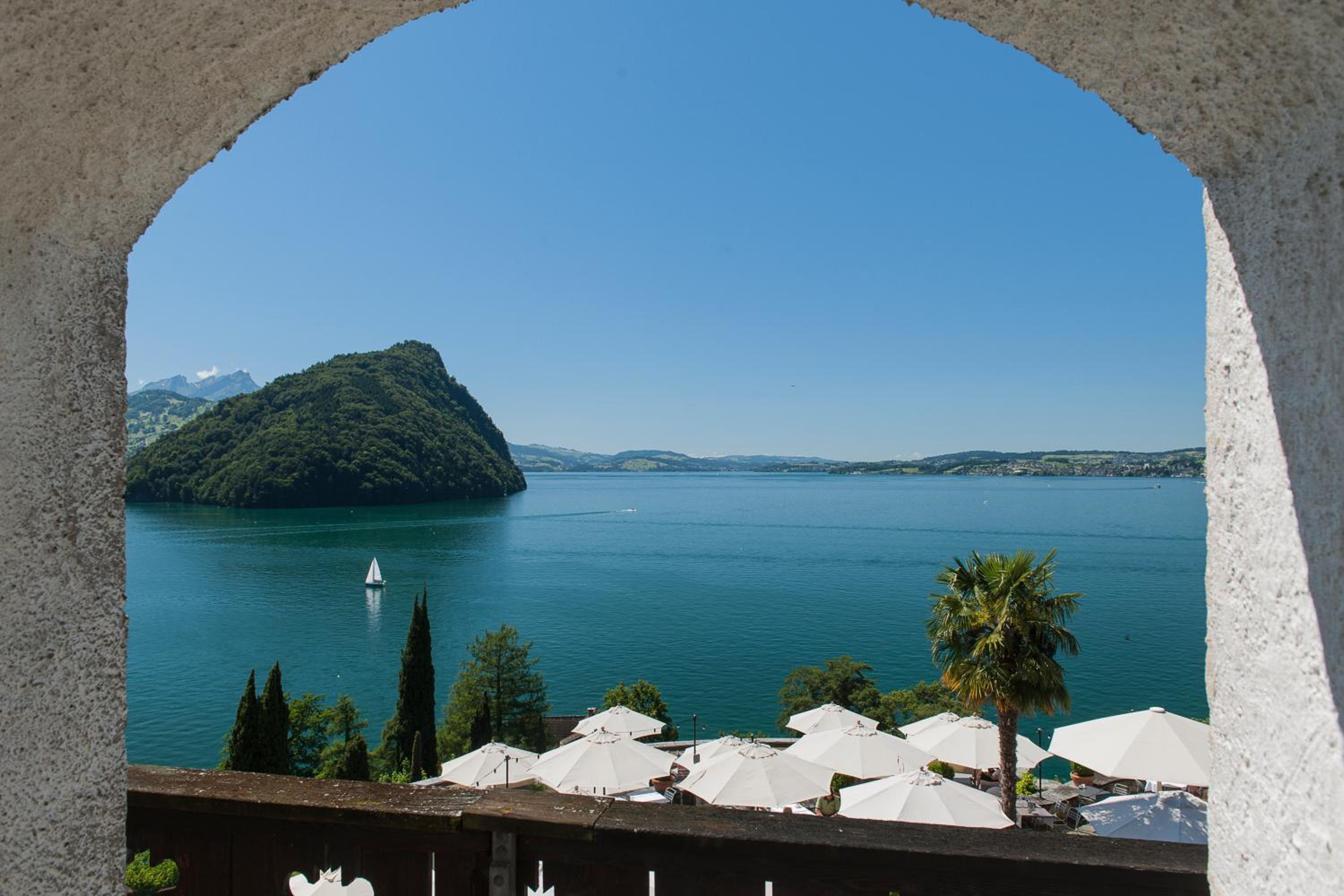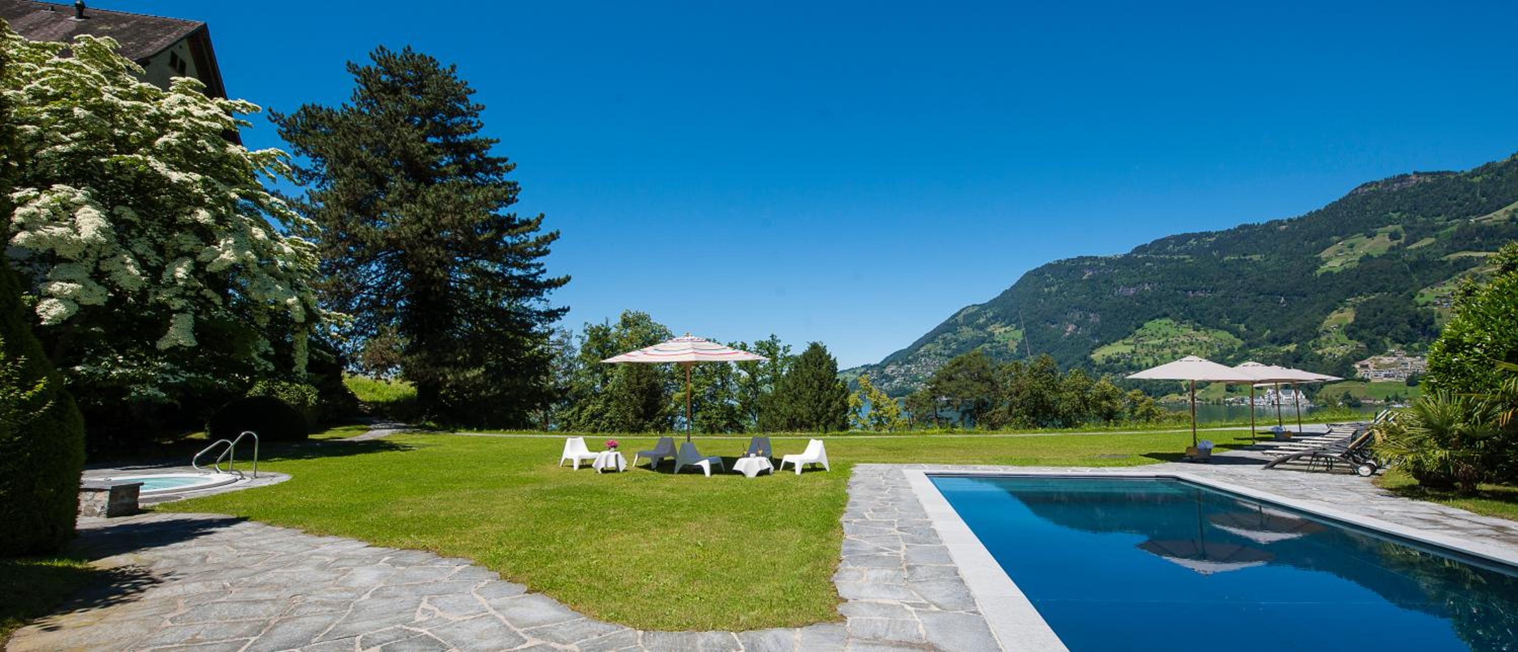 Nestled at the shores of Lake Lucerne, the See- und Seminarhotel FloraAlpina offers a serene escape outside Vitznau. The large park invites guests to unwind in the outdoor wellness area, complete with a sauna and cooling pool.