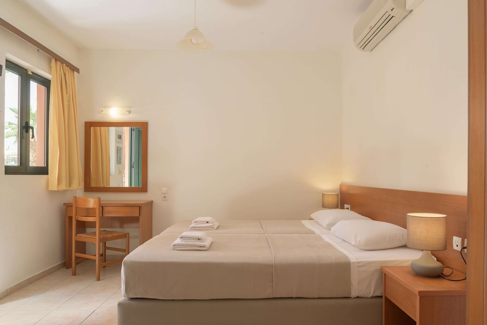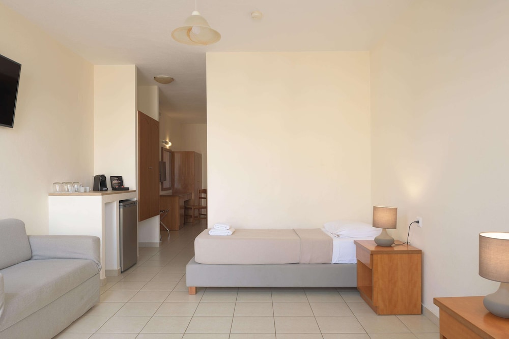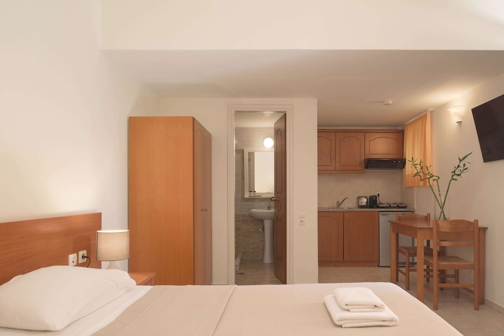 We paid extra for an apt with a sea view and kitchenette, we could only see the sea if we sat on the patio, the room had two small windows, one in the bedroom and one at the front, so it was dark. The bedroom was modern with a flat screen TV but the other room (the lounge) had two more single beds in it plus a small table and three chairs, no sofa and nowhere comfortable to sit. I felt the extra charge for "an apartment " was excessive for what you got. (No toaster, no microvave)