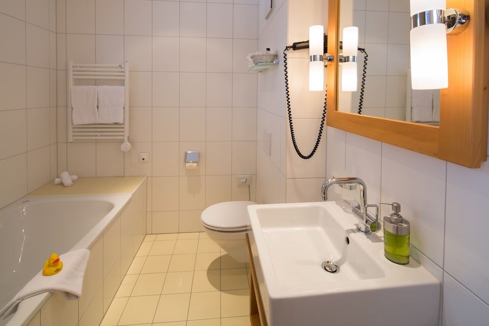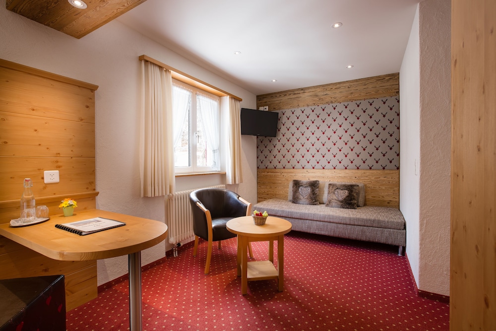 OMG! Stay here. Lovely views in a modern hotel. Our room in the new section was spacious - had a couch, desk and chair and a very large bathroom. A small balcony too with awesome views of the peaks. Robe and slippers. A downstairs area with a small sink, refrigerator, microwave, washer/dryer, boot dryer and ski racks. The hotel had a pleasant restaurant that served indoors and out. We ate every meal there. Good breakfast with some options like oatmeal and eggs. Fantastic bread. Wish we had stayed longer. So much to do - hiking, walking and enjoying the natural beauty of Switzerland.