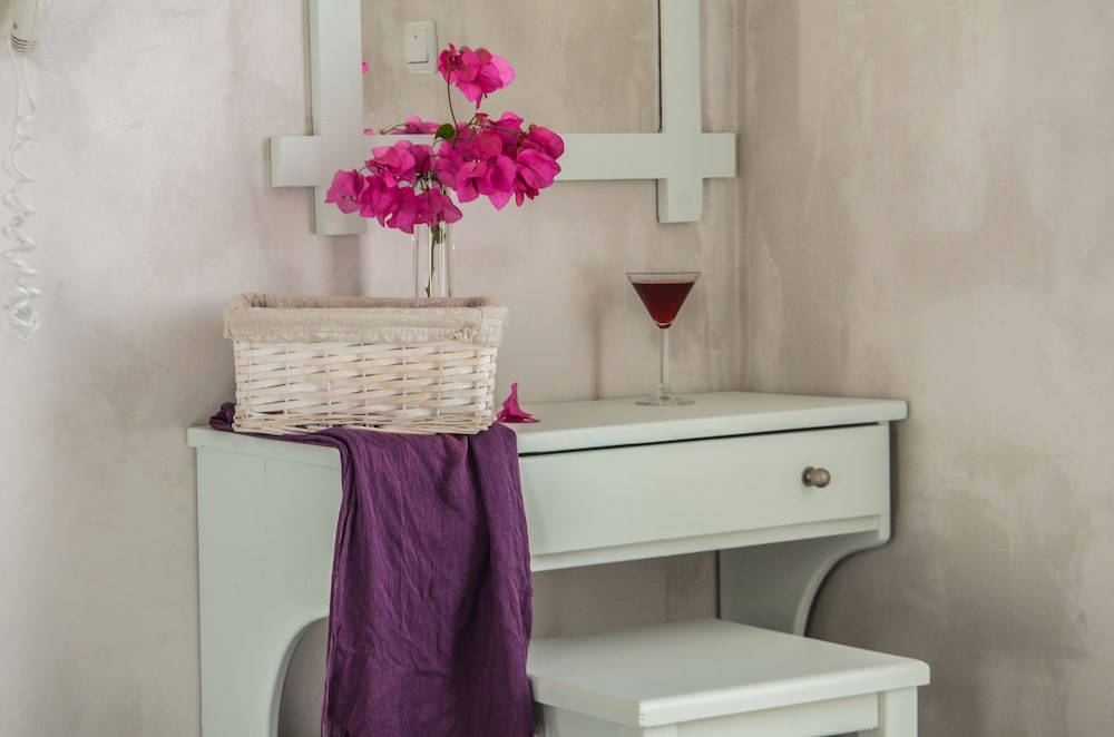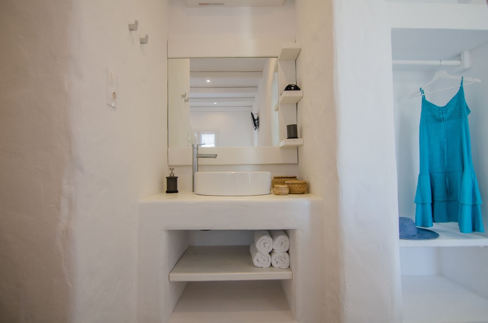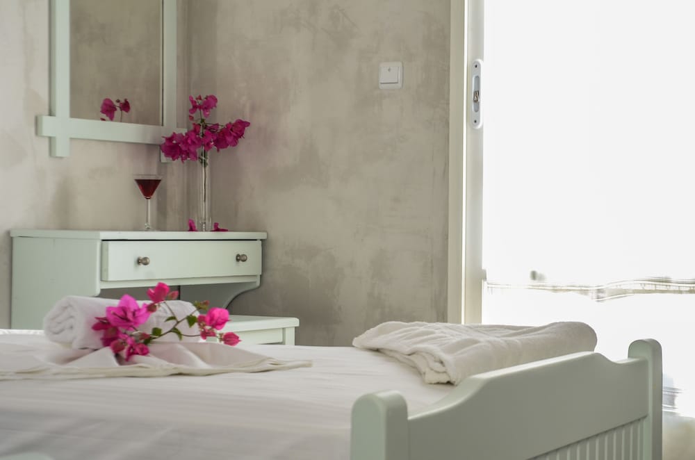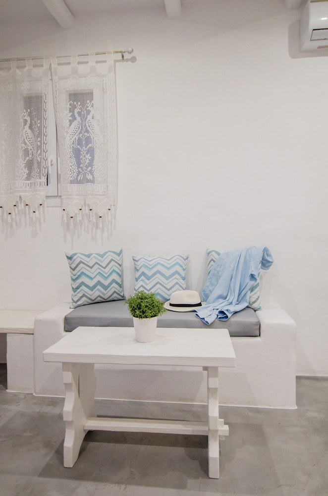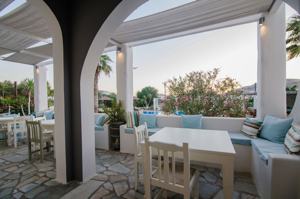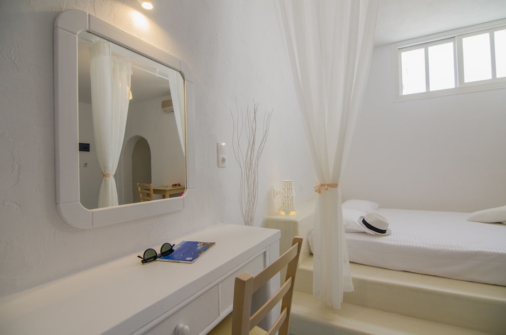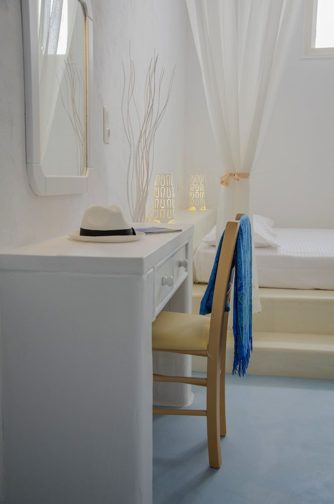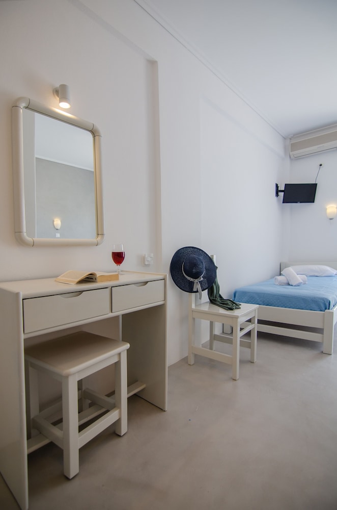 Friendly staff. Very lovely pool area and bar, the room was spacious and clean and the location is excellent; 10/15 minute walk to chora and 5 minute walk to the beach and port.
