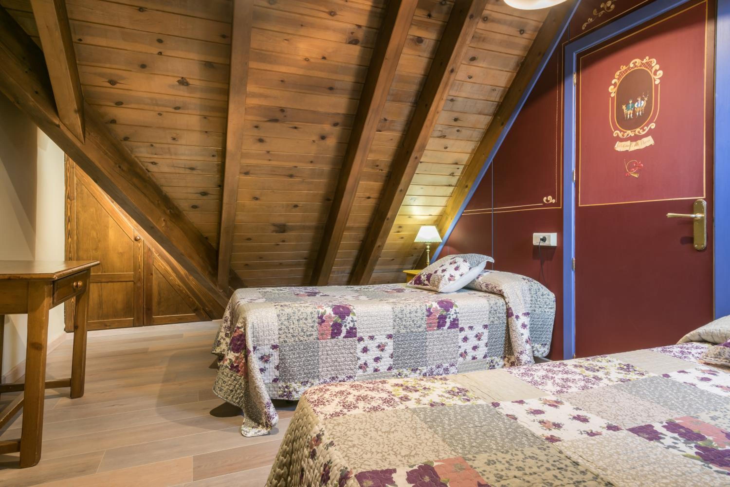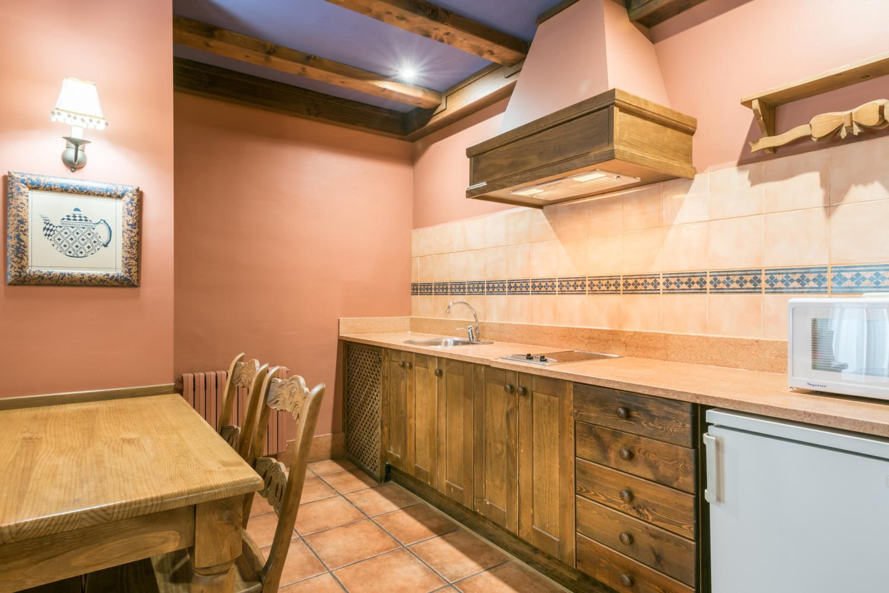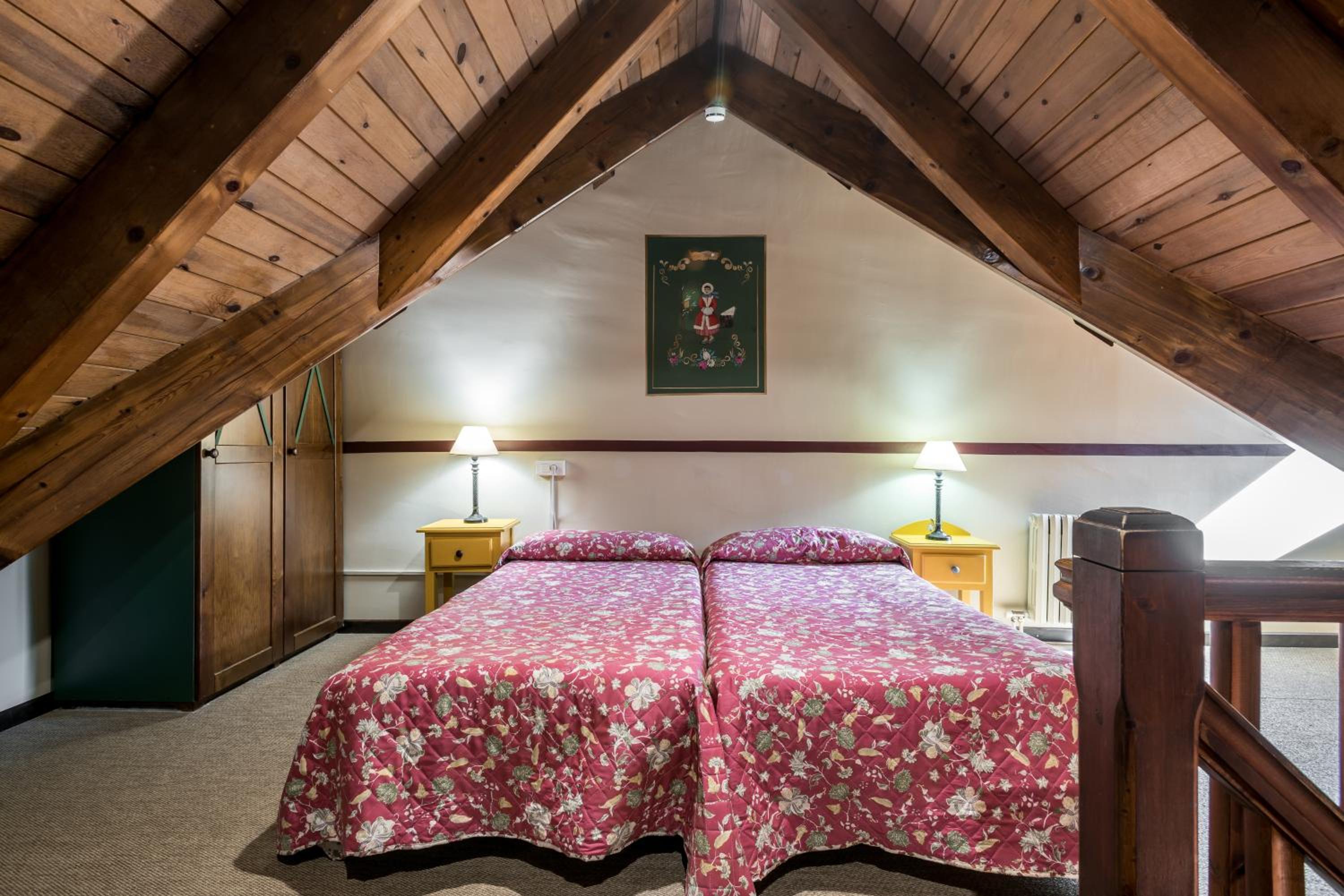 The Alpine-style building with rustic décor and wooden ceilings sets the stage for a cozy stay. Each heated apartment provides comfort with twin beds, a TV-equipped seating area, and a convenient kitchenette.