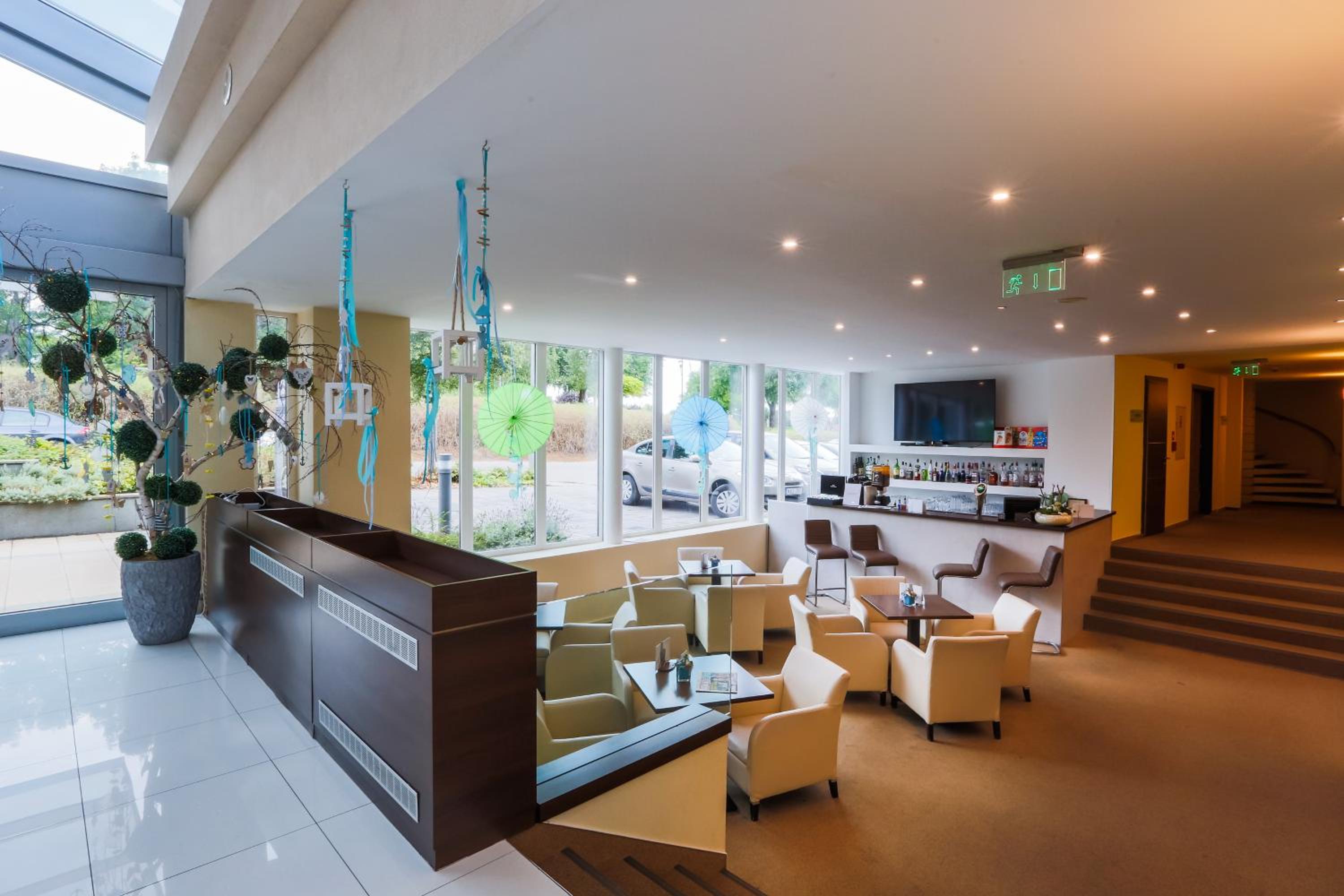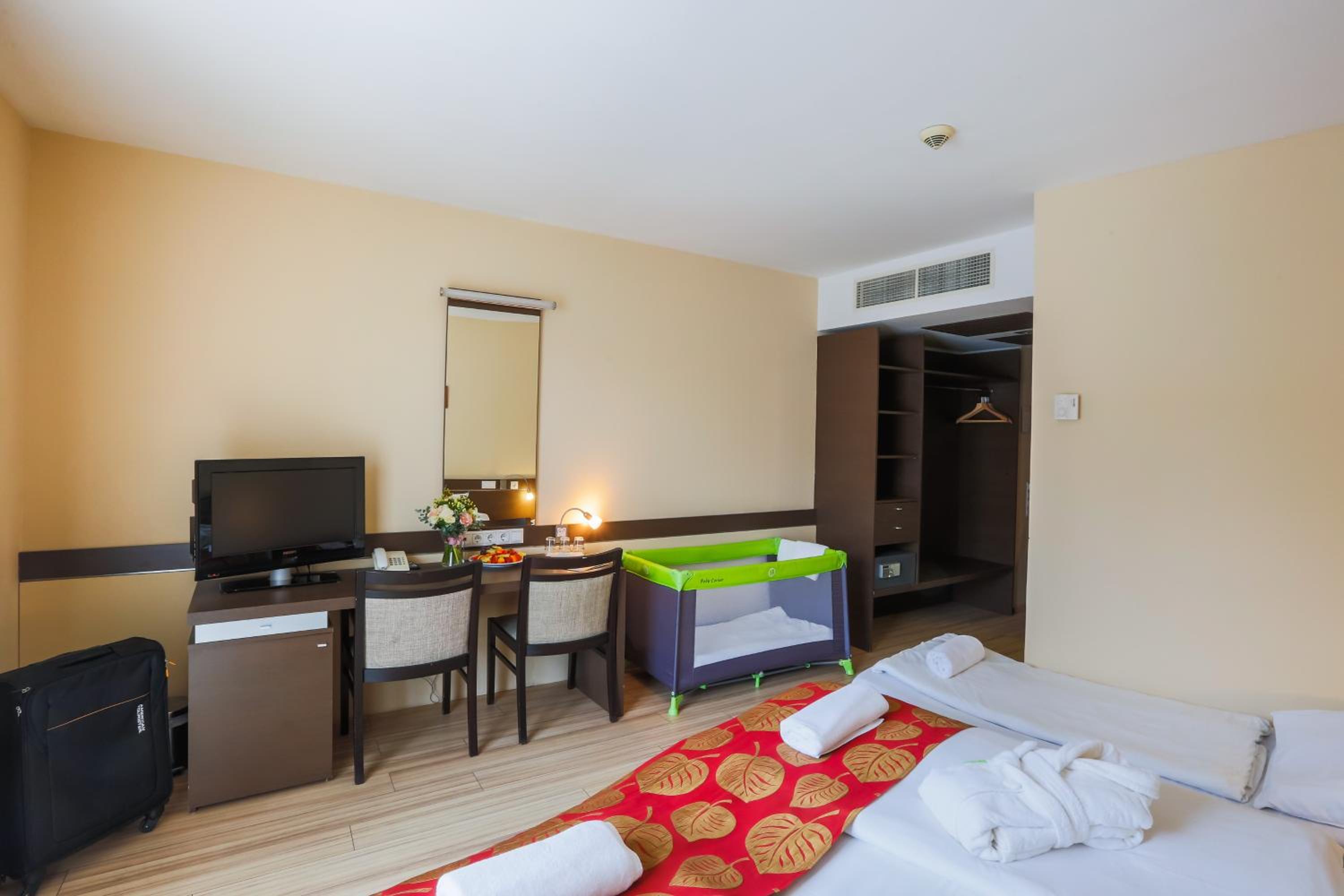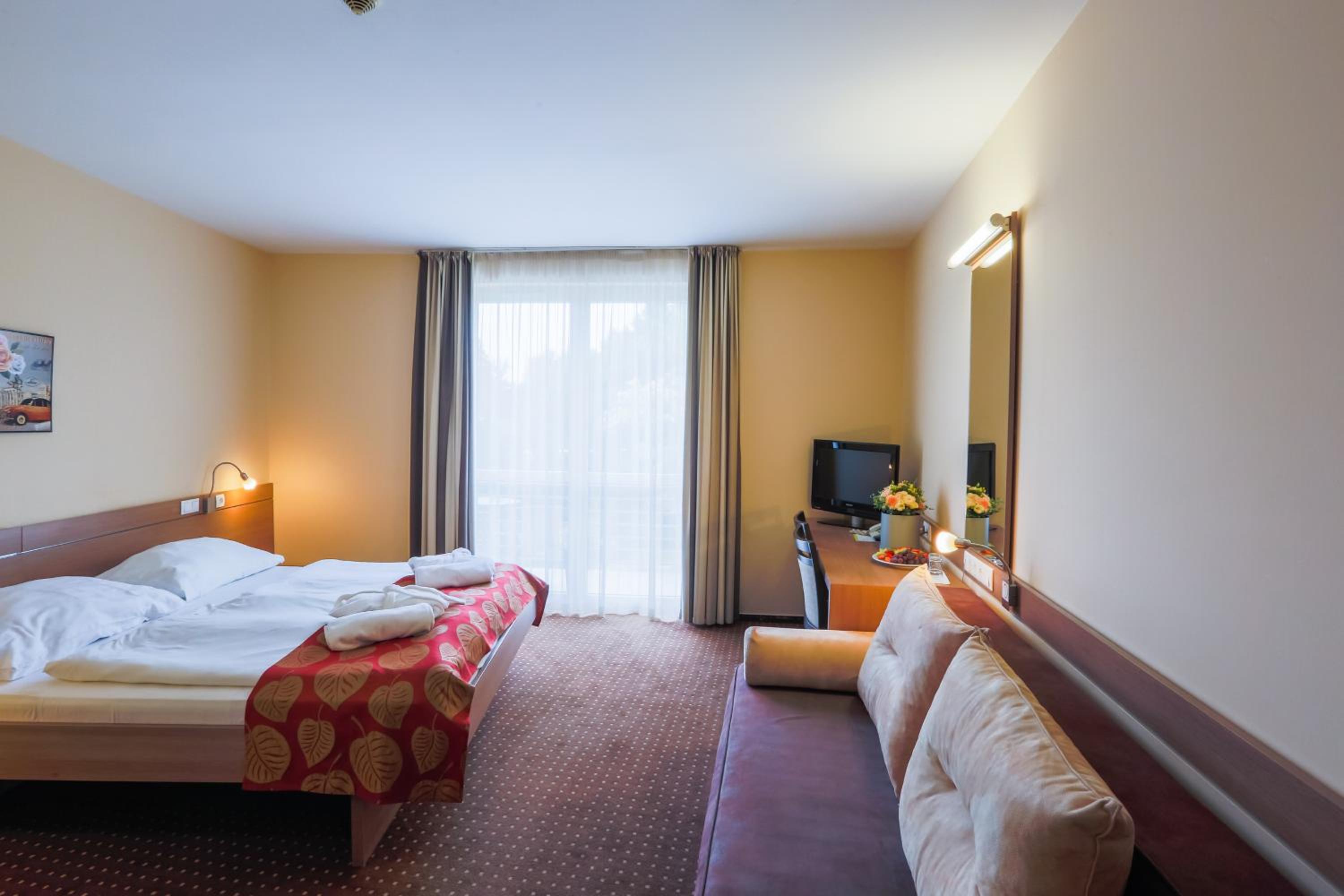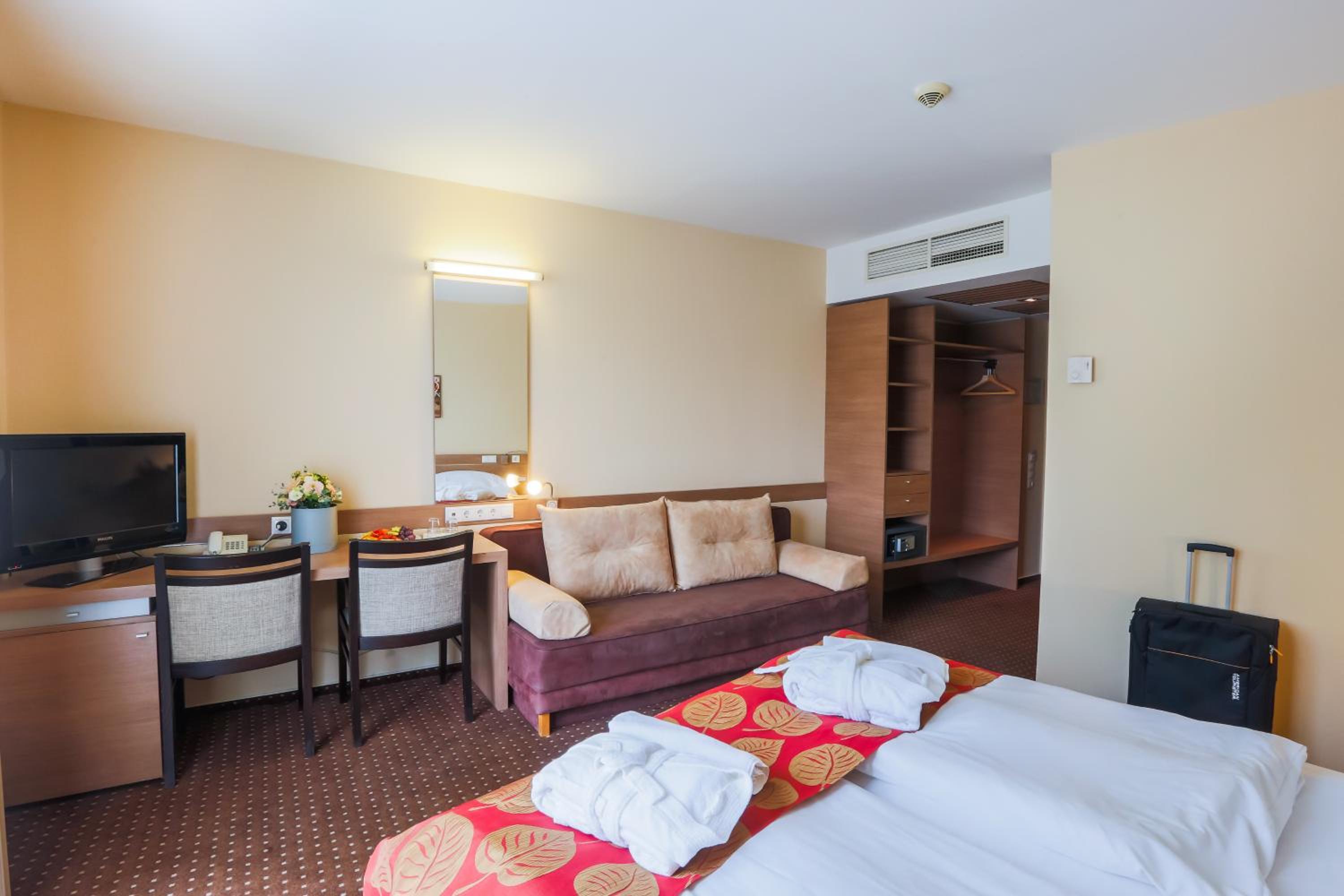 The CE Plaza Hotel in Siófok offers elegantly designed guest rooms with modern amenities including anti-allergenic pillows, flat-screen TVs, and laptop-sized safes. The nightly turn-down service ensures a comfortable stay.
