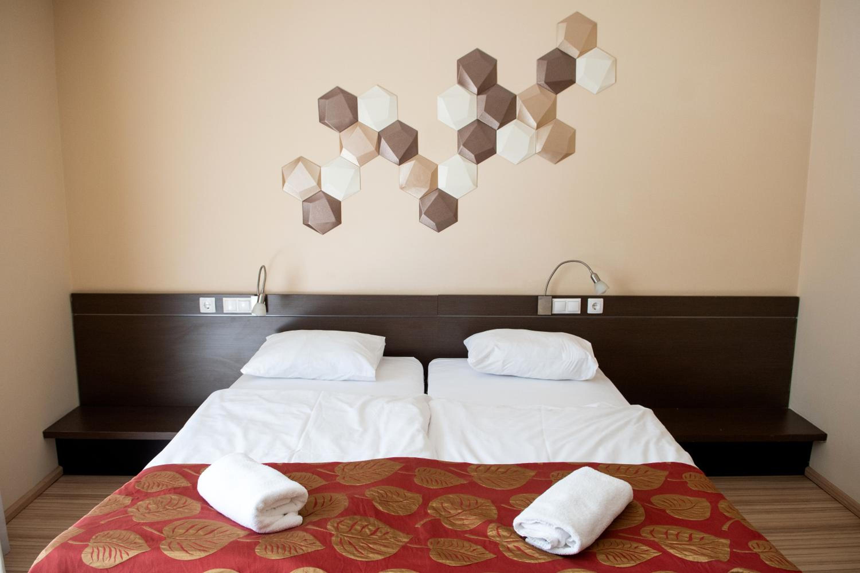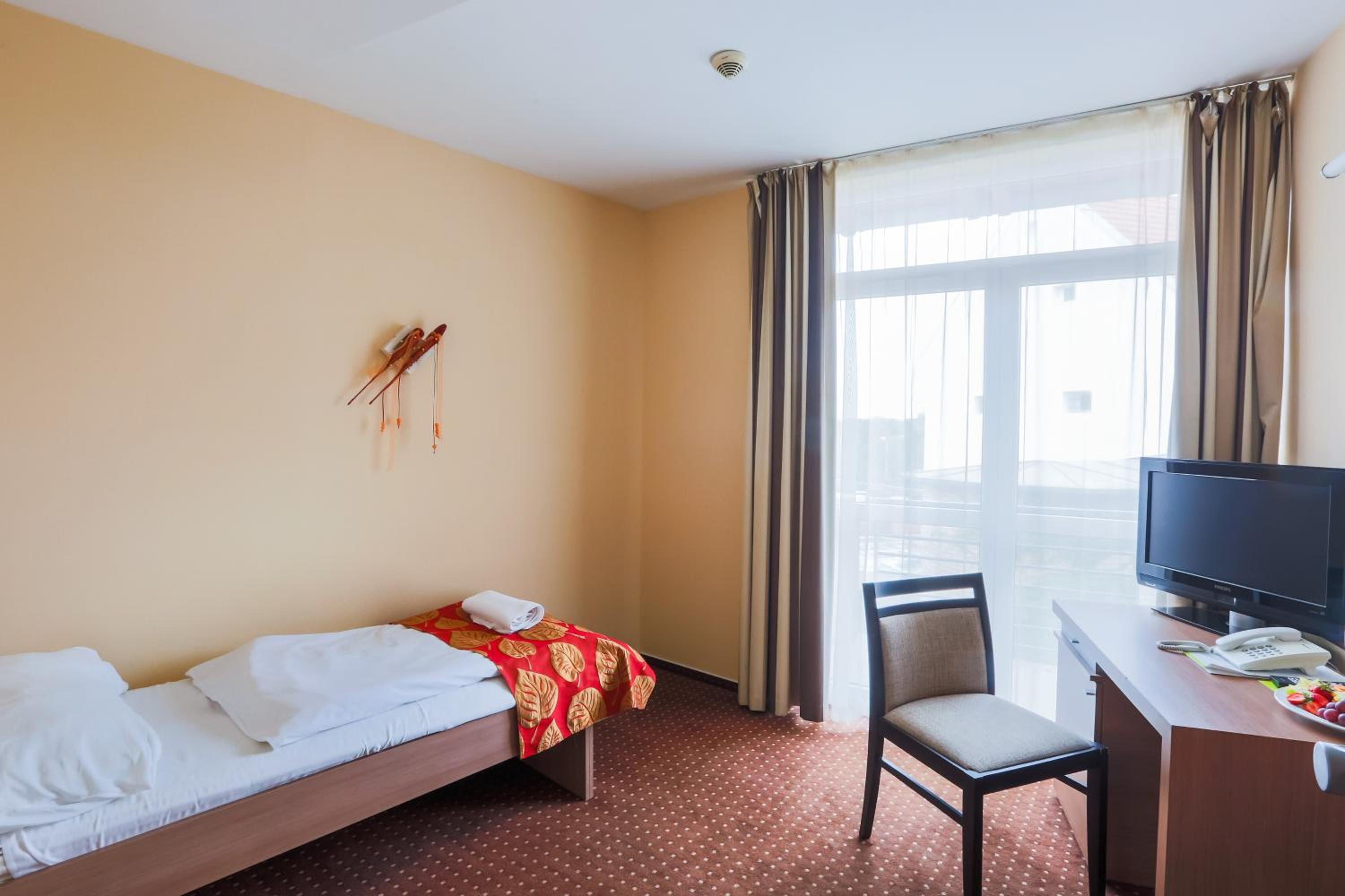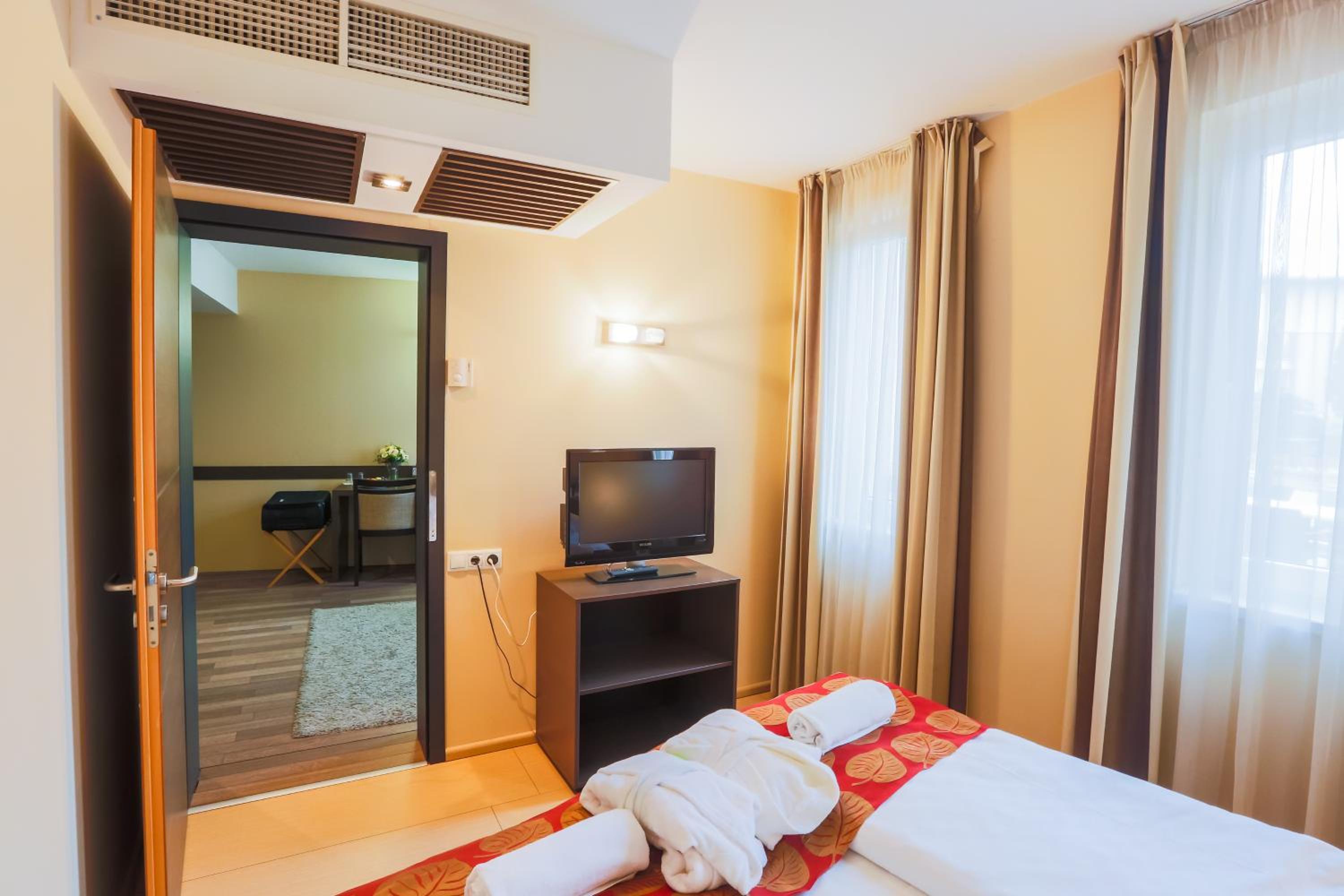 The CE Plaza Hotel in Siófok offers elegantly designed guest rooms with modern amenities including anti-allergenic pillows, flat-screen TVs, and laptop-sized safes. The nightly turn-down service ensures a comfortable stay.