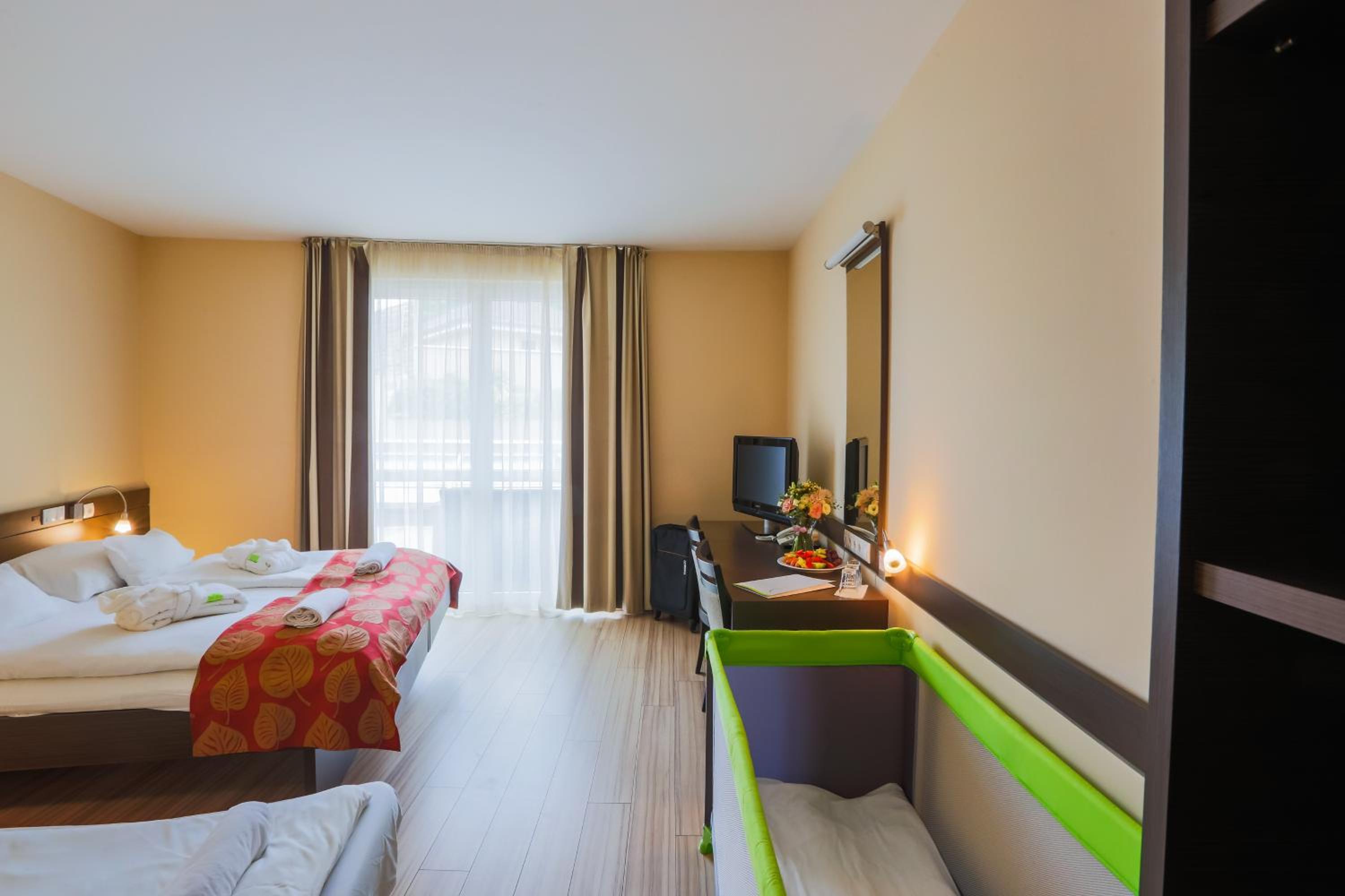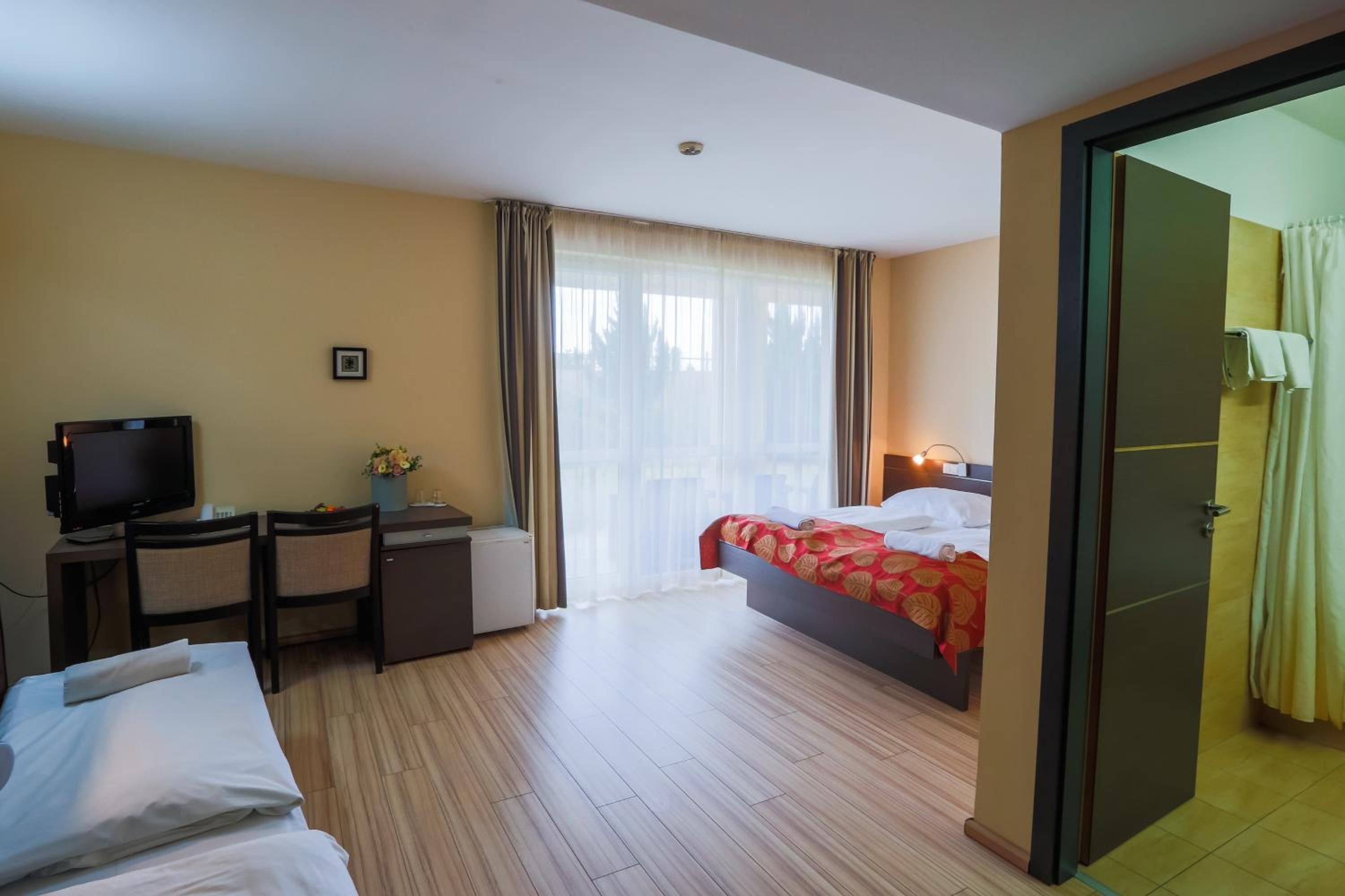 A szobában túl meleg volt (29 fok erkezéskor!), és a termosztátot nem lehetett állítani, csak ki vagy bekapcsolni (ez volt a recepció instrukciója) így nehéz volt kontrollálni a hőmérsékletet, rendszeresen ki kellett nyitni az ablakot.