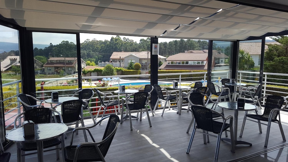 A medio camino entre Sanxenxo y O Grobe, con piscina , buen trato y aparcamiento fácil.