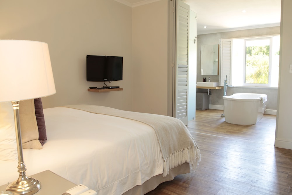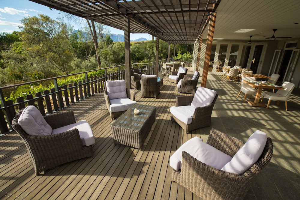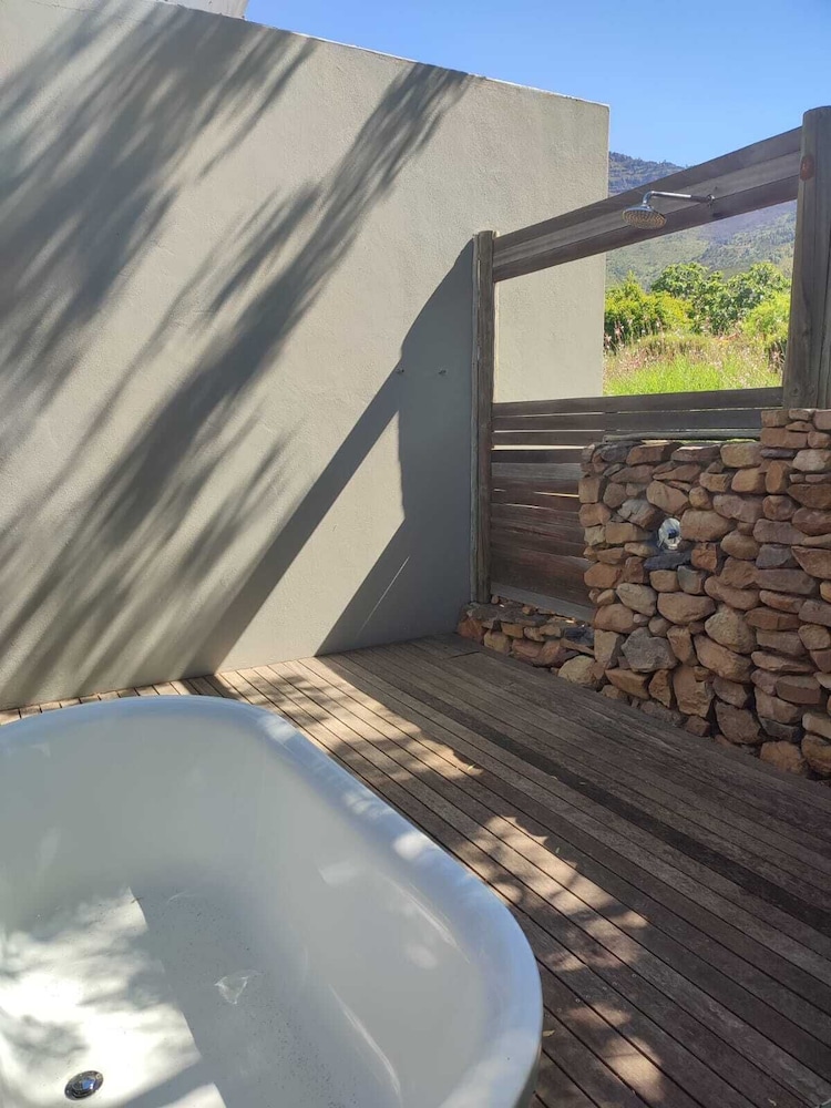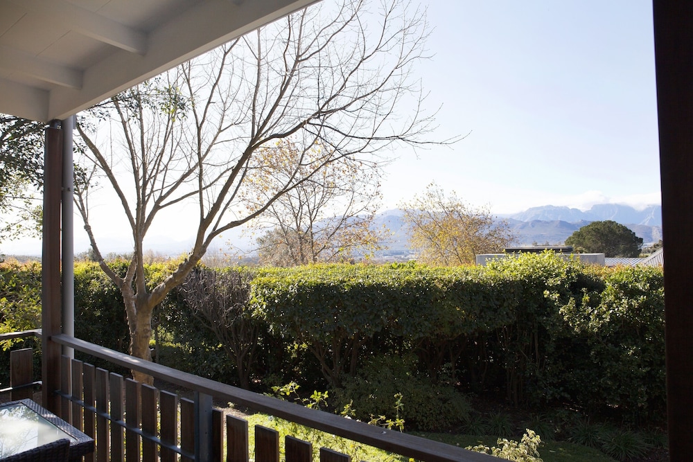 The gardens are wonderful and beautifully maintained. Staff and service absolutely excellent. Our room was fantastic — loved the outside shower! Only negatives are: evening meal was disappointing - we ate so well at truly great restaurants nearby (fine dining at Babel, and Tokara, great pizzas at Alloroa) that out one night eating in was poor by comparison. Breakfasts were very good, though. Also, noise from building works on the estate spoiled the ambiance. Much better on Saturday when worked had stopped!