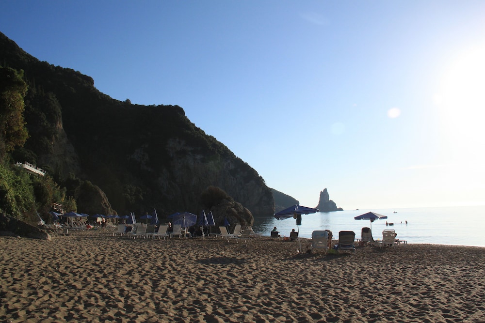Strand an Beachbar nicht Sand wie auf dem Foto sondern Steine, alles sehr einfach. Frühstück sehr einfach, Abendessen wurde am Tisch serviert. Es gab eine Suppe und Hauptmahlzeit. Mitarbeiter alle sehr nett und hilfsbereit. Nix für Leute die nicht gut zu Fuß sind. Jeden Tag Berg runter zum Frühstück und Strand und später wieder steil bergauf. Aussicht vom Balkon hat jedoch für vieles entschädigt. Unbedingt Ausflug nach Corfu Stadt machen. Wunderschöne Stadt am Meer.