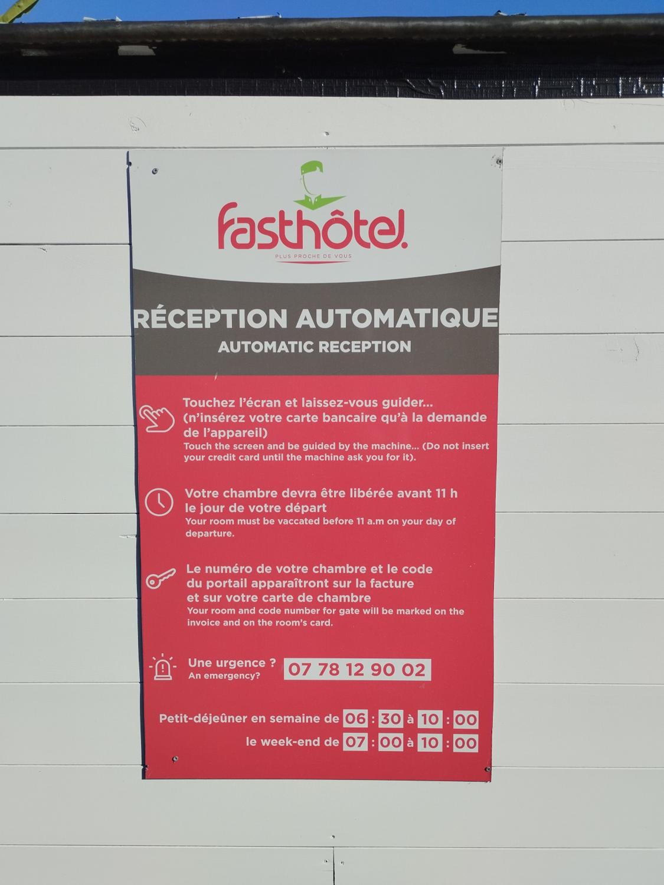 Je suis arrivé en pleine nuit, la borne d'accueil n'a pas fonctionnée, mais après un appel téléphonique, un gardien est venue sur place pour faire entrer ma voiture et me donner les clefs de la chambre.