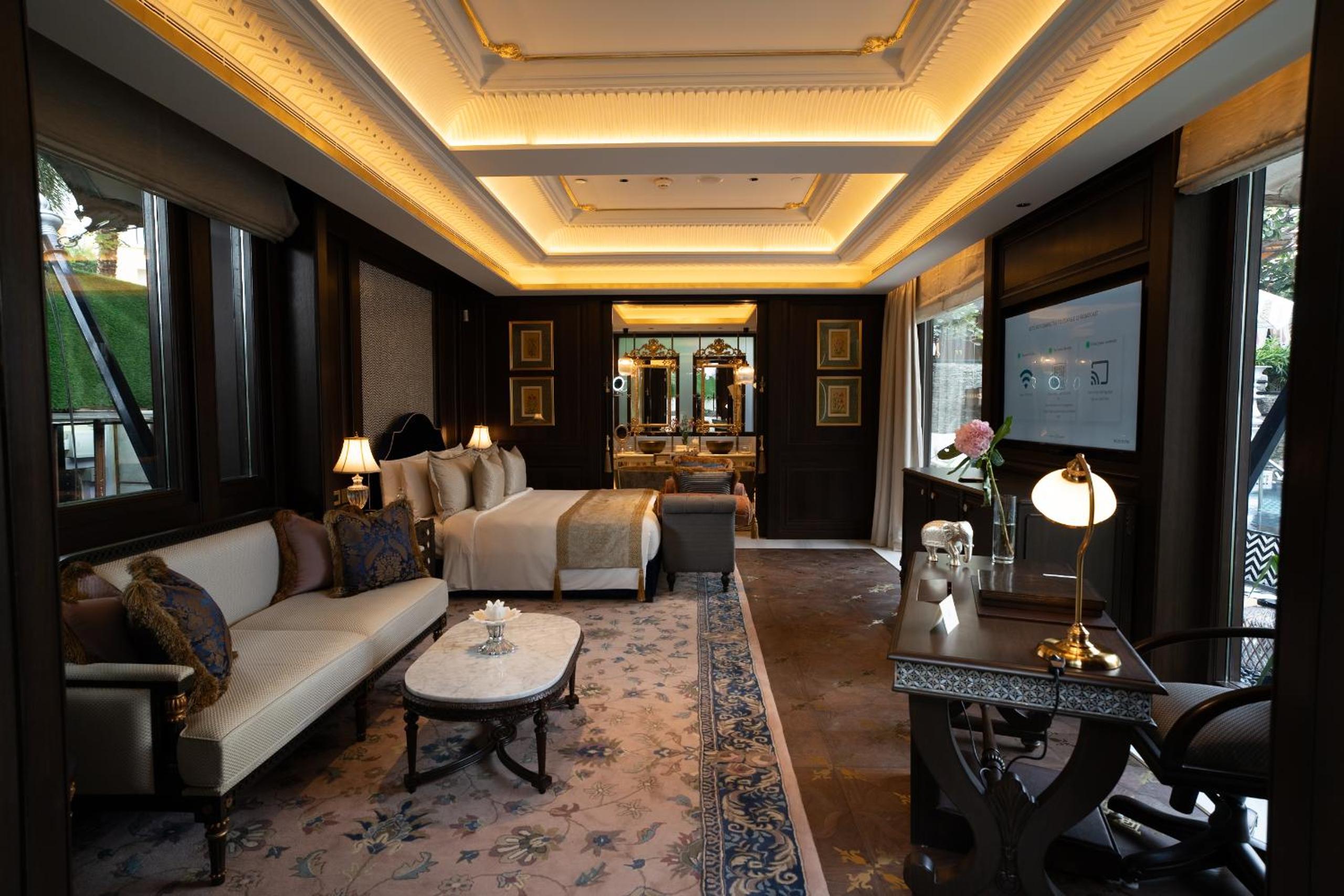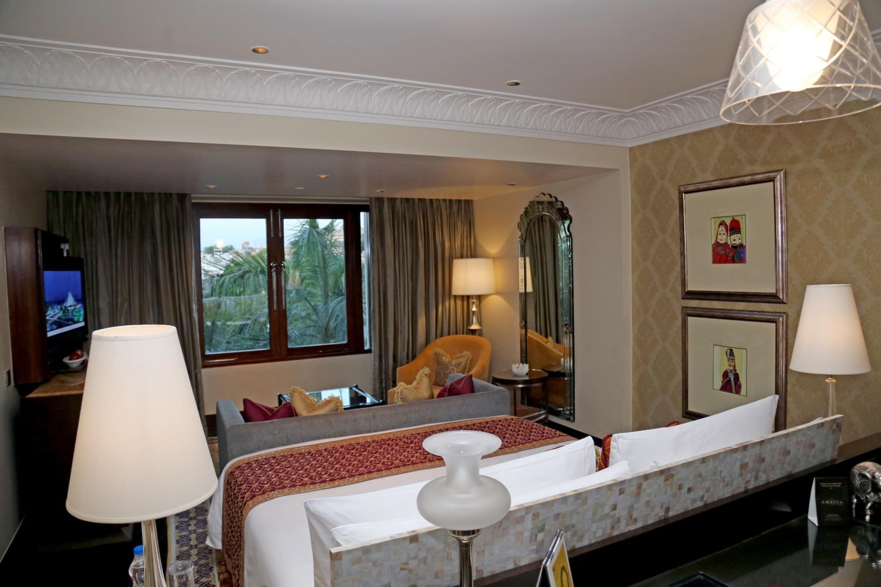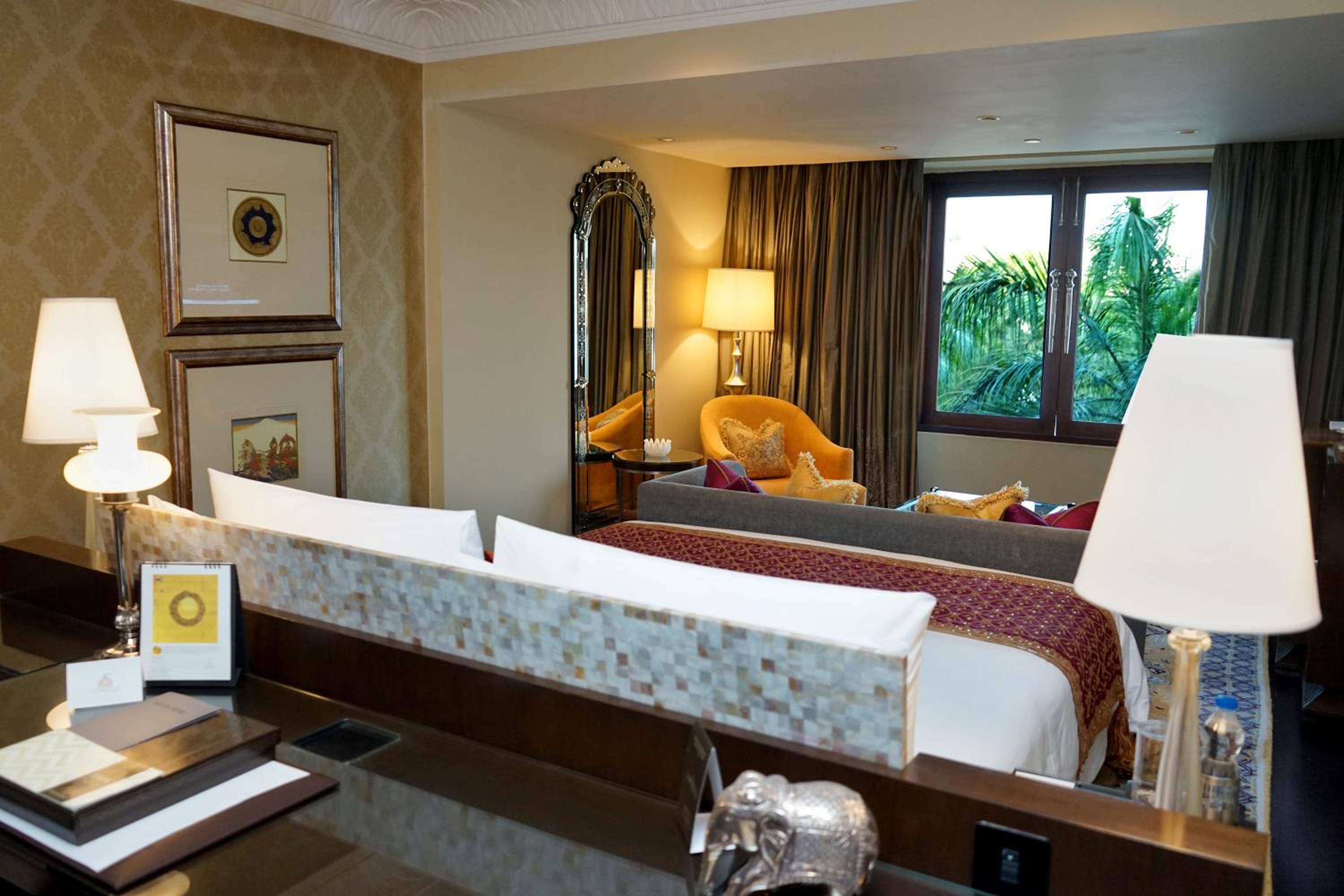 Experience luxury at The Leela Palace Udaipur, where every room offers stunning views of the City Palace or Lake Pichola. The rooms, adorned with local artwork and Indian carpets, provide a lavish retreat with modern amenities like flat-screen TVs and marble bathrooms.