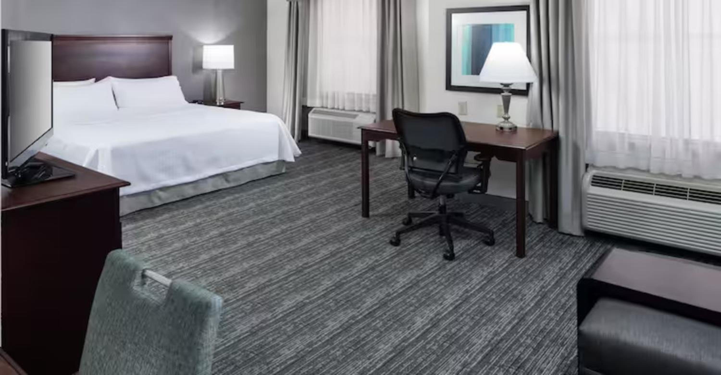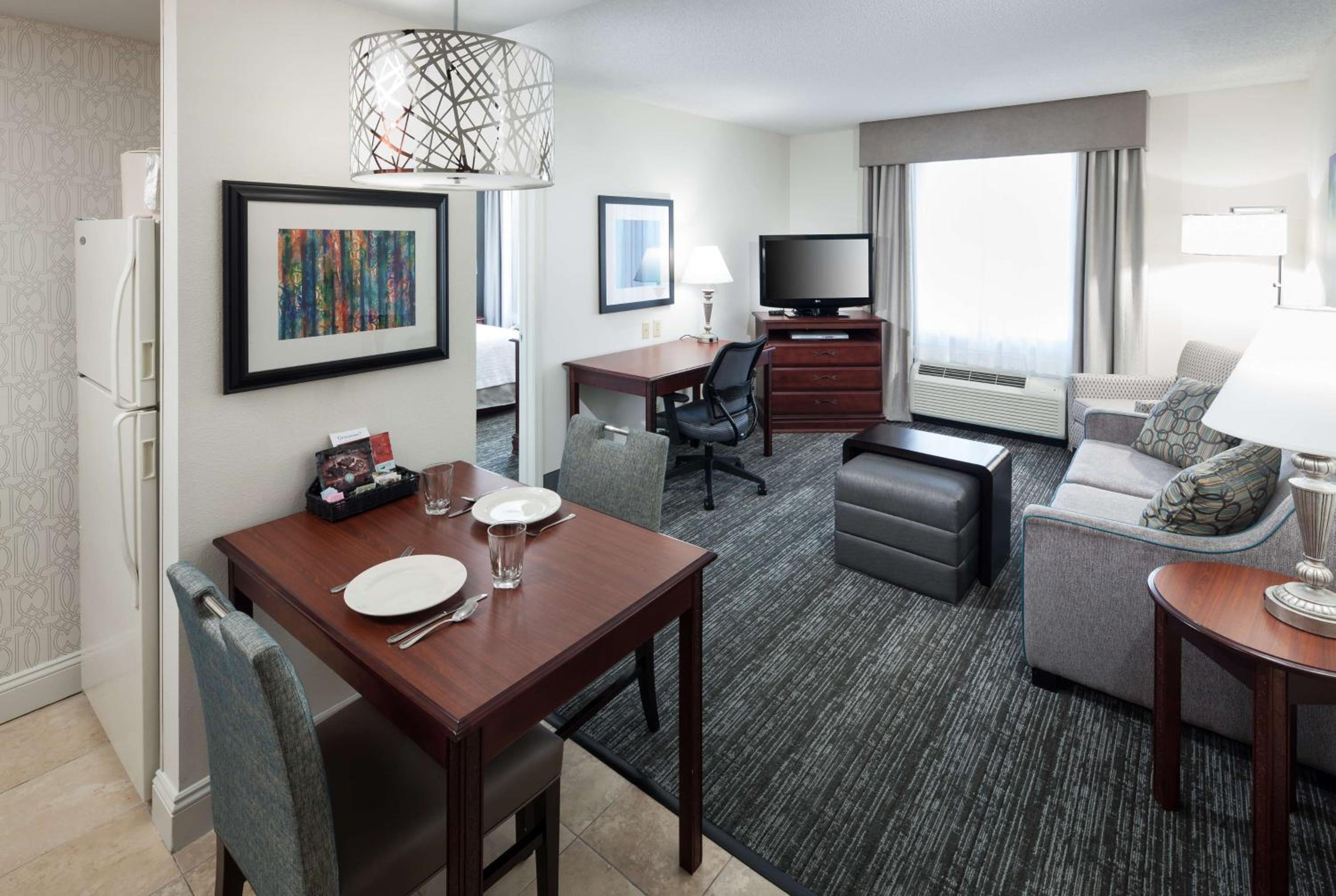 Indulge in the comfort of spacious suites at Huntsville Homewood Suites, each equipped with a kitchenette and modern amenities such as a dishwasher and flat-screen TV.