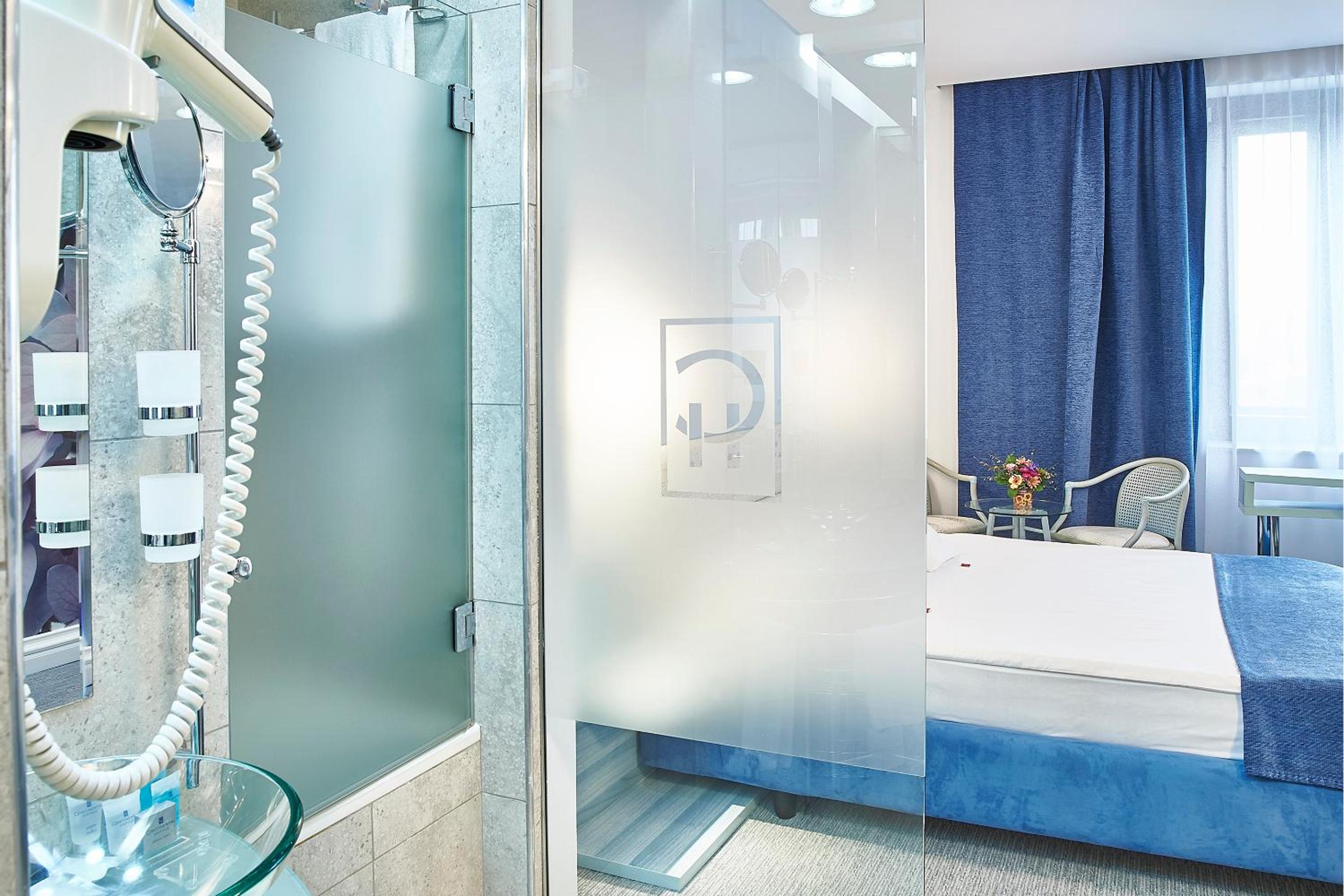 Санузел отделен от кровати матовым стеклом. Это стильно выглядит на фото, но в реальности неудобно. Стены и дверь находятся прямо у кровати. Матовое стекло хоть и скрывает детали, но силуэт виден, а свет и звуки слышны/видны полностью. Если один встает ночью, просыпается второй. Стекла на окнах грязные и какой то запах в номере, вроде как из туалета так как дверь не закрывается плотно