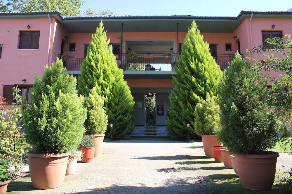 These attractive, compact, well equipped self catering apartments are close to the picturesque old bridge of Konitsa, in the lower part of the town. They have good wifi, a friendly owner, a lovely garden, balconies in three directions ( first floor apartment) and good parking. They are is easy to find if you start from the river bridge which crosses the main E 90 (local road number 20) at the south end of the town. Going north, take the first right, signposted to Health Centre and old bridge and then turn immediately right ( no more than 20m), with a wooden signpost saying Artemis in Greek letters ( a bit like APTEMIZ); you can then see the apartment block after about 30m on your left- it is the pink two storey building with wooden shutters and tables outside. lat/ long coordinates; N 40.04103; E 020.74327; at 452m above sea level. If approaching from the North by pass the town and go down to the bridge first. It is a 2 km walk uphill along a zig zagging residential road to the pleasant town centre with restaurants, and shops. The inside decor is a little dated, but it is very clean, well maintained and equipped. We struggled to find the place with google maps and asked at a garage, whose helpful staff guided us on their motorbike and phoned the owner, who arrived in less than 5 minutes. Buy petrol here as it can be hard to get elsewhere if travelling onwards.