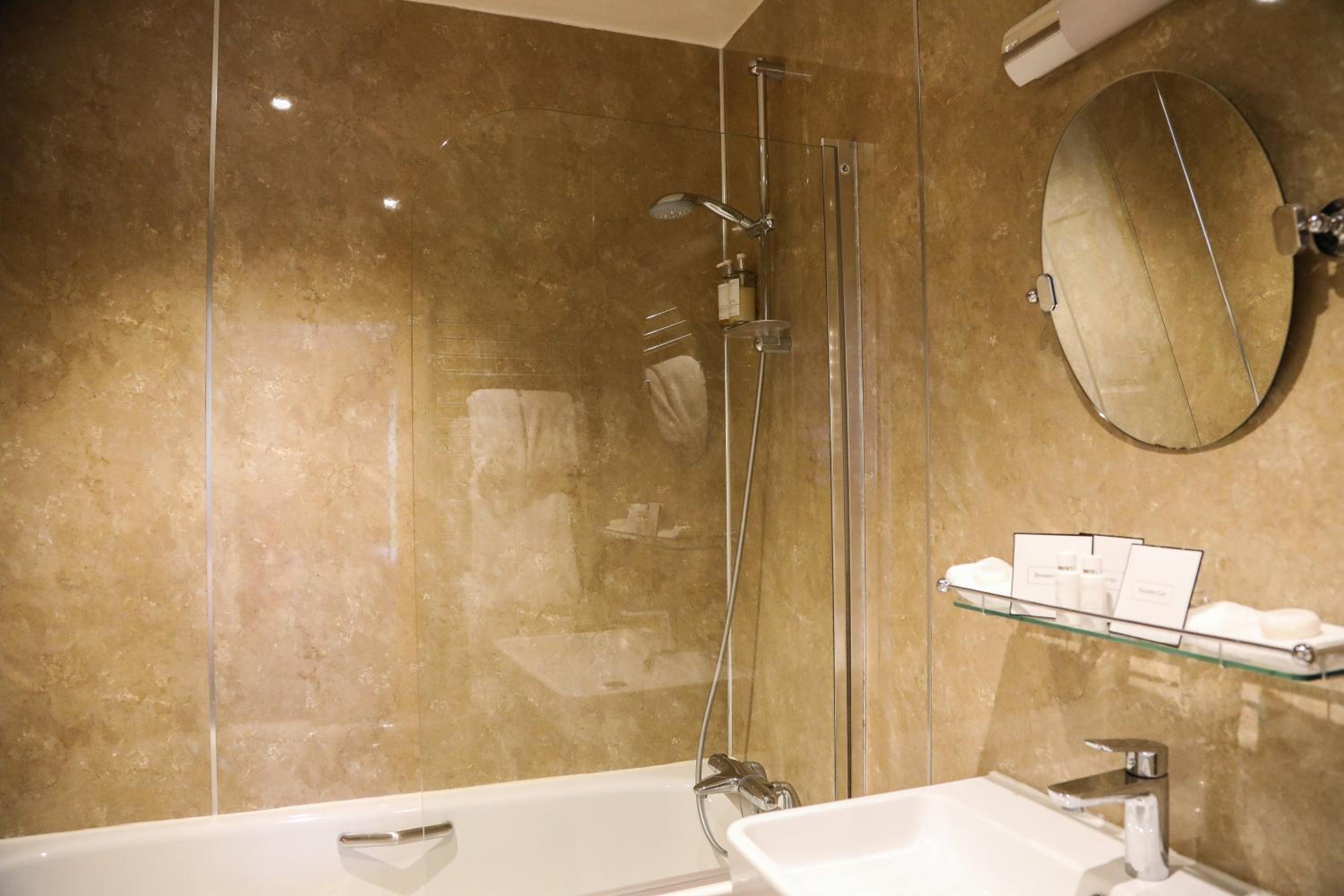 Bath in room. Mattress questionable. Pillows needing updating. Bathroom unworkable and dated. Receptionist not suited to front of house role.