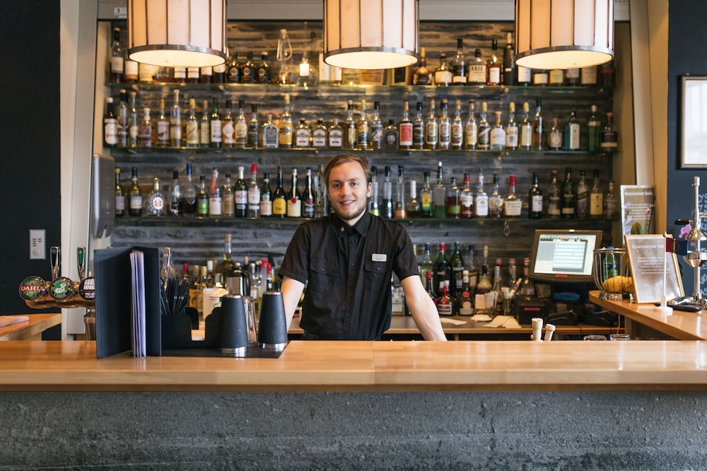 Koselig lobbyområde med bar og matservering.