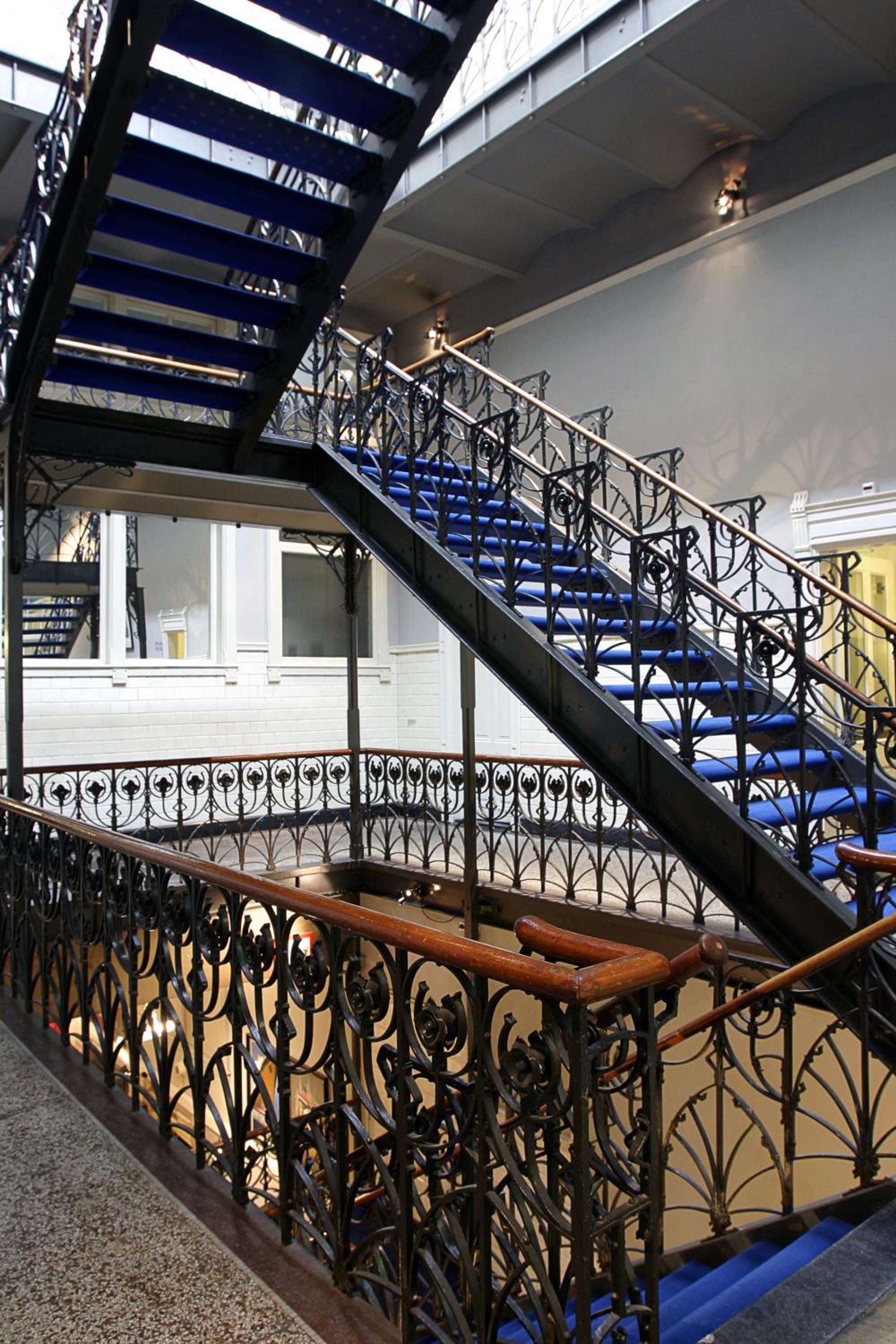 The hotel rooms at Hotel New York are a blend of charm and comfort, each uniquely shaped and decorated in vibrant colors. With high ceilings and ample space, every room offers a cozy retreat. Enjoy modern conveniences like air conditioning and complimentary Wi-Fi during your stay.