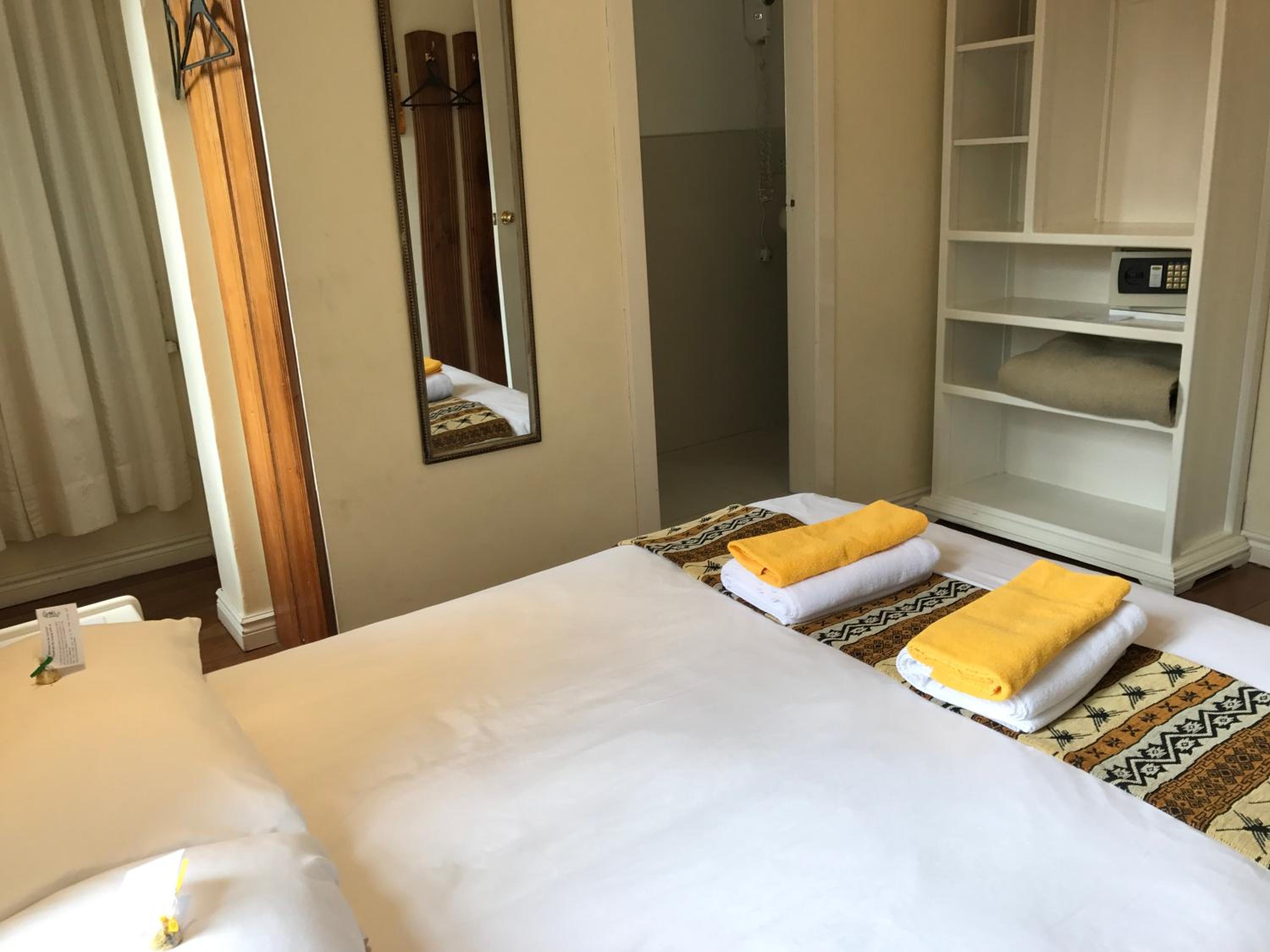 The rooms at Cayman Hotel offer a comfortable retreat with wooden floors and modern amenities. Guests can unwind in the communal living room with a fireplace and satellite TV, perfect for relaxing after a day of exploring.