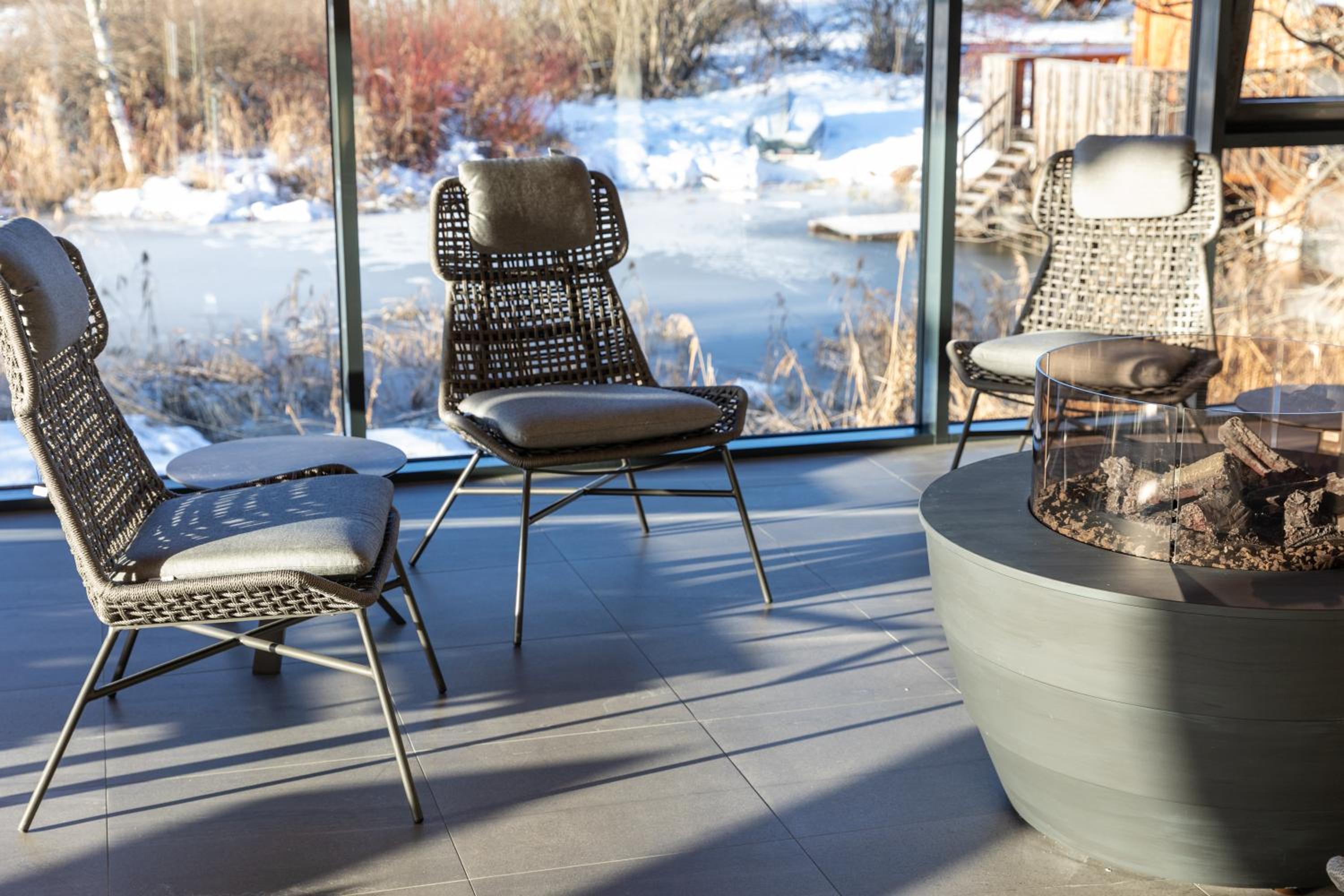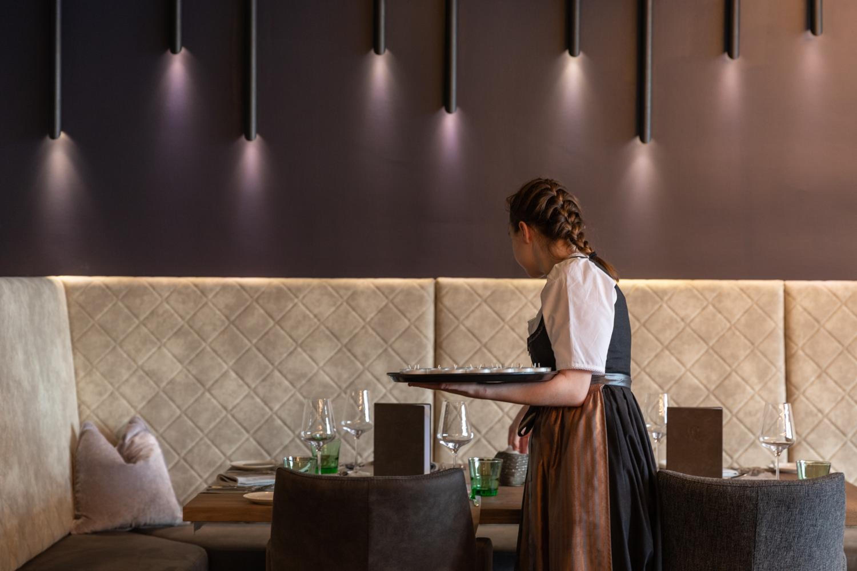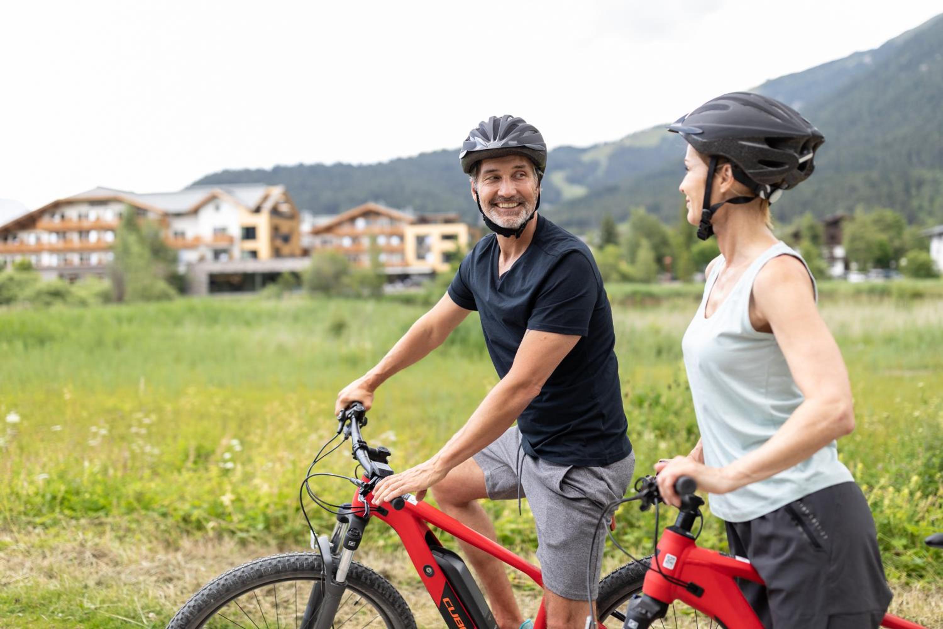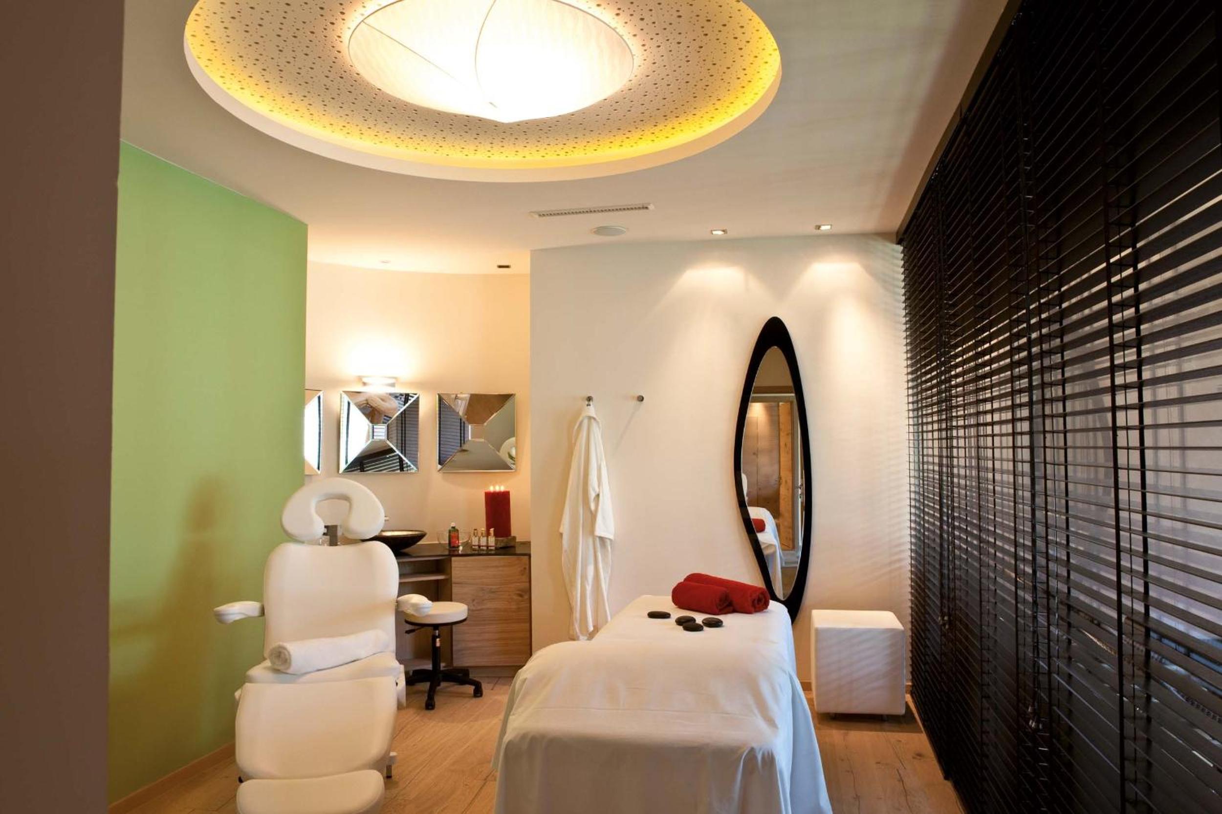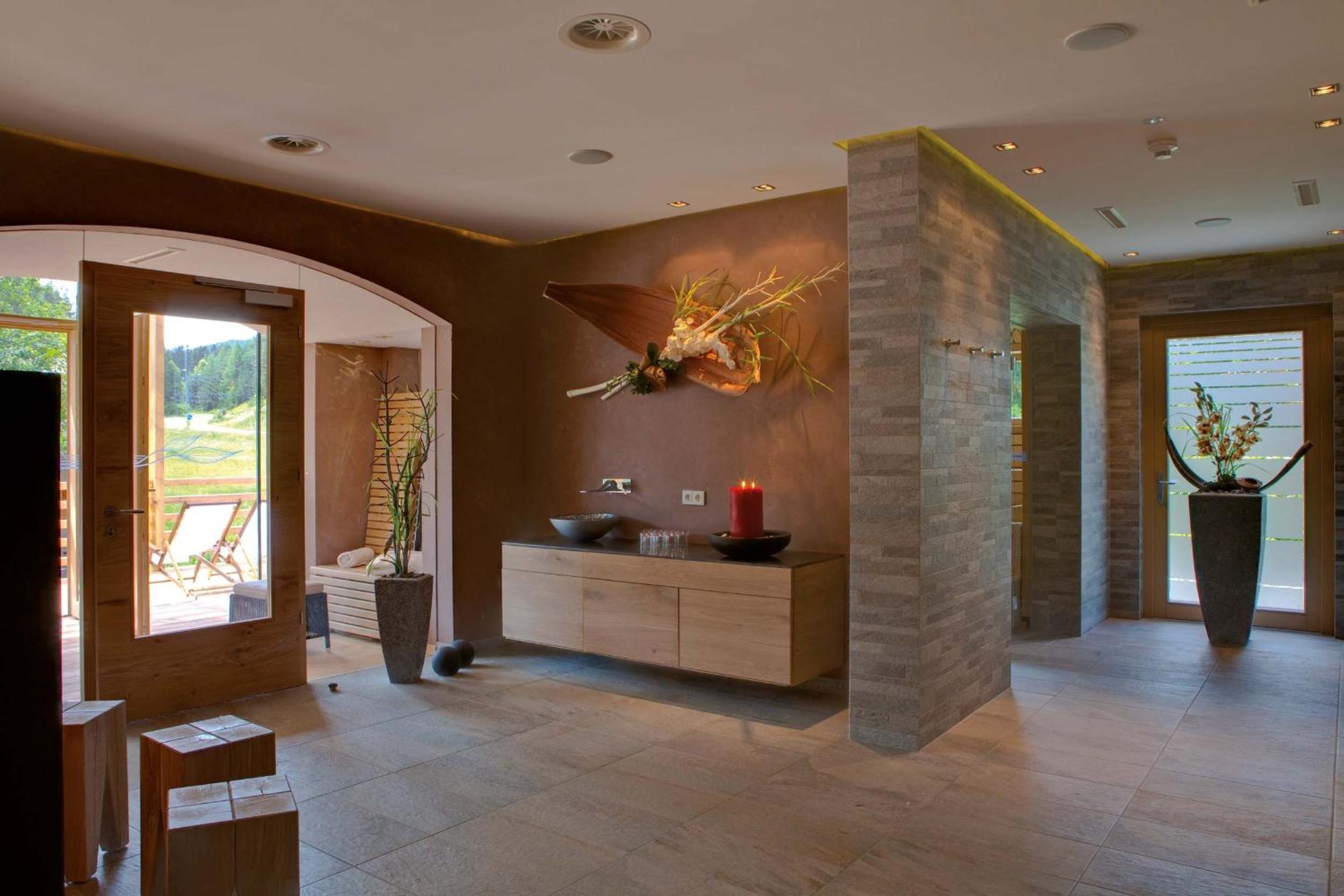 Unwind in the hotel's wellness area featuring indoor and outdoor pools, sauna cabins, and rejuvenating treatment rooms. After a day of skiing or cycling, relax in the tranquil relaxation rooms or savor healthy snacks and drinks.