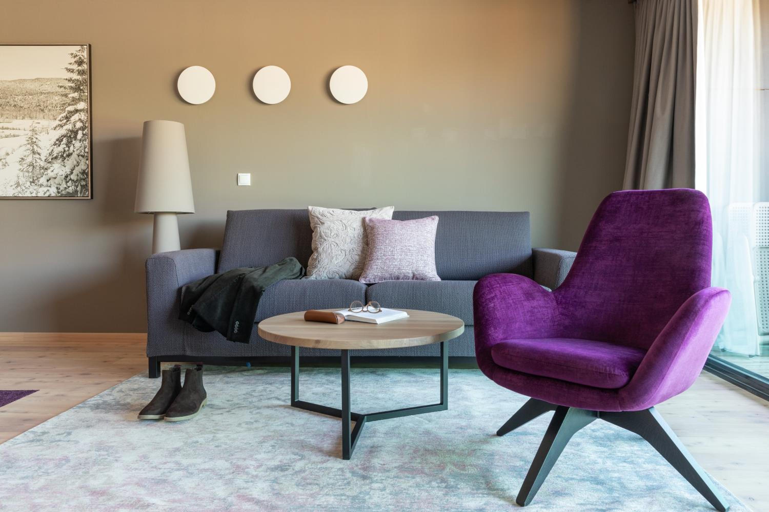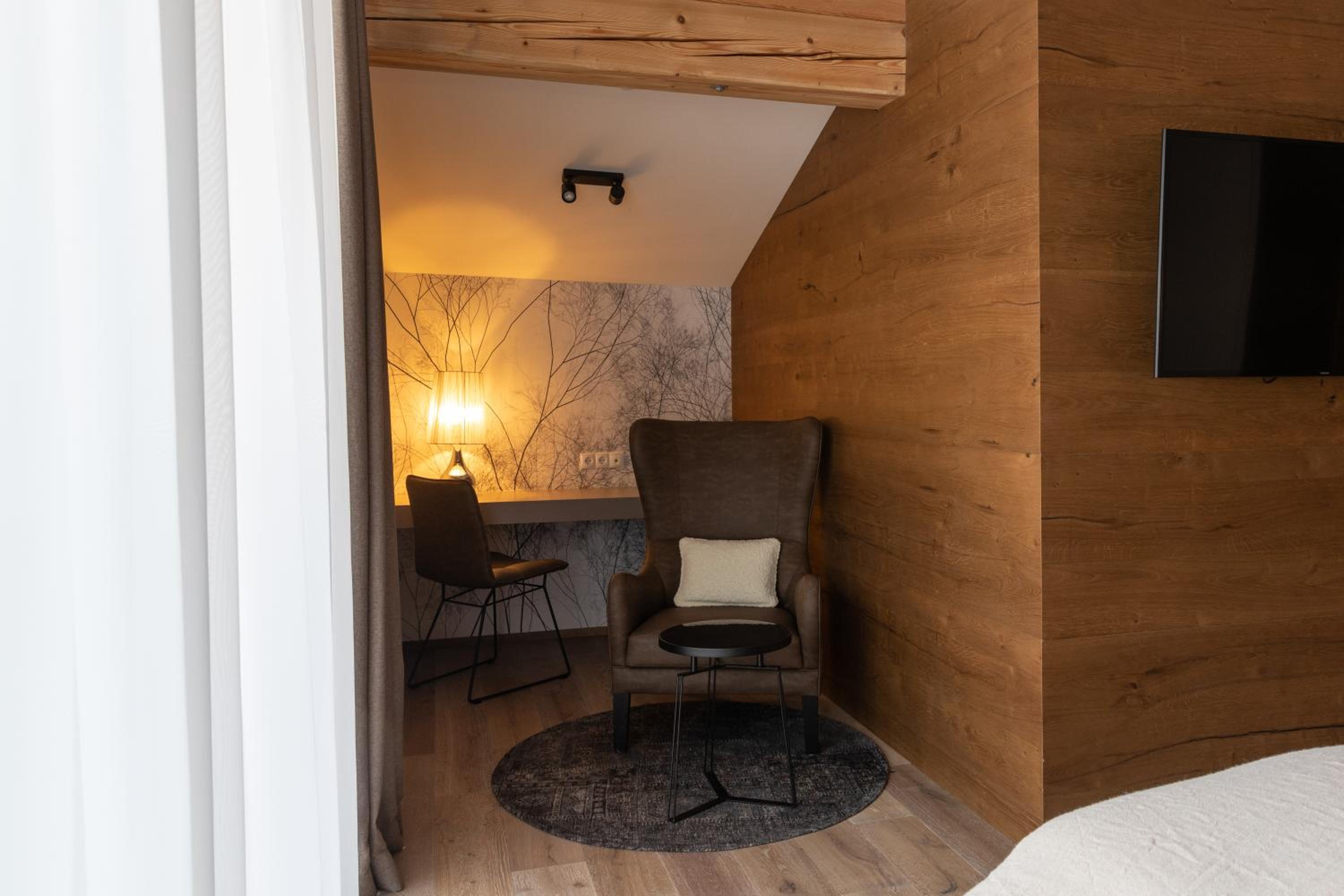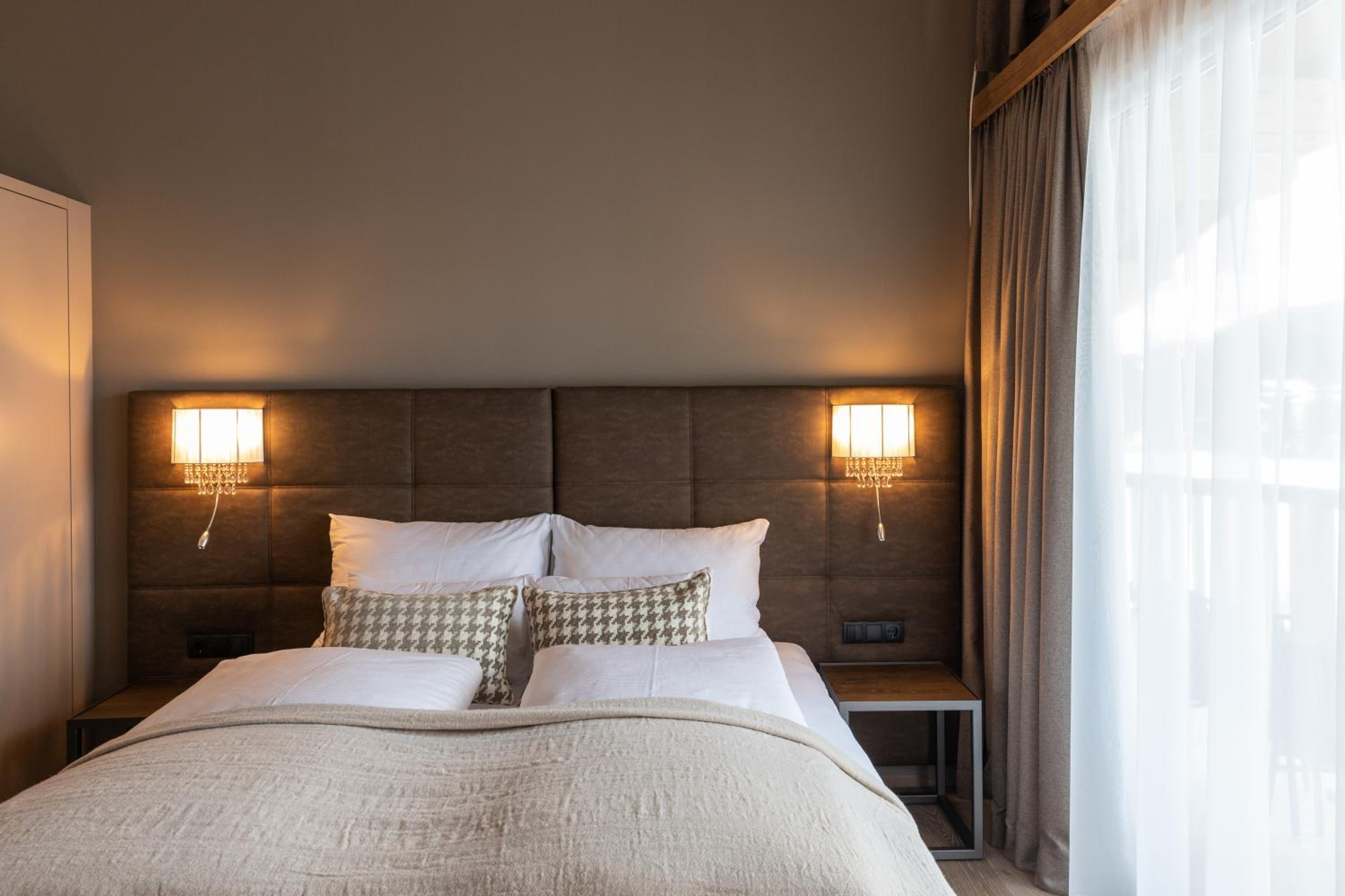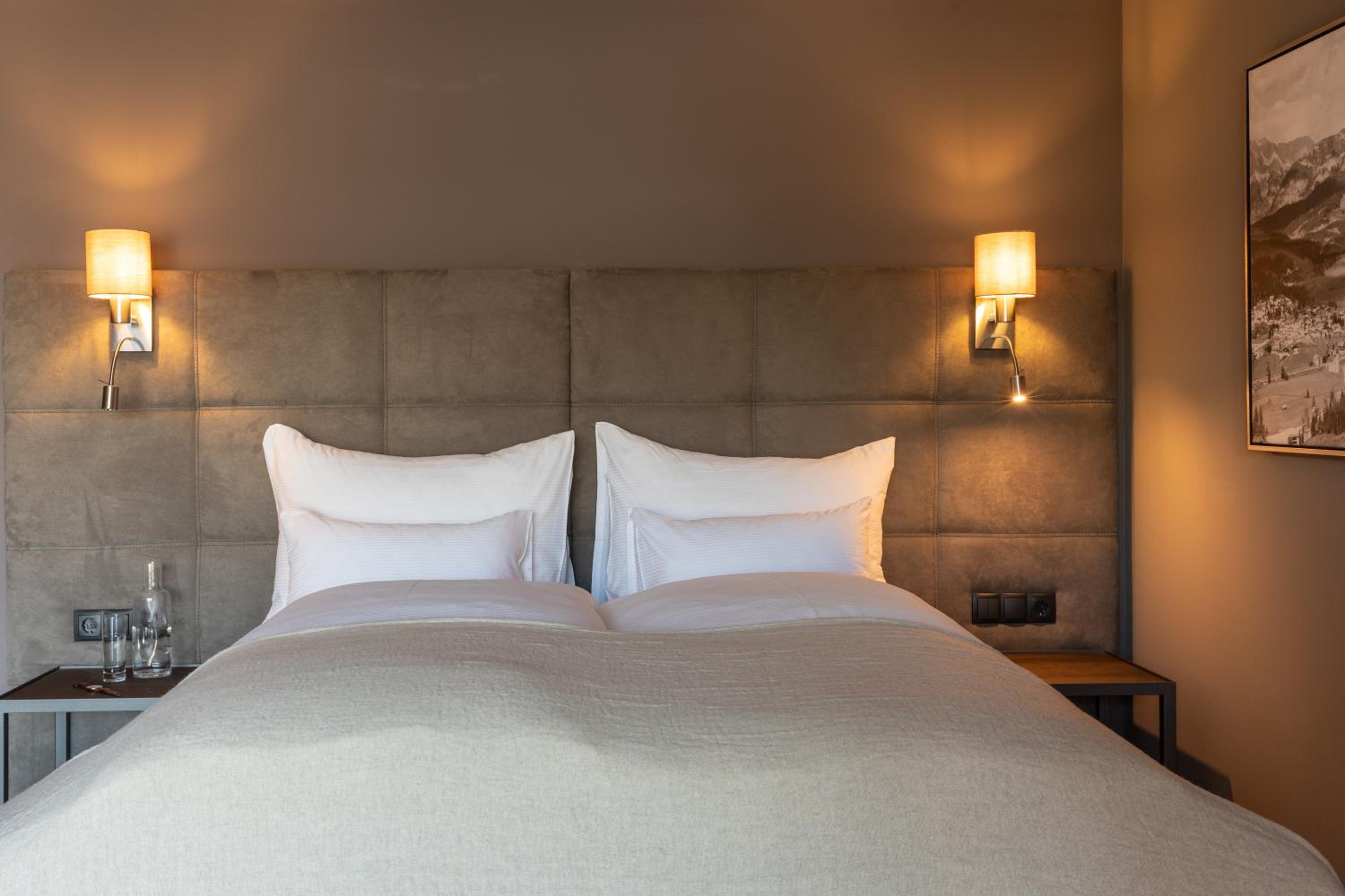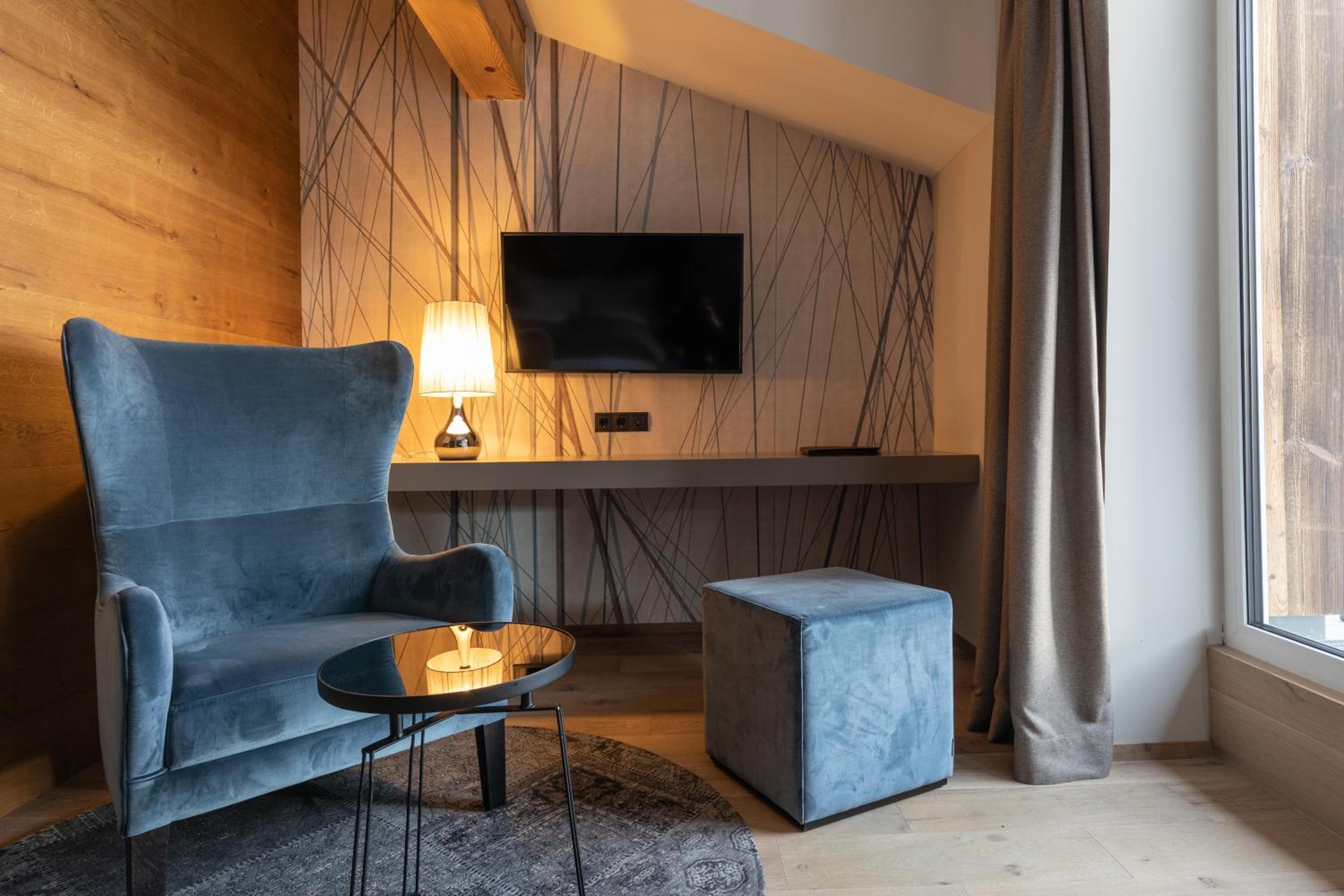 Indulge in the cozy Alpine-style guest rooms, each adorned with bright wood furnishings, a seating area, and a flat-screen TV. Wake up to stunning views and enjoy modern amenities like a coffee machine, ensuring a comfortable stay.