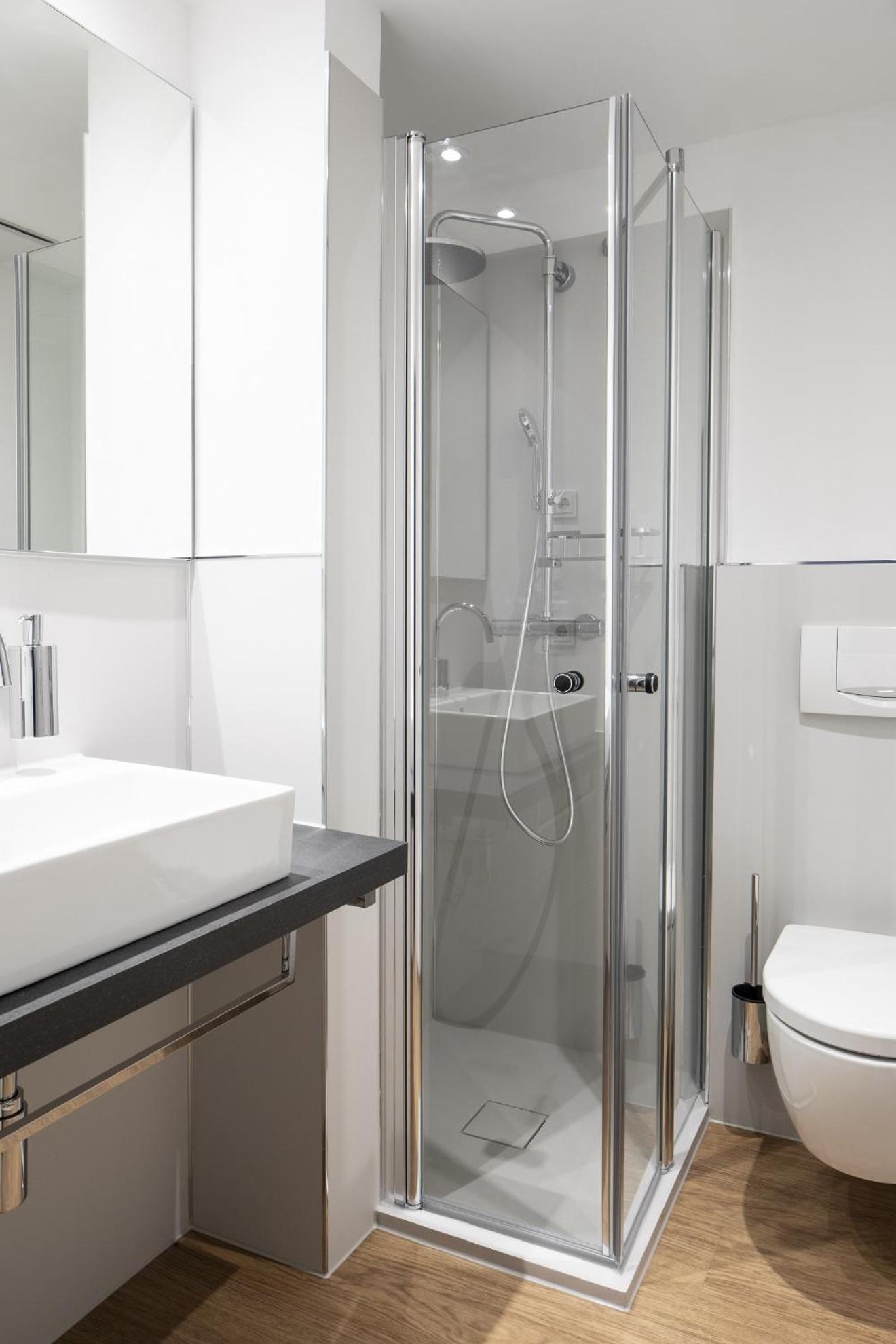 Bad und Dusche etwas beengt, hätte man im Verhältnis zur Gesamtgröße des Apartments etwas größer gestalten können, ohne gravierende platzprobleme in anderen Räumen in Kauf zu nehmen.