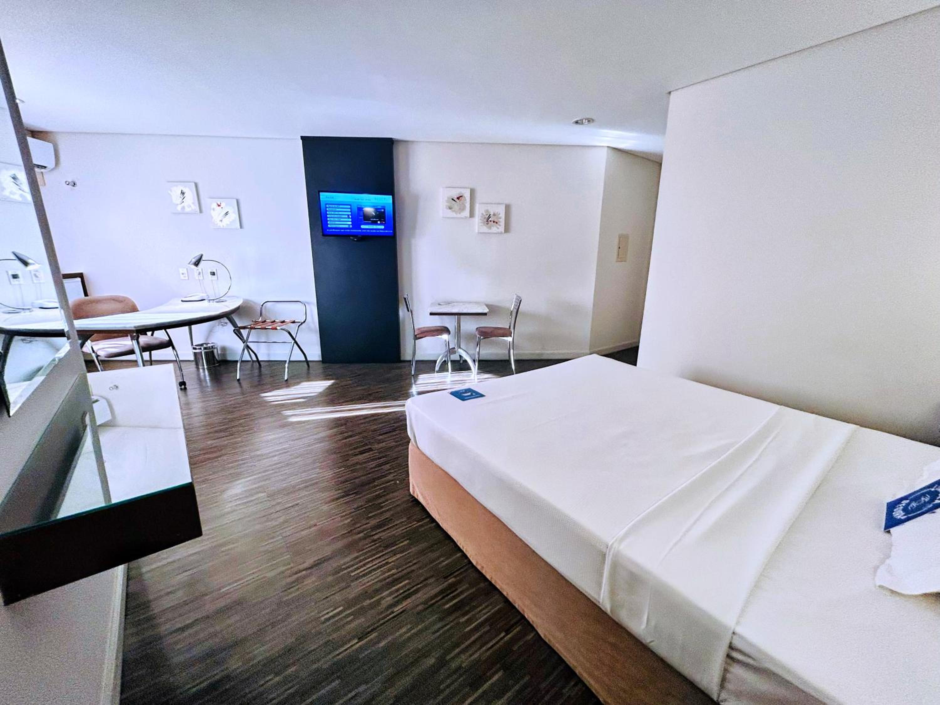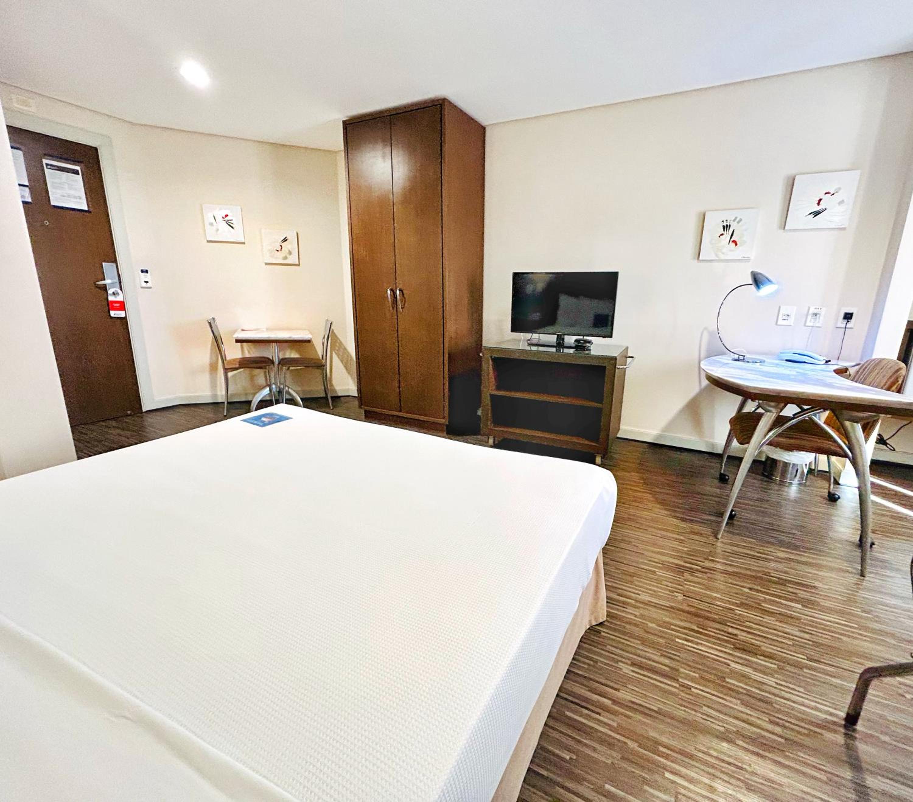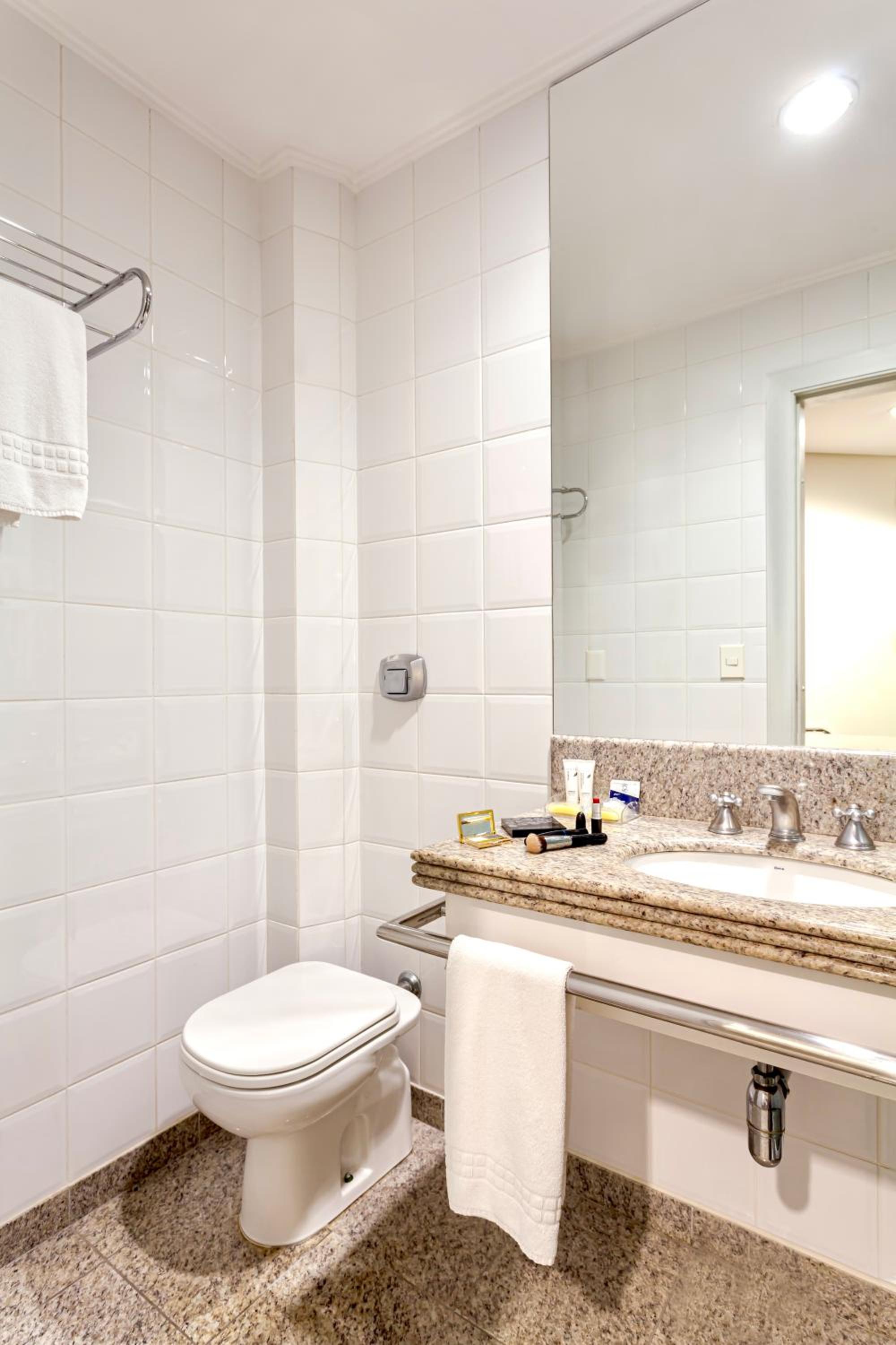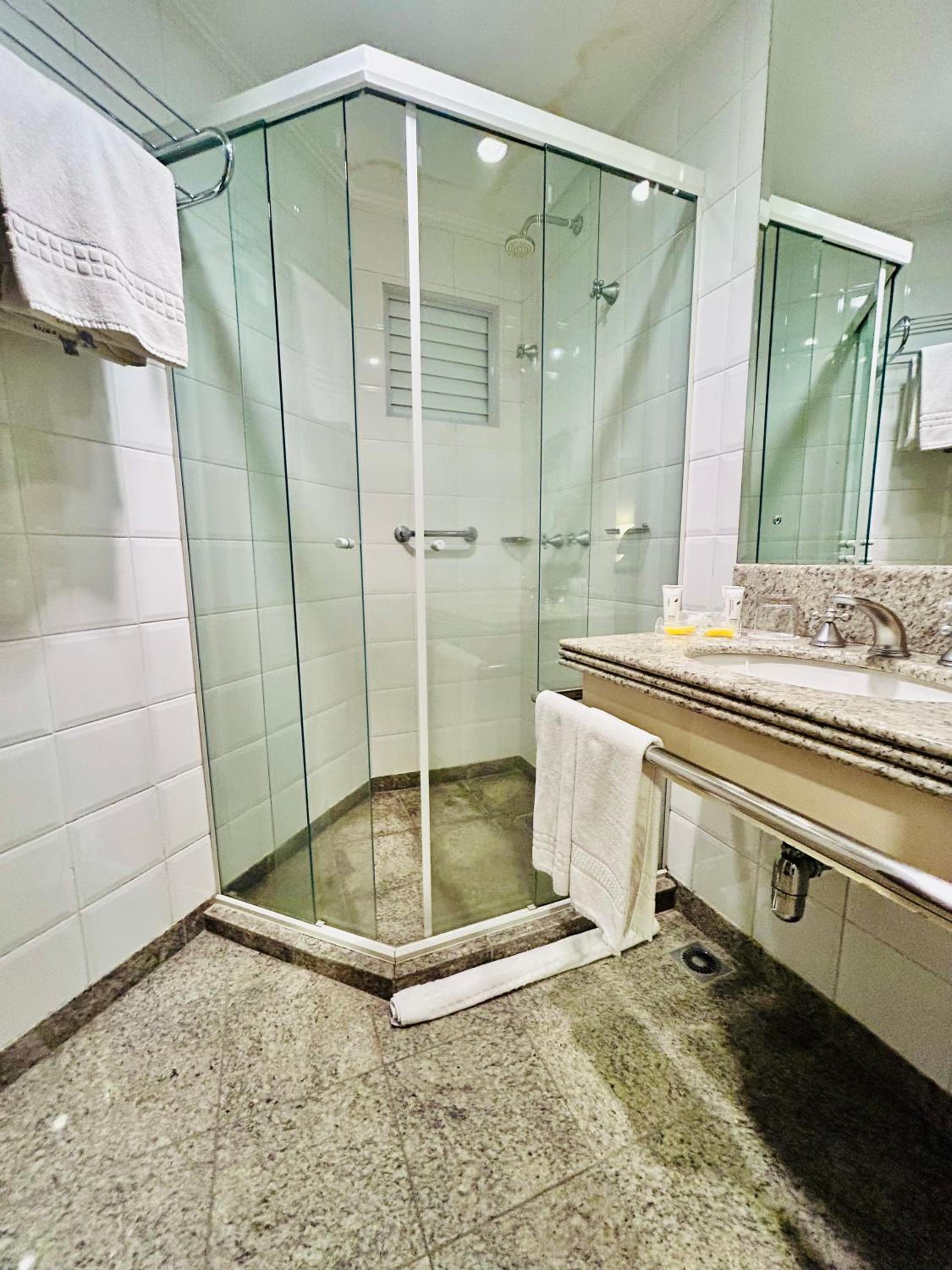 Localização excelente, no centro. Quarto amplo, limpo. Banheiro um pouco apertado, chuveiro bom. Café da manha bom.