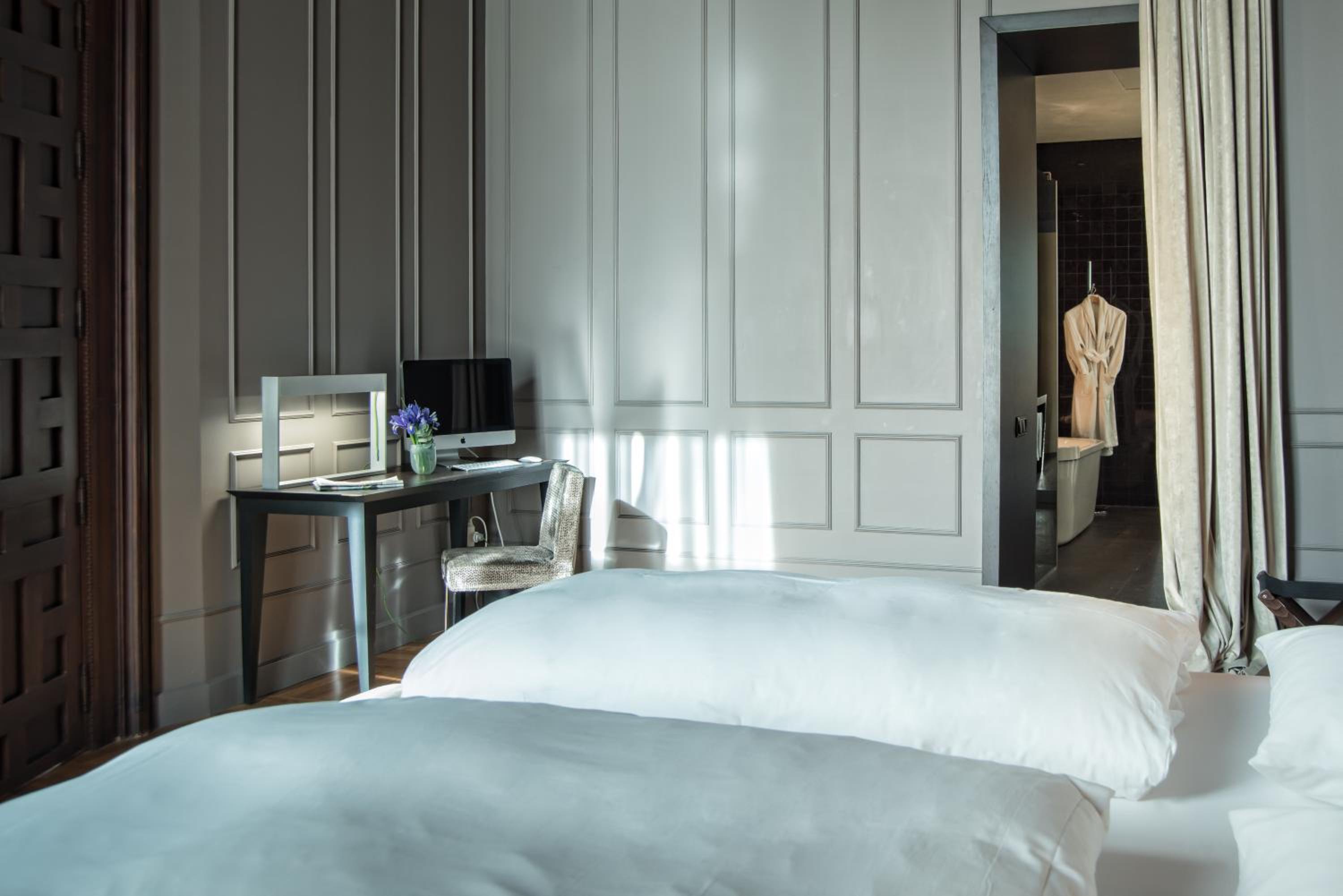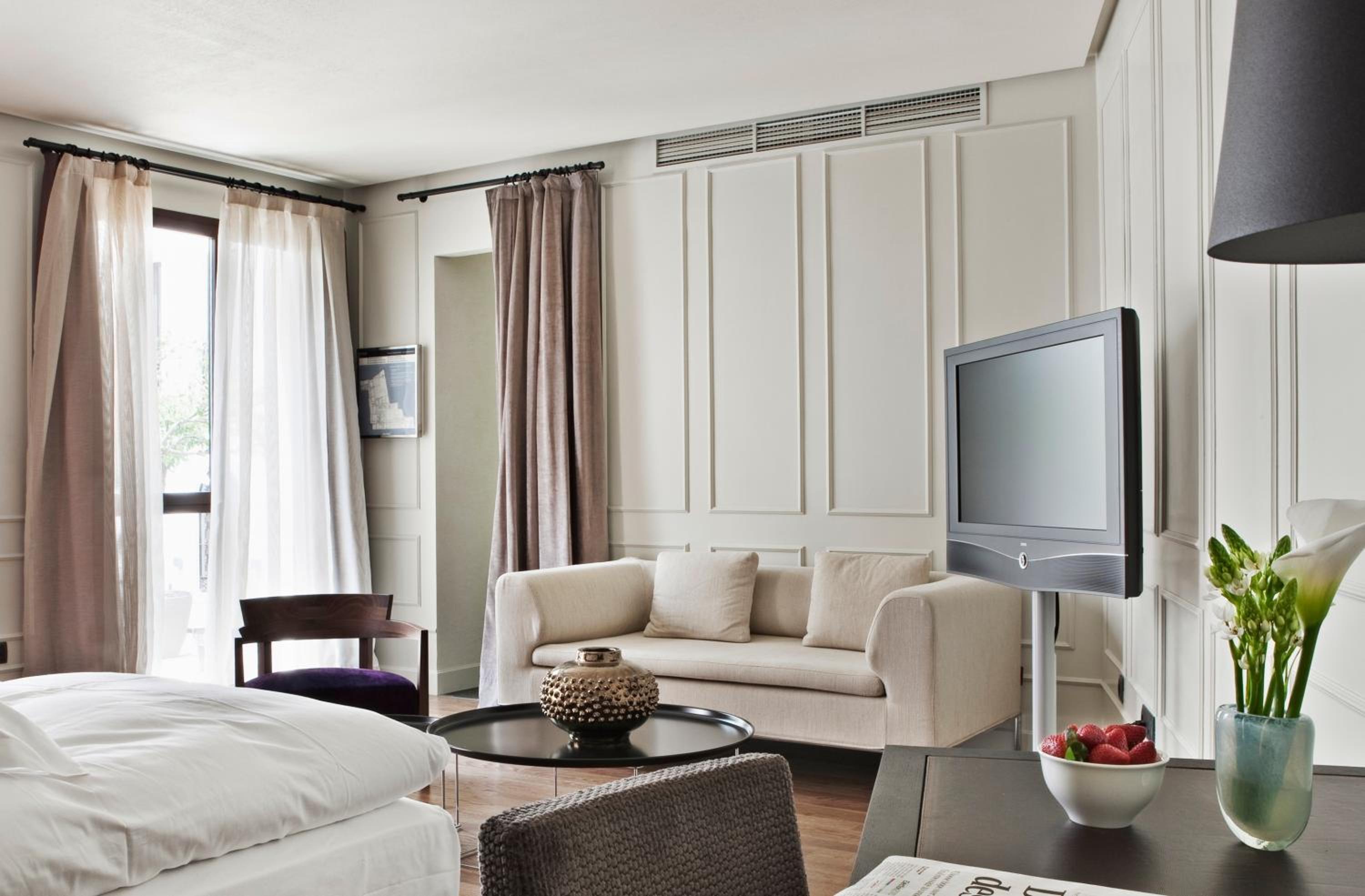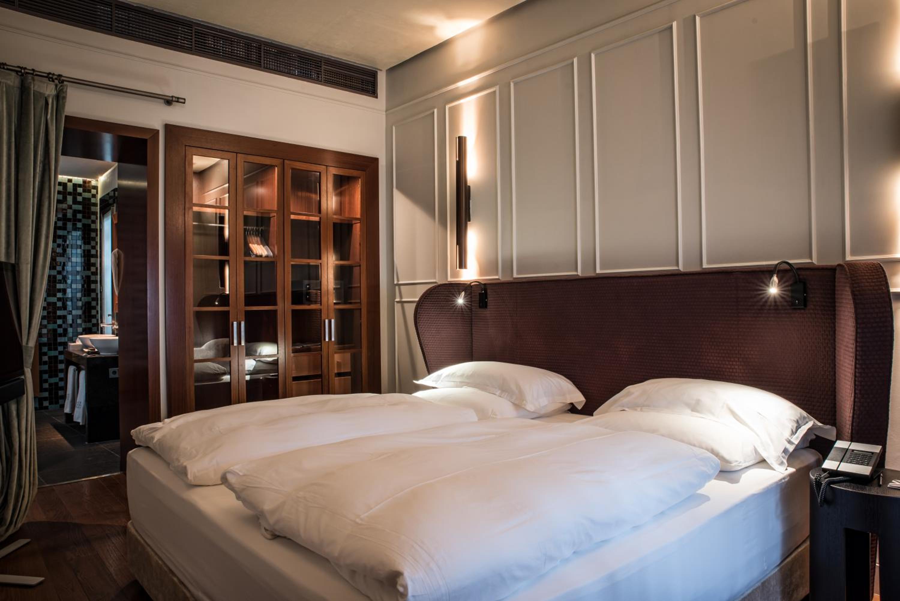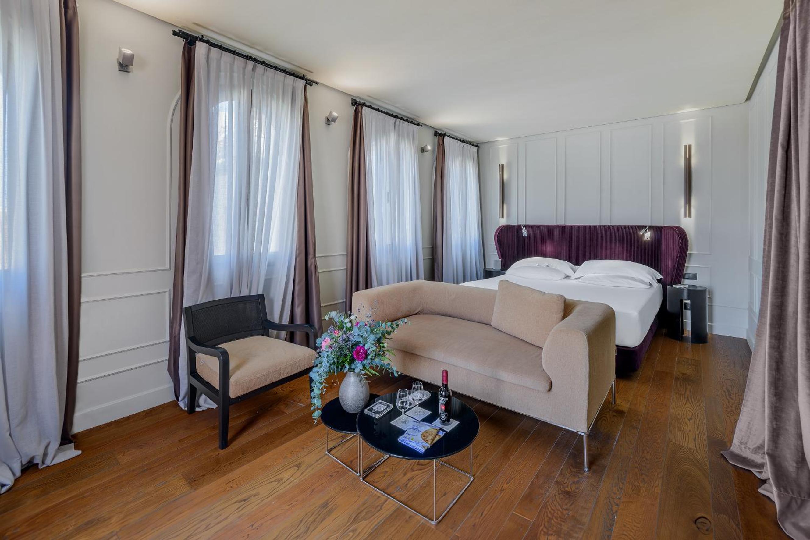 Elegant Rooms with Modern Amenities: Experience a blend of historic charm and contemporary comfort in the spacious rooms equipped with satellite TV, air conditioning, and luxurious bath amenities.