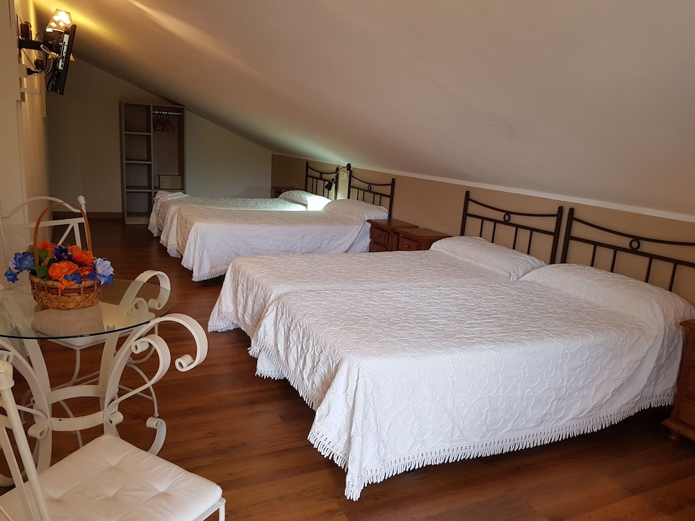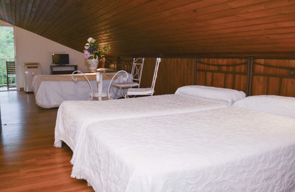 La habitación era amplia en un entorno en plena naturaleza, aunque era abuhardillada y apenas tenía luz natural y el baño era muy pequeño. Para ir al pueblo había que coger el coche. Hay dos hoteles igual muy cerca y al principio la reserva nos dirigió al que no era el nuestro, donde había una mujer un poco antipática. En el que era el nuestro de verdad, el trato fue mejor.